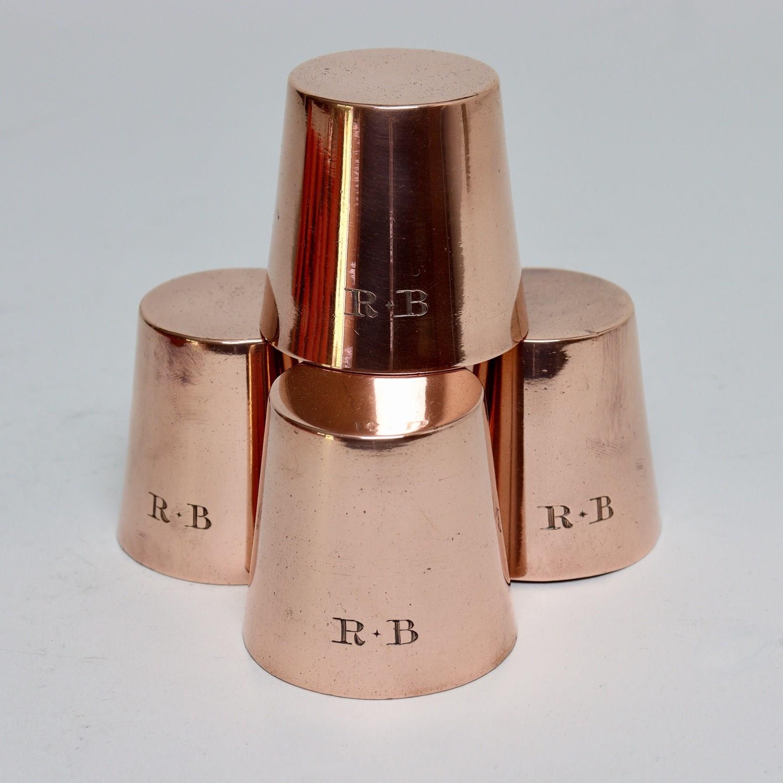 A set of four, miniature copper dariole moulds. These are English, they are made from a heavy gauge of copper and they date from c.1880. Each mould is nicely engraved with the initials “R.B” and these would be the initials of a previous owner. They are all in very good condition and the tinning, although grey, is still in usable condition.