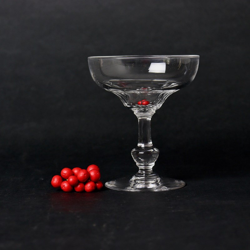 A set of four, nice quality, French crystal champagne coupes. Thee are made from a fine crystal and they date from c.1900. They have an interesting, geometric cut to the underside of the bowls and the stems are a low, baluster form. They are all in very good condition.