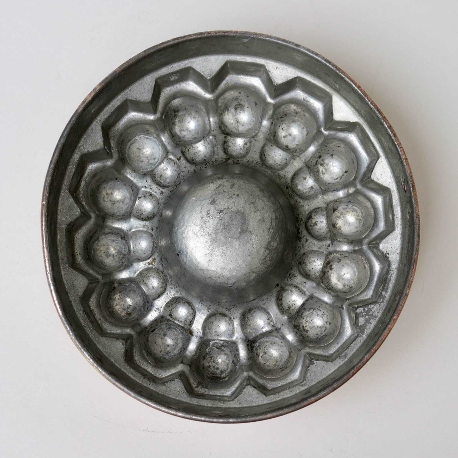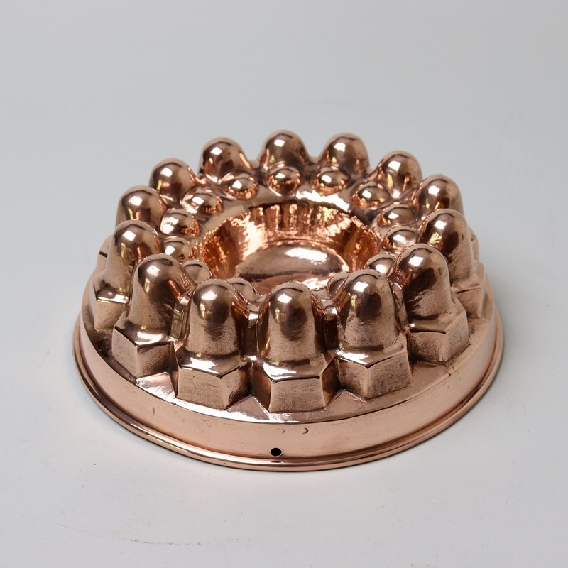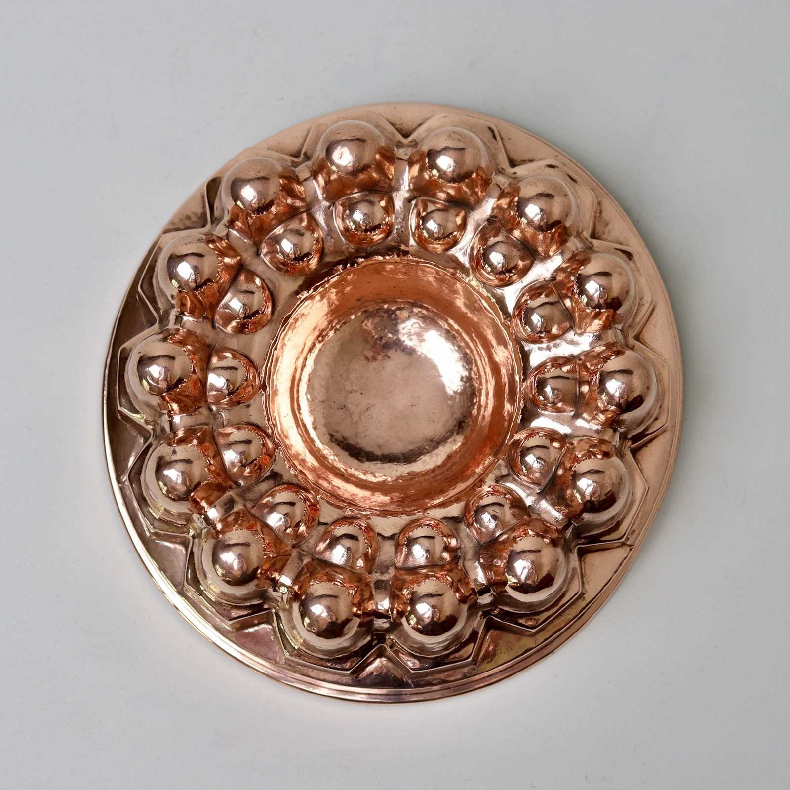 A late 19th century, French copper, fancy border mould. This is made from a heavy gauge of copper and it dates from c.1890. It has a rolled rim and there is a small hole in the rim where a fitting for hanging has been removed from. The design is quite complex and displays well either hanging or on a shelf. It consists of fourteen small, dome topped columns with cog shaped bases and within the outer ring there are further domes around a sunken centre. The mould is in excellent condition and the tinning, to the interior, is still in very good, bright, usable condition.