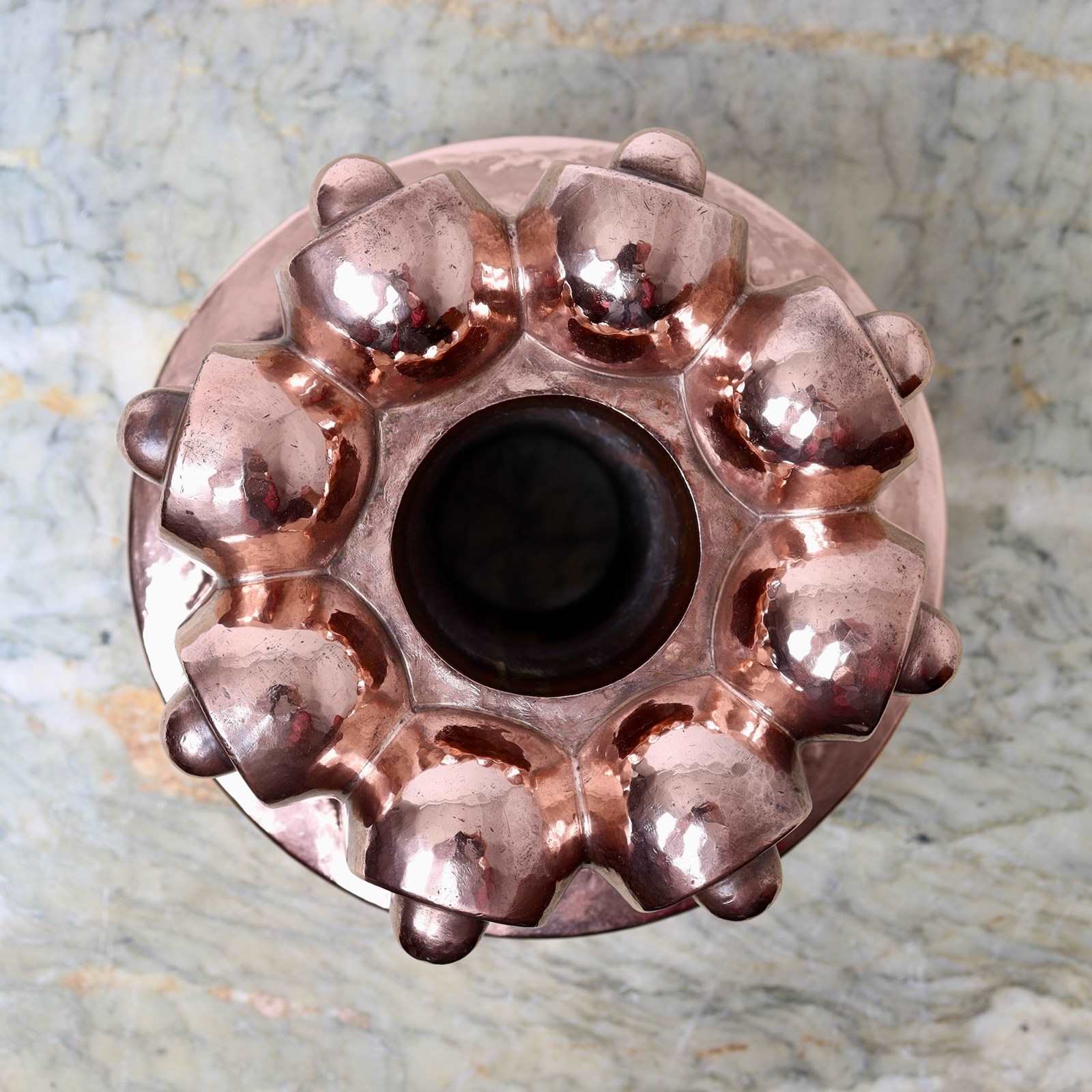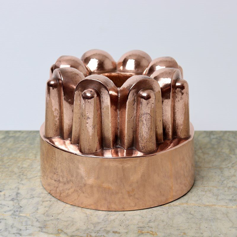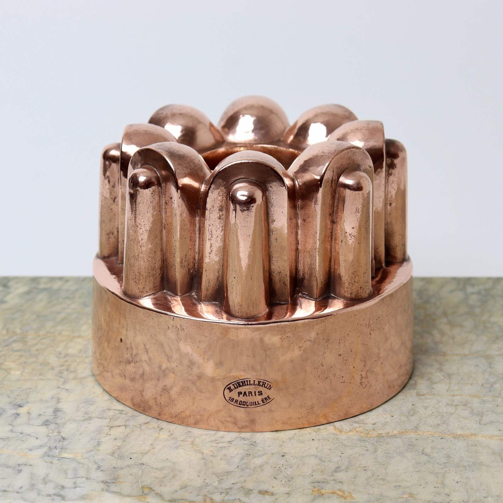 A large, 19th century, French copper mould. This is marked “E. DEHILLERIN PARIS 18 R. COQUILLIERE”. It is made from a very heavy gauge of copper and it dates from c.1870. The design consists of eight small, rounded topped columns, surrounded by larger columns, all around a central pipe. There is slight marking to the copper but the mould is in very good condition. The tinning, to the interior, is worn.