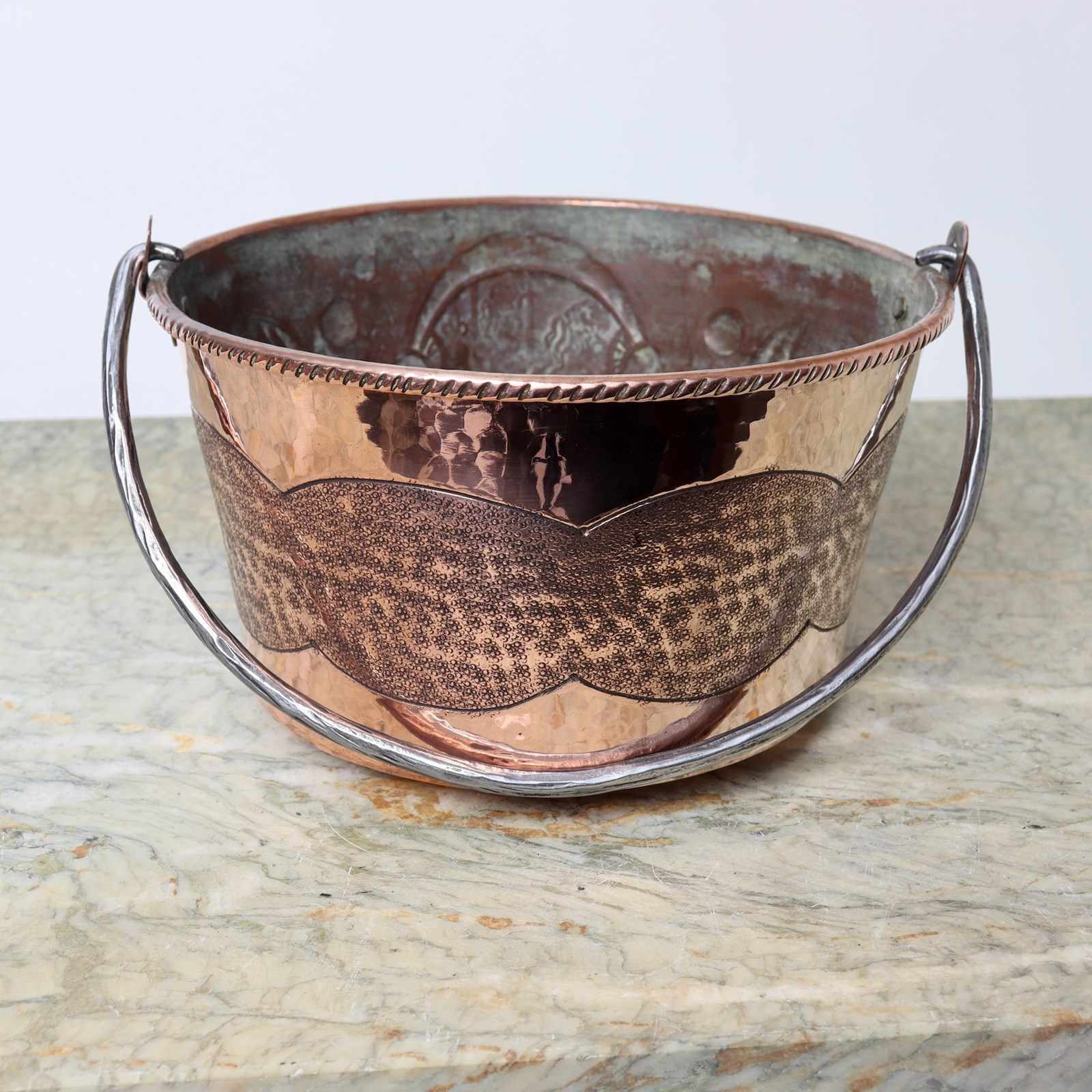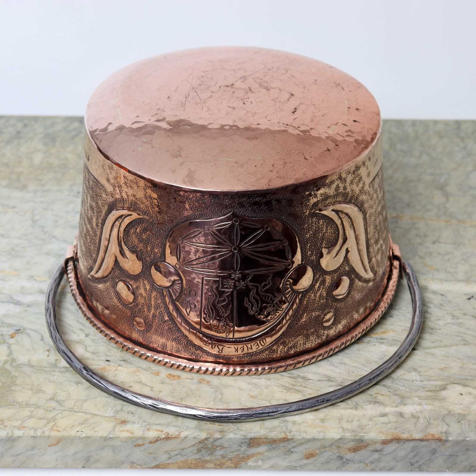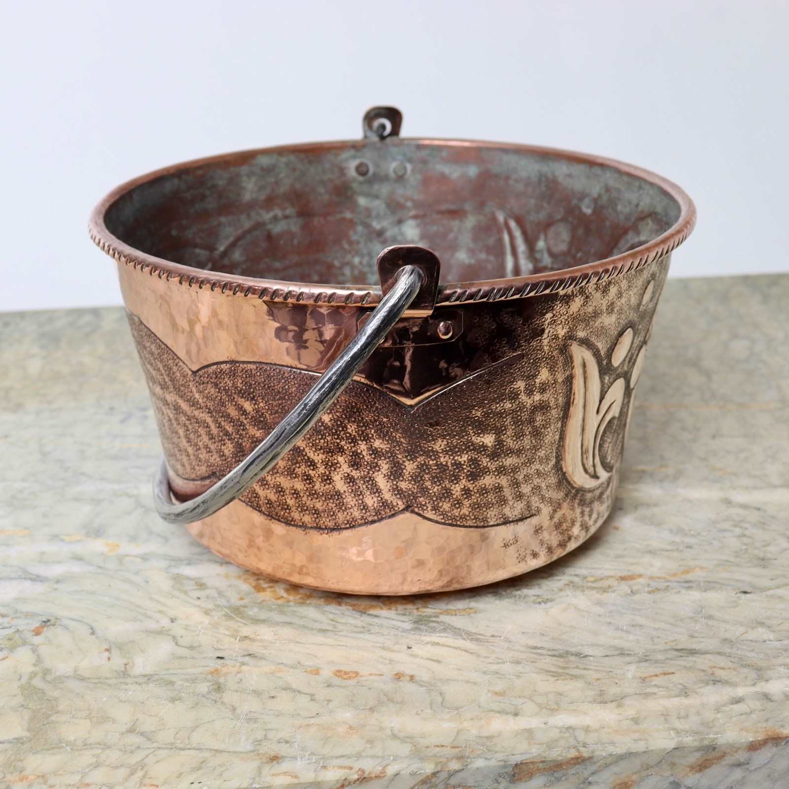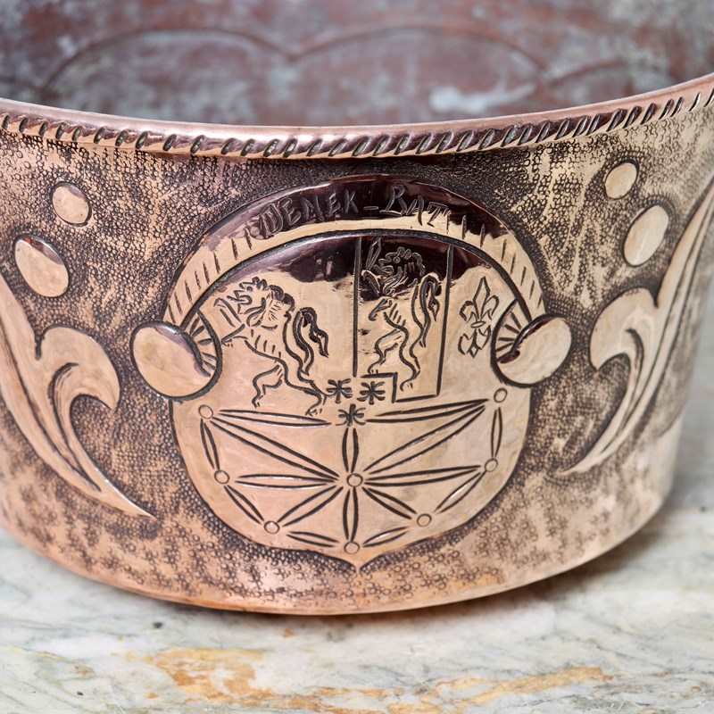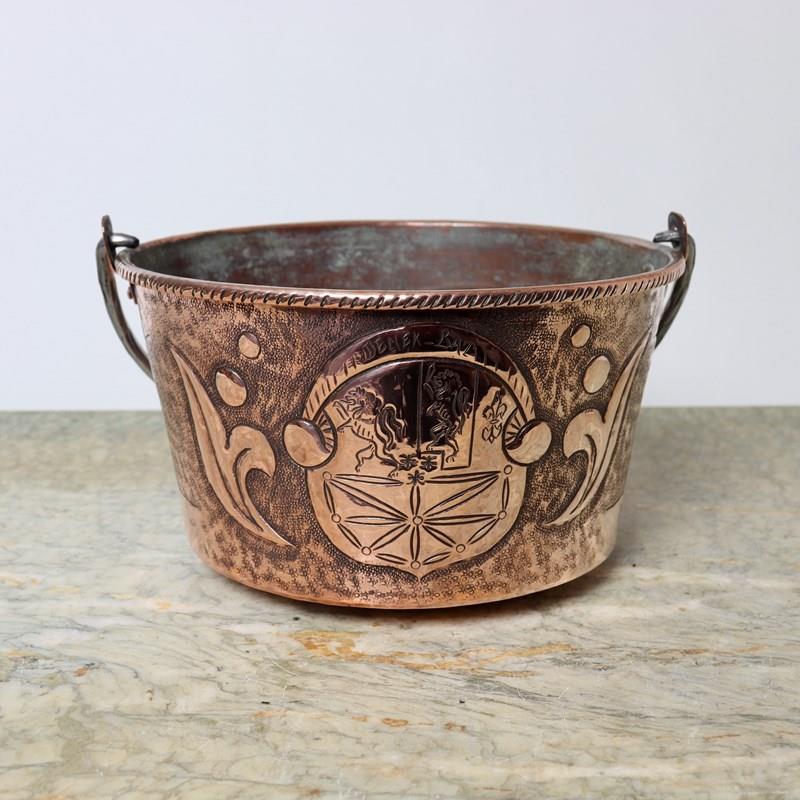 A vintage, French copper hanging pot with a folding steel handle. This is signed “R. Boisan”. R. Boisan was an artisan French coppersmith who used embossed and hammered techniques to produce his designs which are often associated with the Arts and Crafts movement. This piece dates from c.1930. The design features a family crest which incorporates the words “DEMEK BAT”. The piece is in very good condition, although the interior is quite discoloured. It would make a lovely hanging jardiniere for a plant.