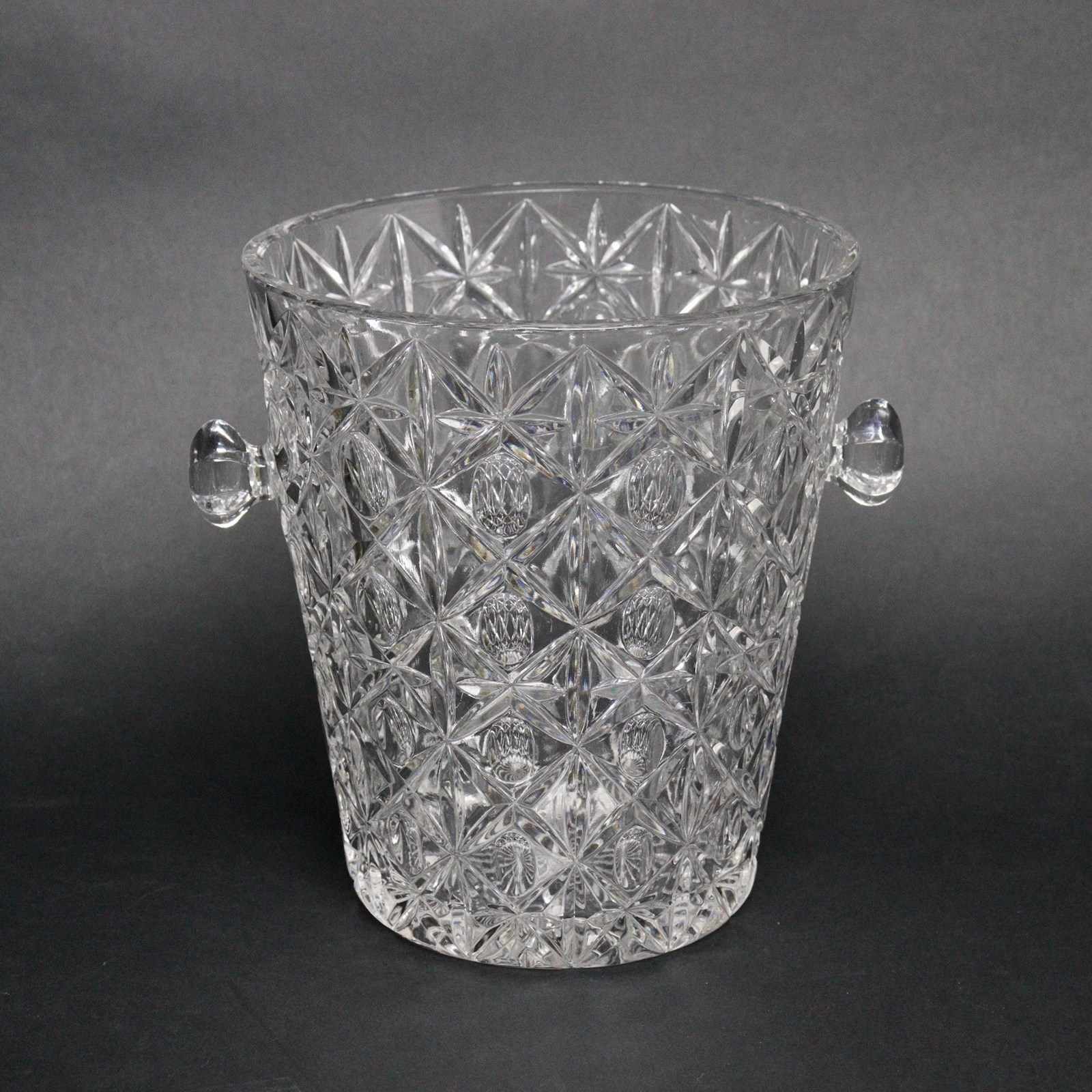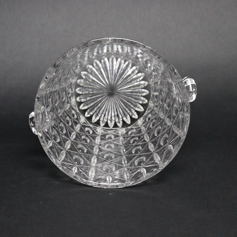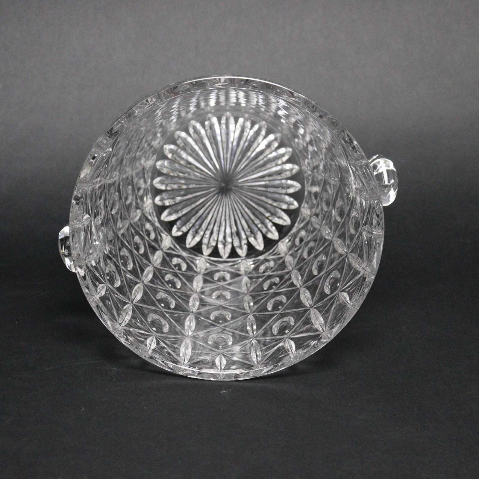 A French crystal wine or champagne cooler. This is made from a very heavy, good quality crystal and it dates from c.1940. The design is very busy, consisting of ovals within starbursts and it has small, hexagonal handles. It is in excellent condition.