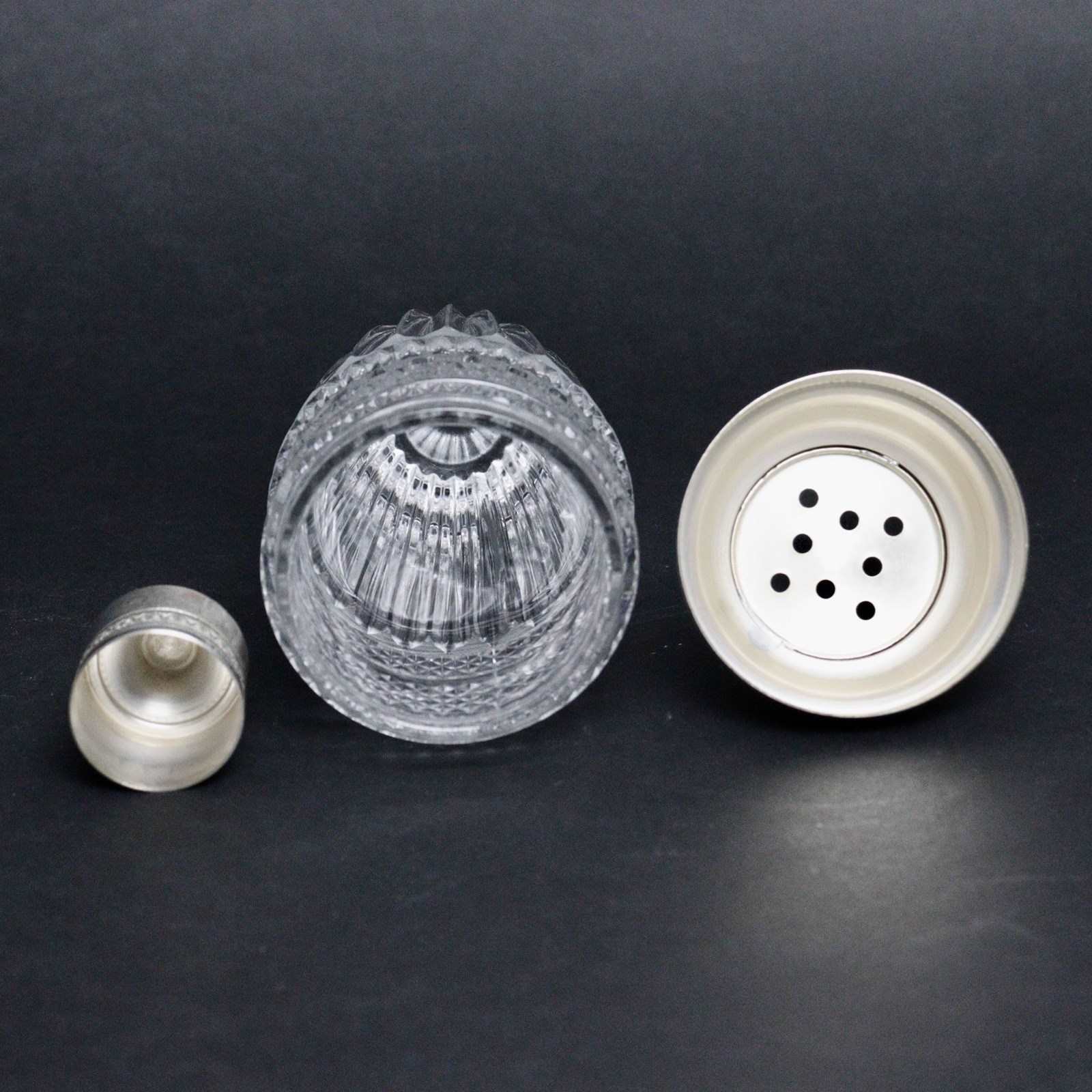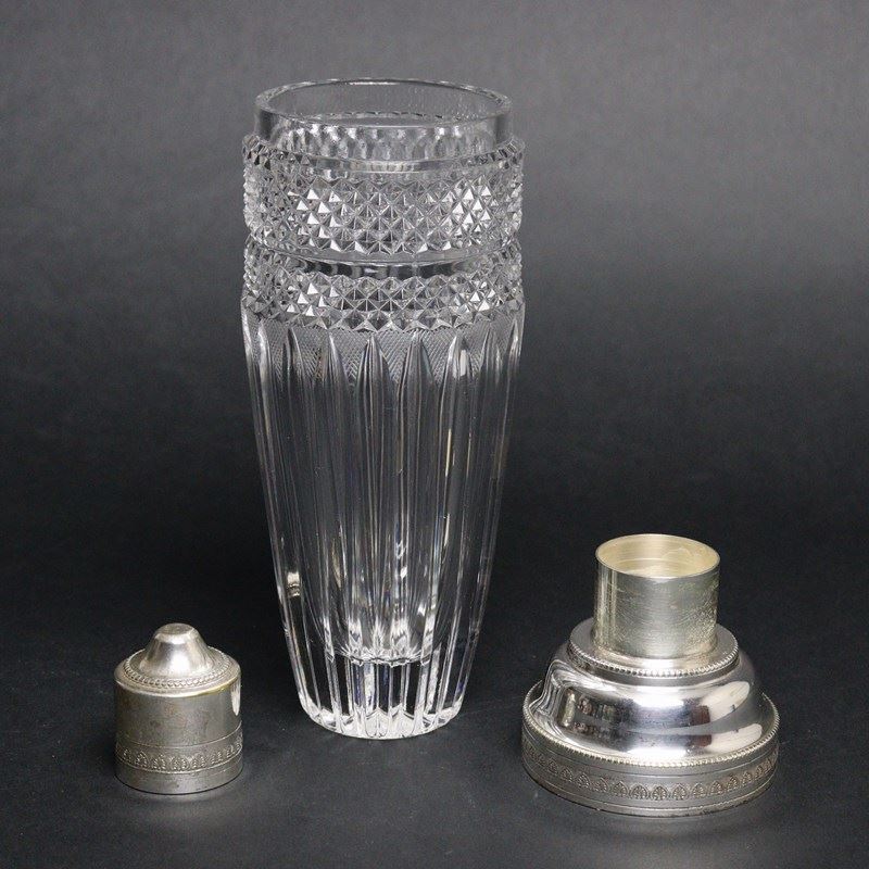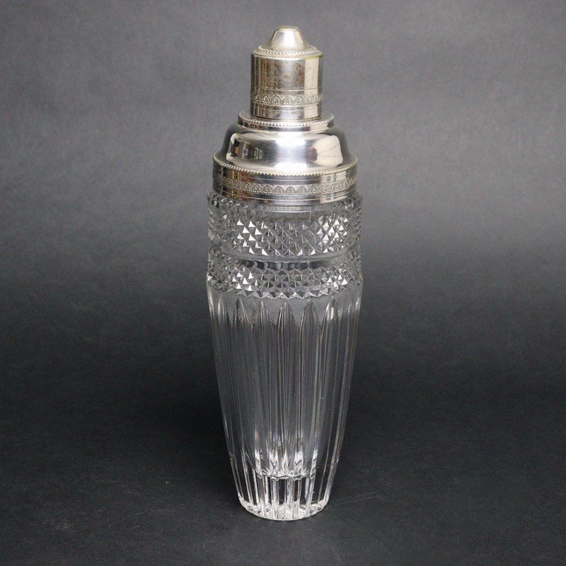 A super quality, large, French crystal cocktail shaker with silver plated mounts. This is made from a very heavy crystal and it dates from c.1910. The crystal has two bands of a diamond cut to the top section above a long elliptical cut to the lower section. The silver plated mounts are also nicely decorated with bands of beading and a very classical border design. The mounts are showing very slight signs of wear but generally the piece is in very good, usable condition.