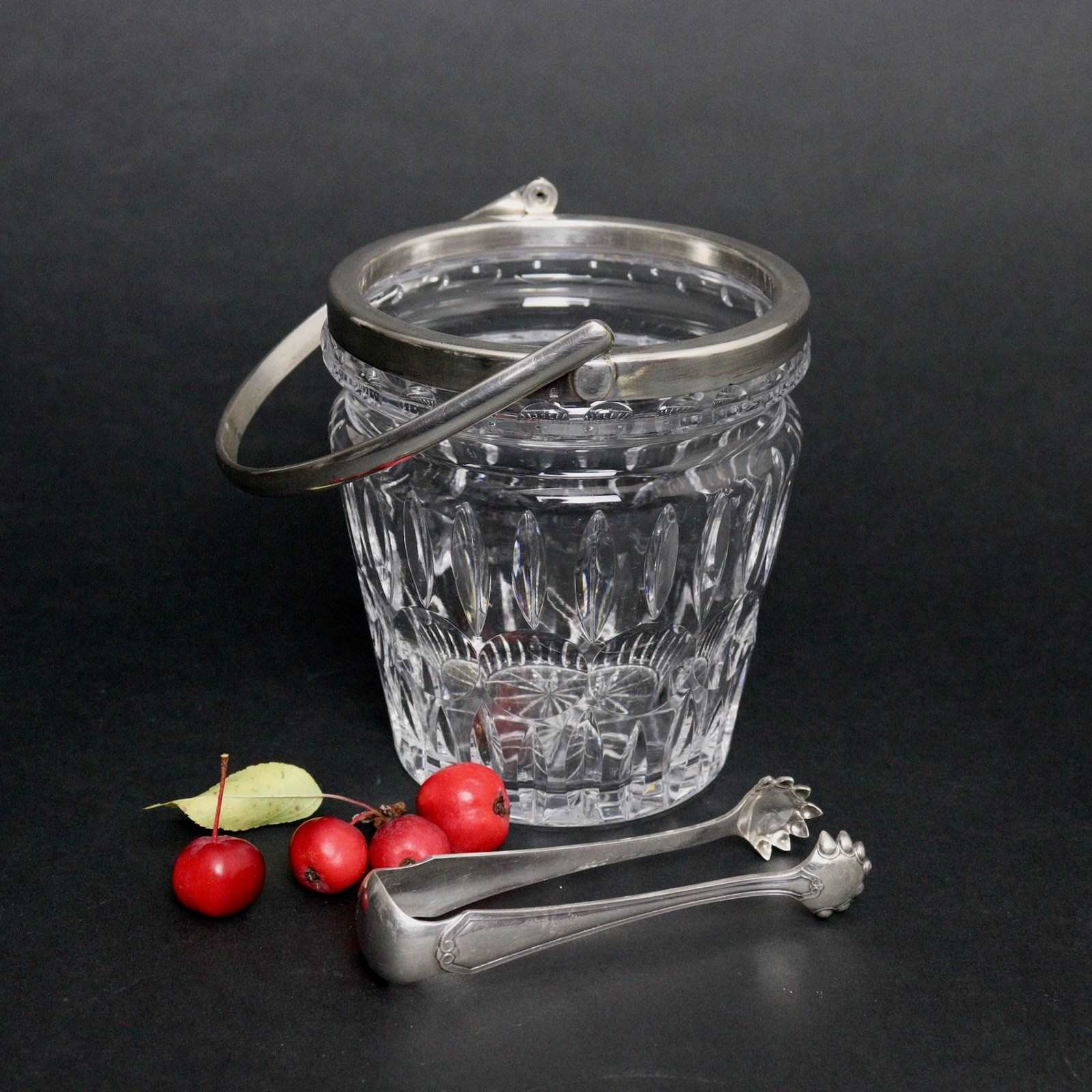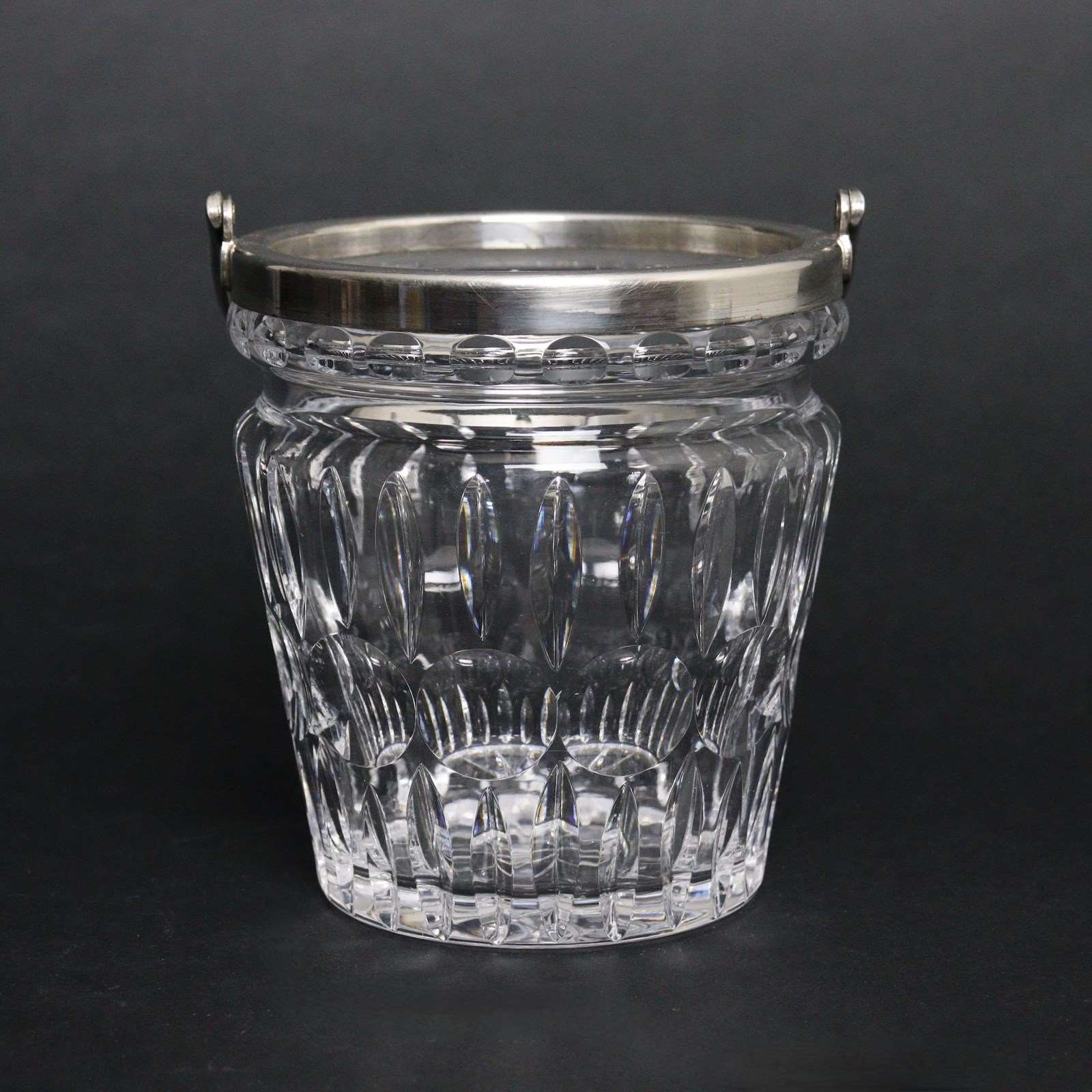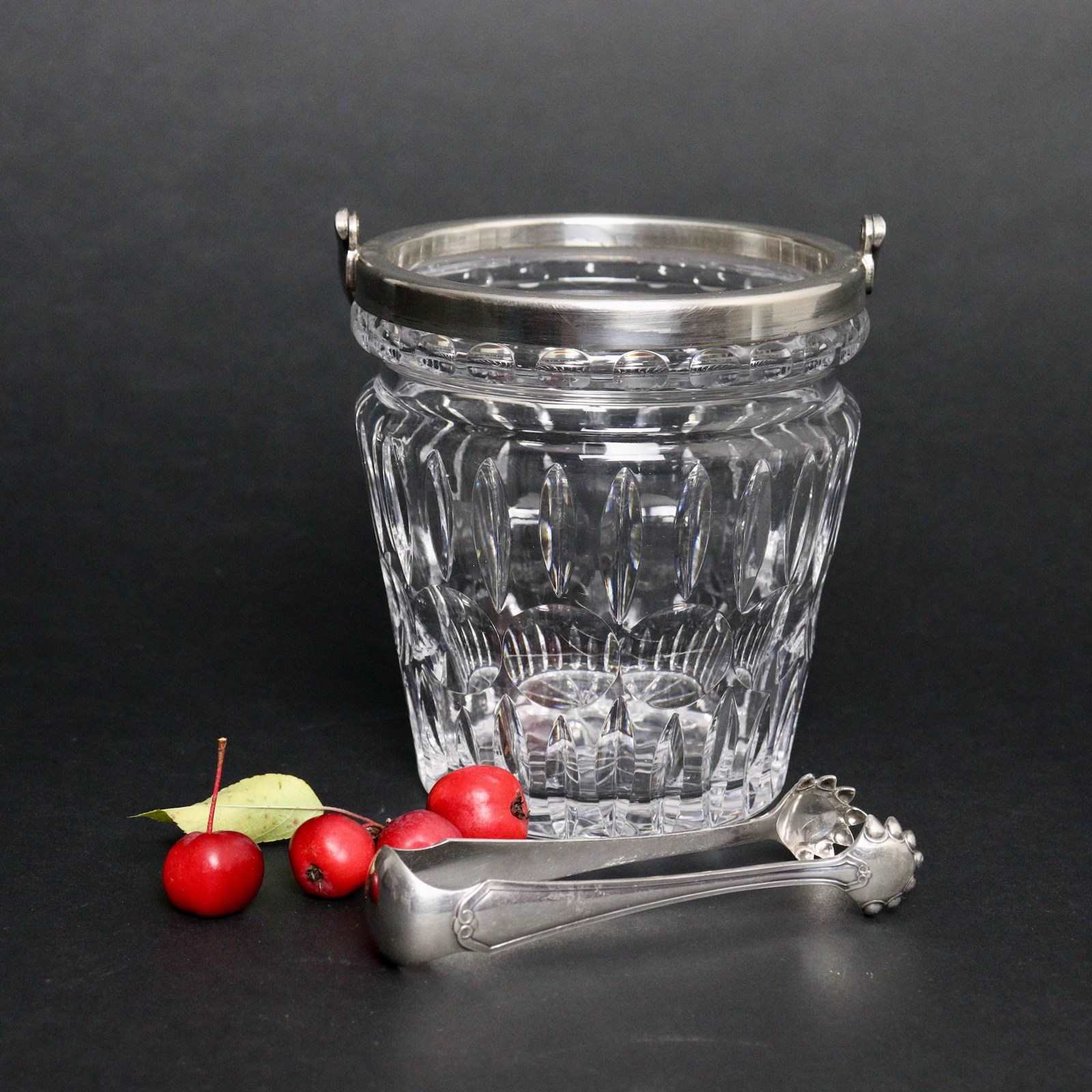 A nice quality, French crystal ice bucket with silver plated mounts. This dates from c.1930. It has an attractive, cut design, incorporating circles and long elliptical shapes, which is typical of the Art Deco period. The piece is in excellent condition.