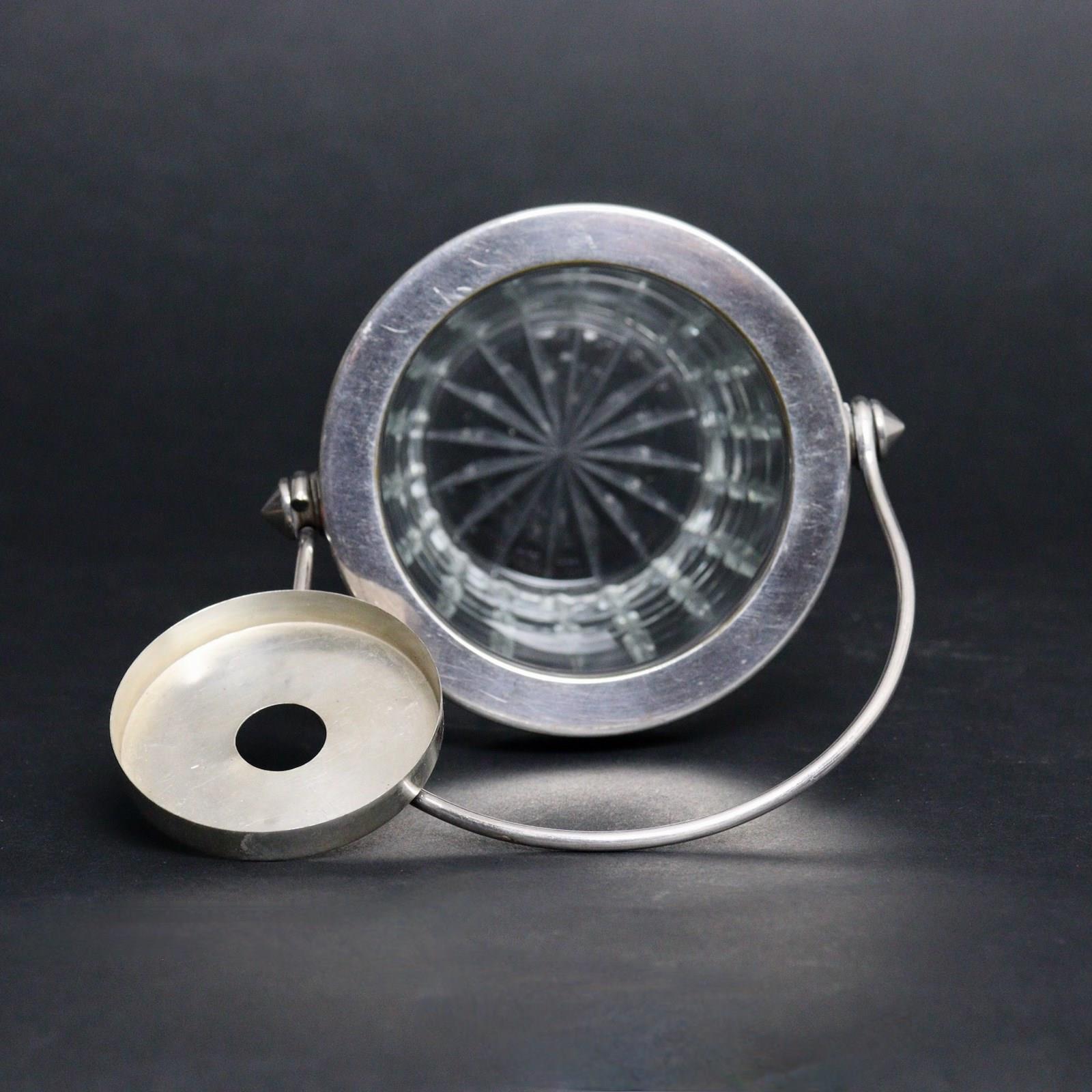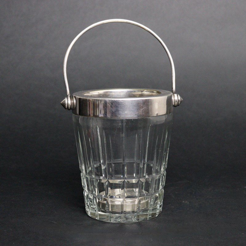 A nice quality, French crystal ice bucket with silver plated mounts. This dates from c.1930. It has a long, spear shaped cut which is banded to form large rectangular shapes. This design is very similar to one produced by St. Louis. The piece is in excellent condition.