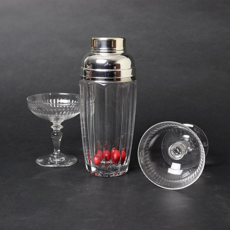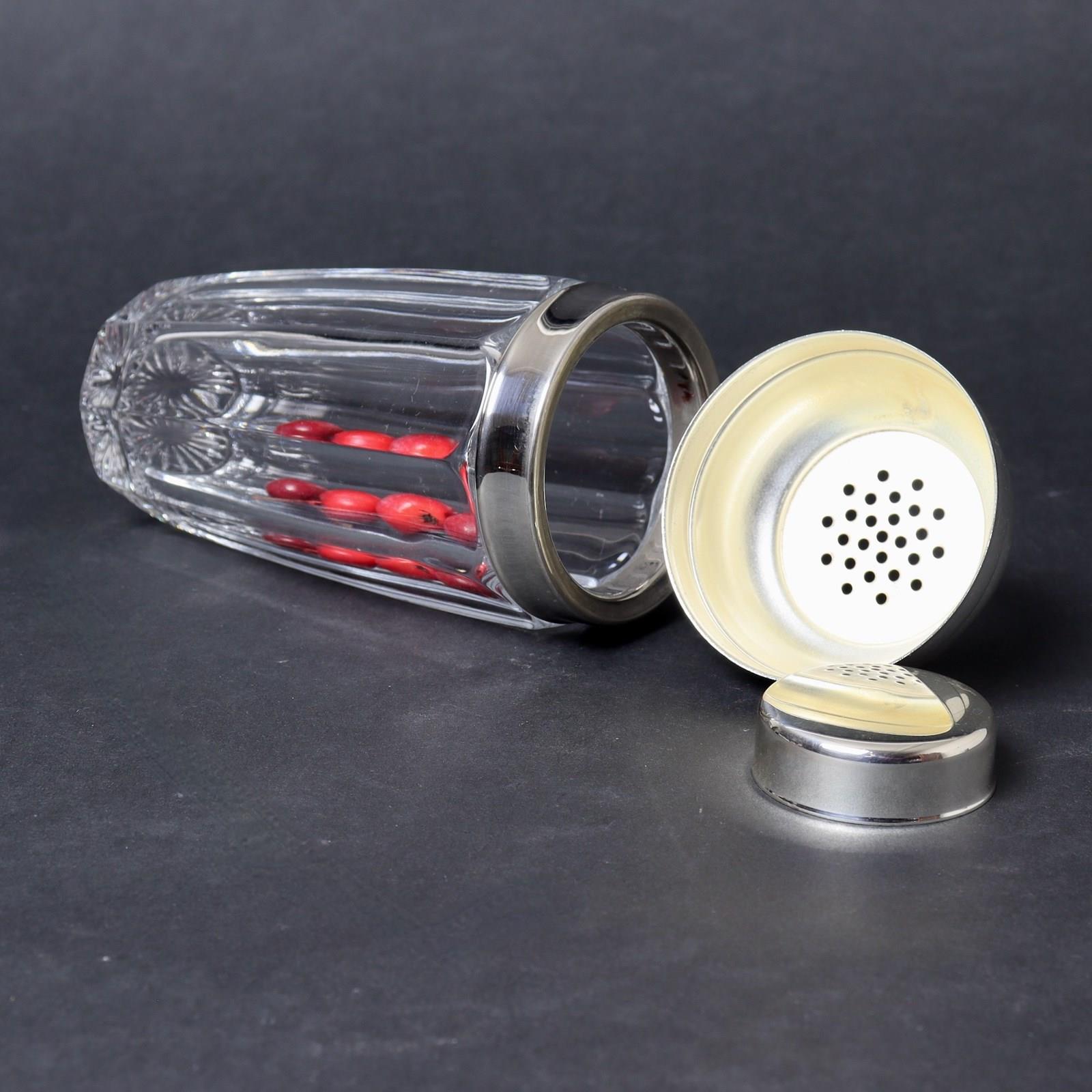 A French glass cocktail shaker with chrome plated rim and cover. This is a simple, 9 sided, moulded form and it dates from c.1950. It is in excellent, usable condition.