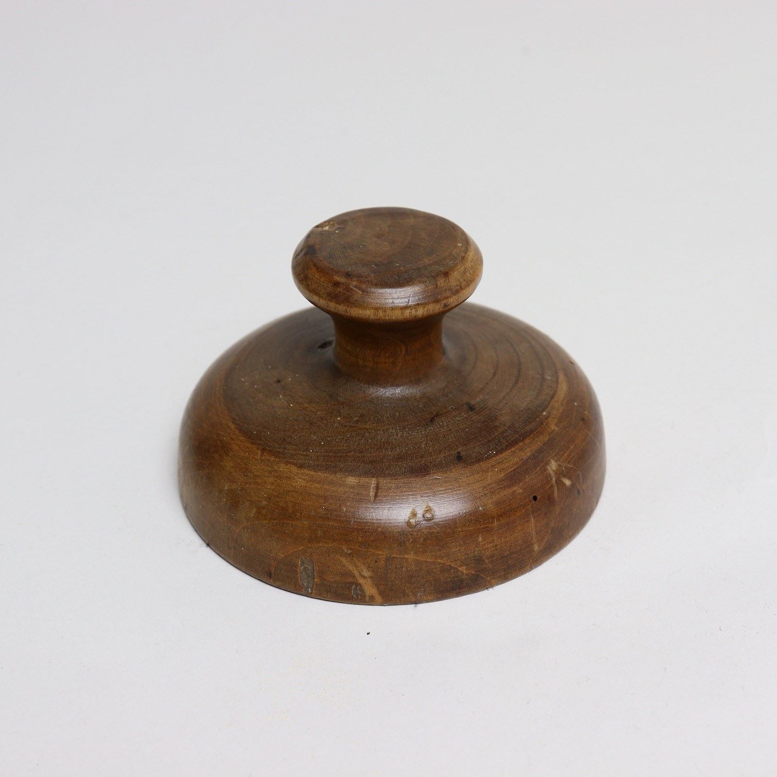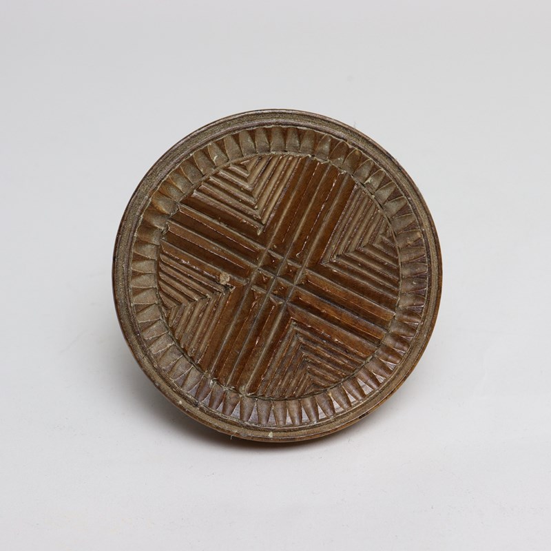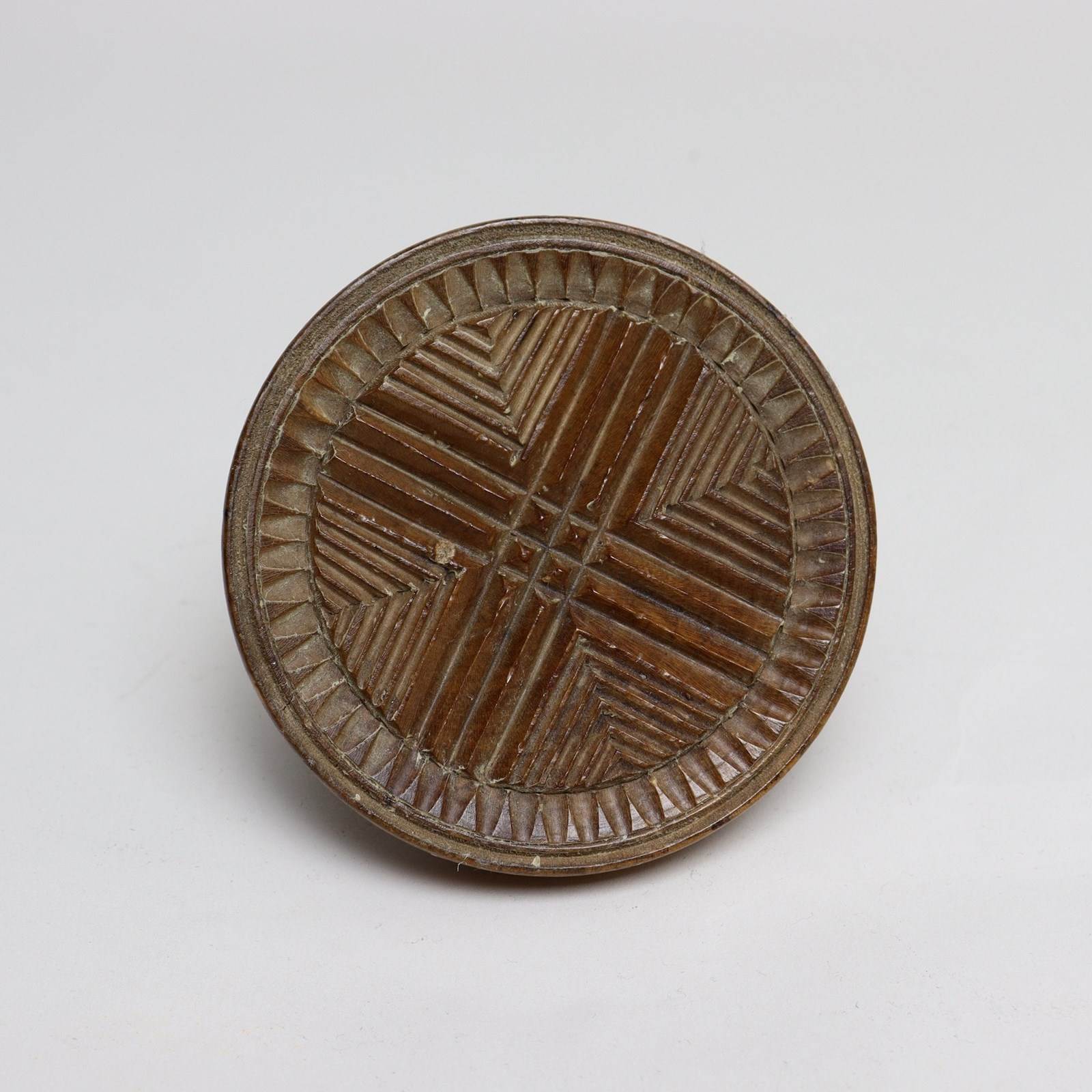 A large, 19th century butter print carved with a geometric design. This is well carved in beechwood. It is English and it dates from c.1840. The design would leave a good, deep impression on the top of a pat of butter. There is a small split in the handle and there are a couple of woodworm holes which have been treated. Otherwise it is in good condition and the wood has a nice, dark patina.