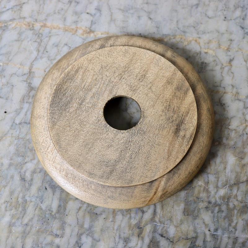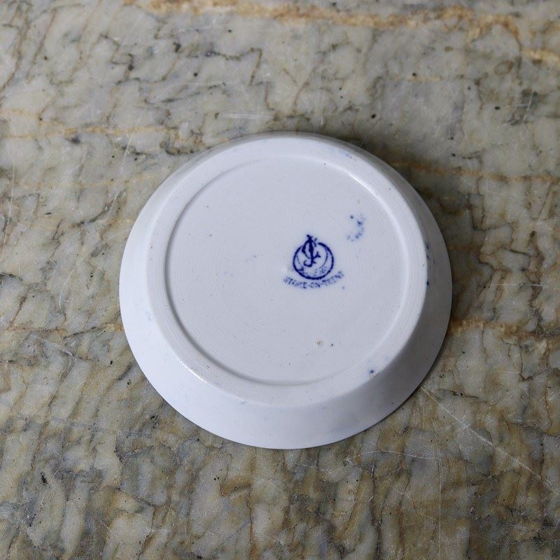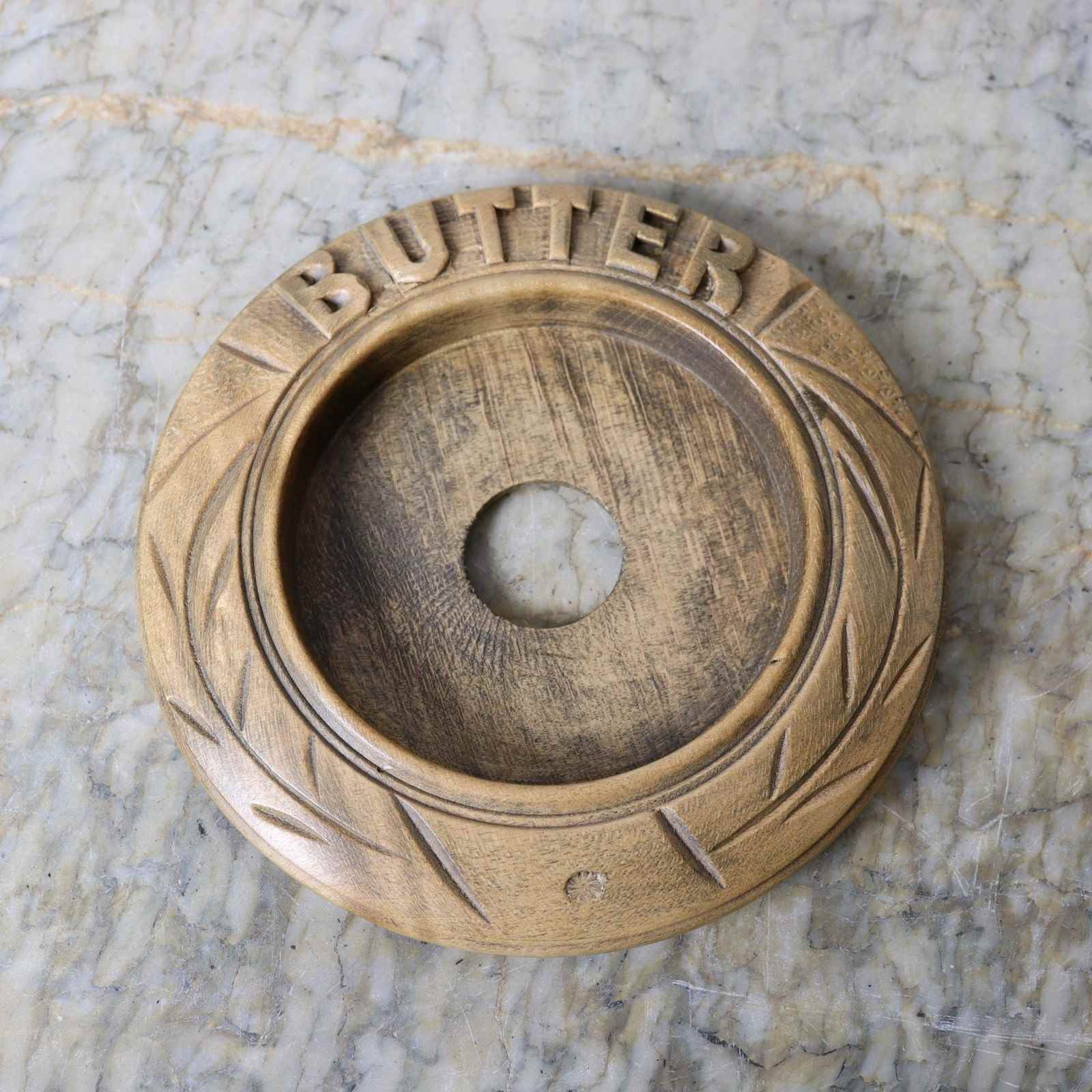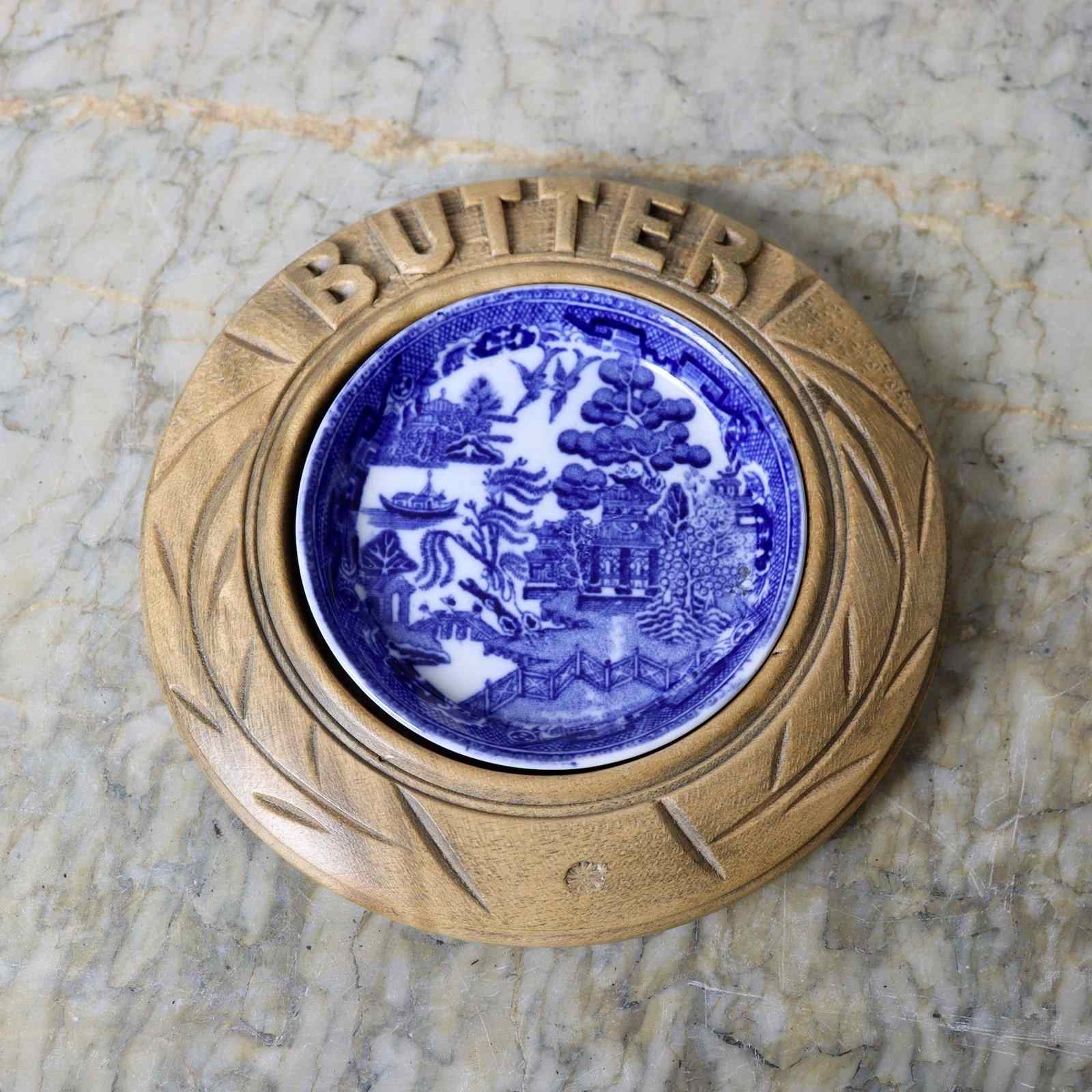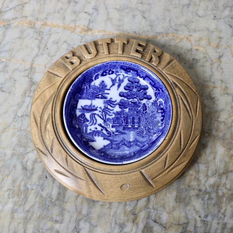 A late 19th century, ceramic butter dish with a carved wooden surround. The willow patterned dish is marked with a monogram of “GJ” within a crescent, above “STOKE ON TRENT”. This is the mark of George Jones and the piece dates from c.1890. The surround is simply carved, in beechwood, with “BUTTER” and long, stylised, scratch carved leaves. It is in excellent condition.