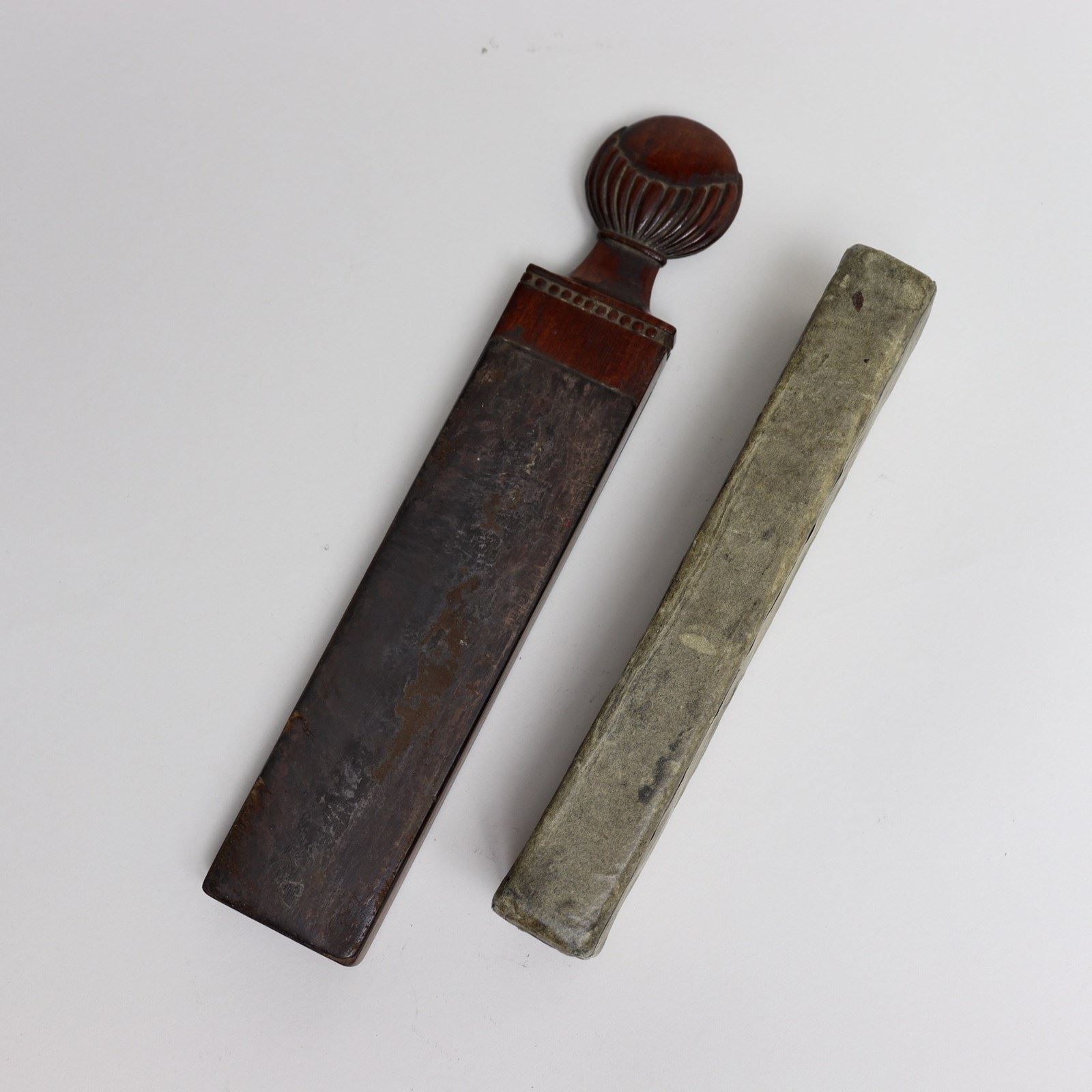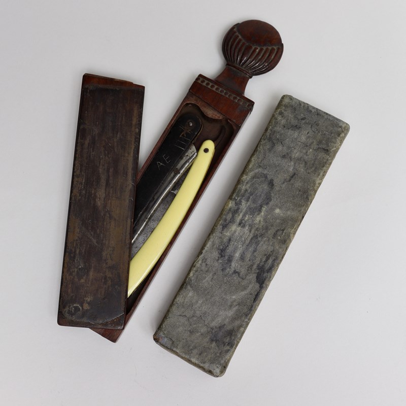 A lovely quality, Georgian razor case. This is beautifully carved in rosewood and it dates from c.1820. The wooden case is contained within an outer case, which is made from a thick card, and the exterior of the rosewood case has a strop on either side, for sharpening the razors. This comes complete with two razors and other than some graffiti on the horn handle of one razor, it is all in very good condition.