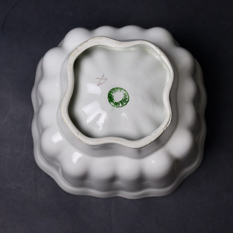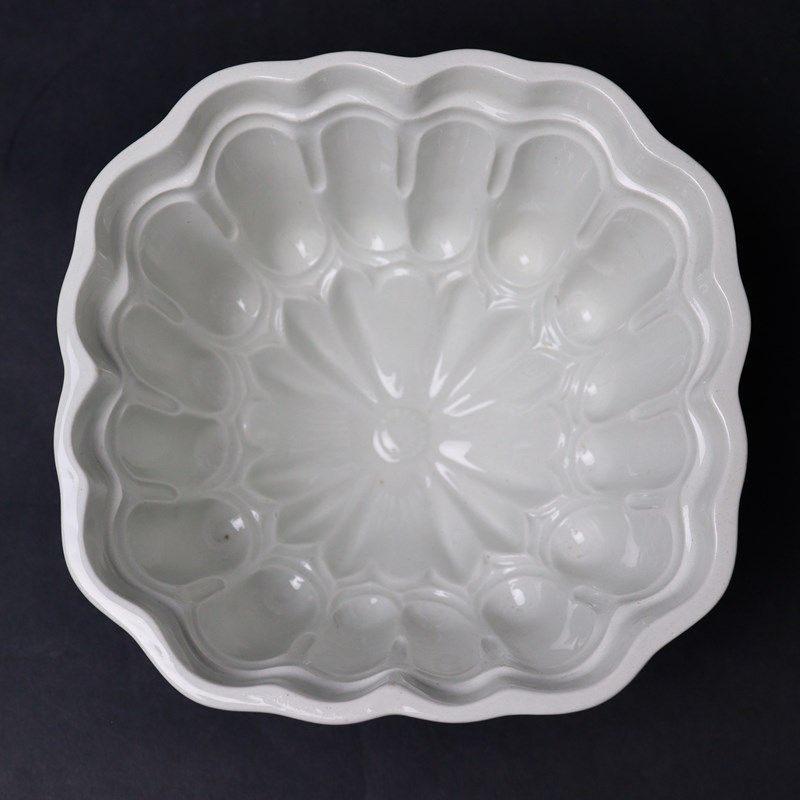 A nice quality, early 20th century, pottery jelly mould. This is marked, in green transfer print, “MADE IN ENGLAND”, within a circle. There is no manufacturers mark but it was probably made by Grimwades Pottery and dates from c.1920. The design is very attractive, with a sunflower to the top, and it would turn out very well. It is in excellent, usable condition.