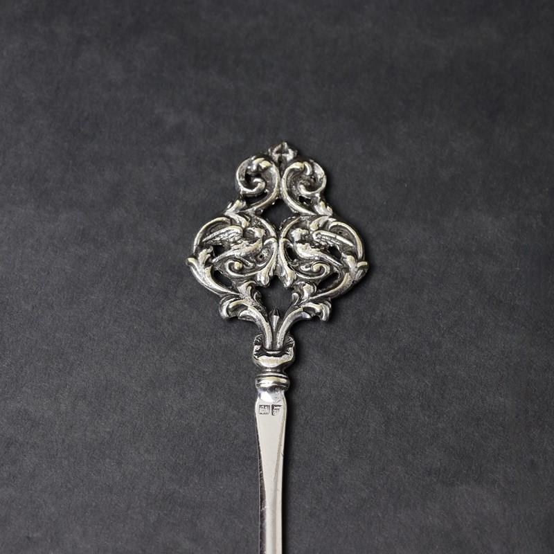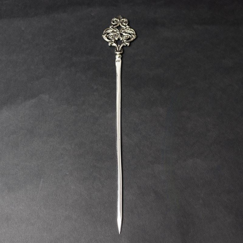 A French, silver plated hatelet skewer. The design to the end of this skewer is very classical, with birds within scrolls and flowers. It dates from c.1880. There is a makers mark close to the ornate end and this can be seen in one of the images. The skewer is in excellent condition.