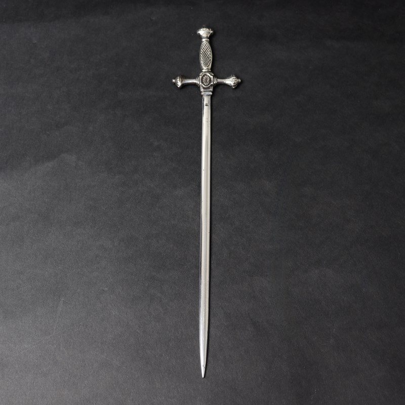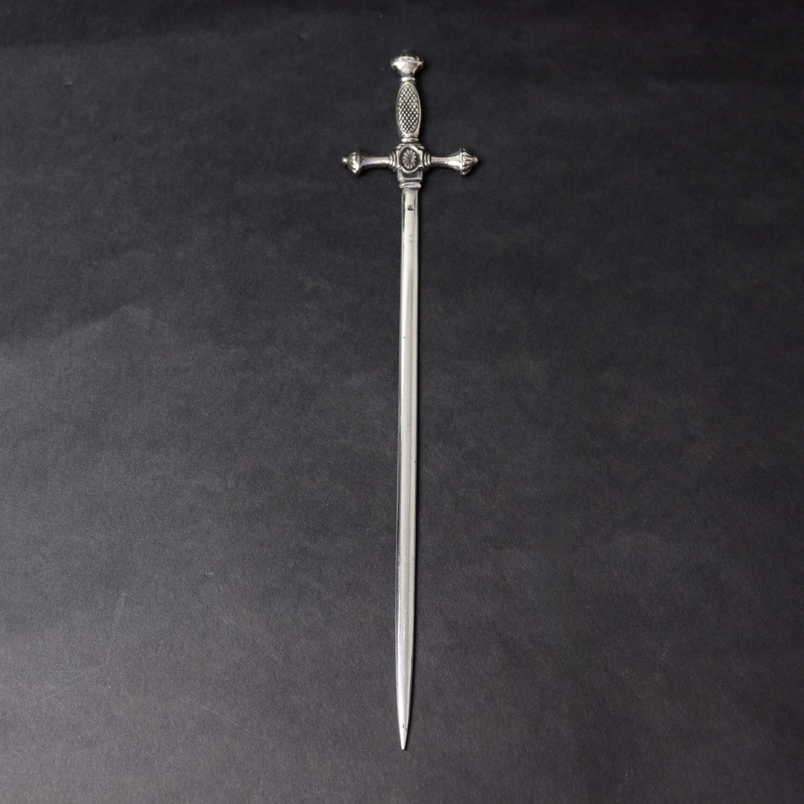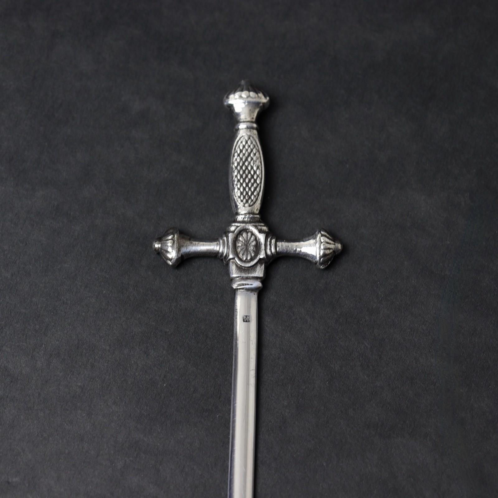 A French, silver plated hatelet skewer. The ornate end of this skewer is in the shape of a sword. It dates from c.1880. There is a makers mark close to the ornate end and this can be seen in one of the images. The skewer is in excellent condition.