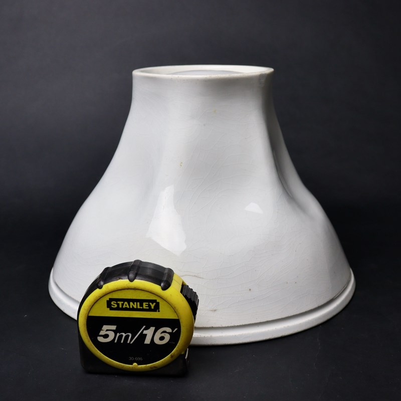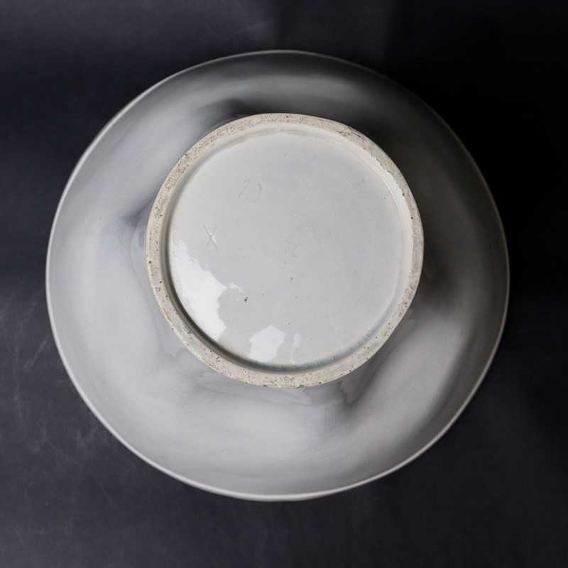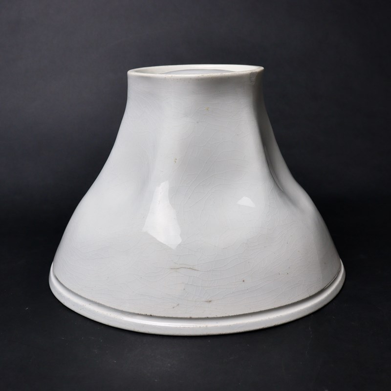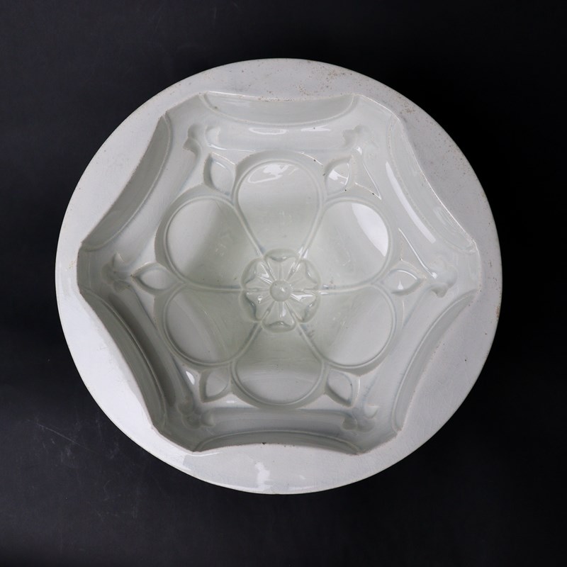 A huge, 19th century, pottery jelly mould. Although this does not bear a manufacturers mark, it was made by Minton and it dates from c.1850. There is a number “10” incised in the base. The design consists of a small, stylised flower to the top surrounded by large petals which cover the side of the mould. This is a very attractive design, quite deeply moulded, which would turn out well but the mould would take a lot of jelly. A small chip, on the rim off the base, has been restored but otherwise the mould is in good condition.