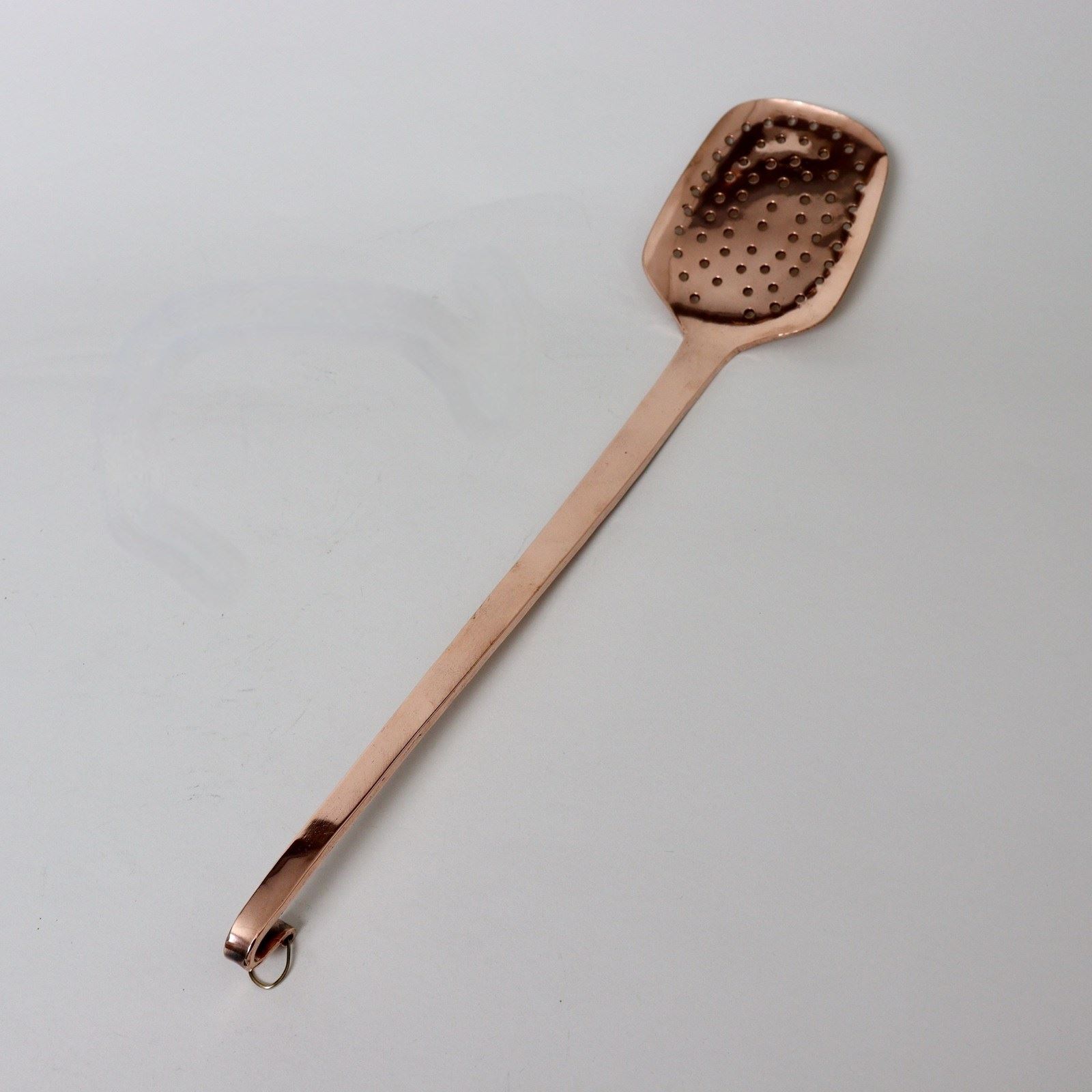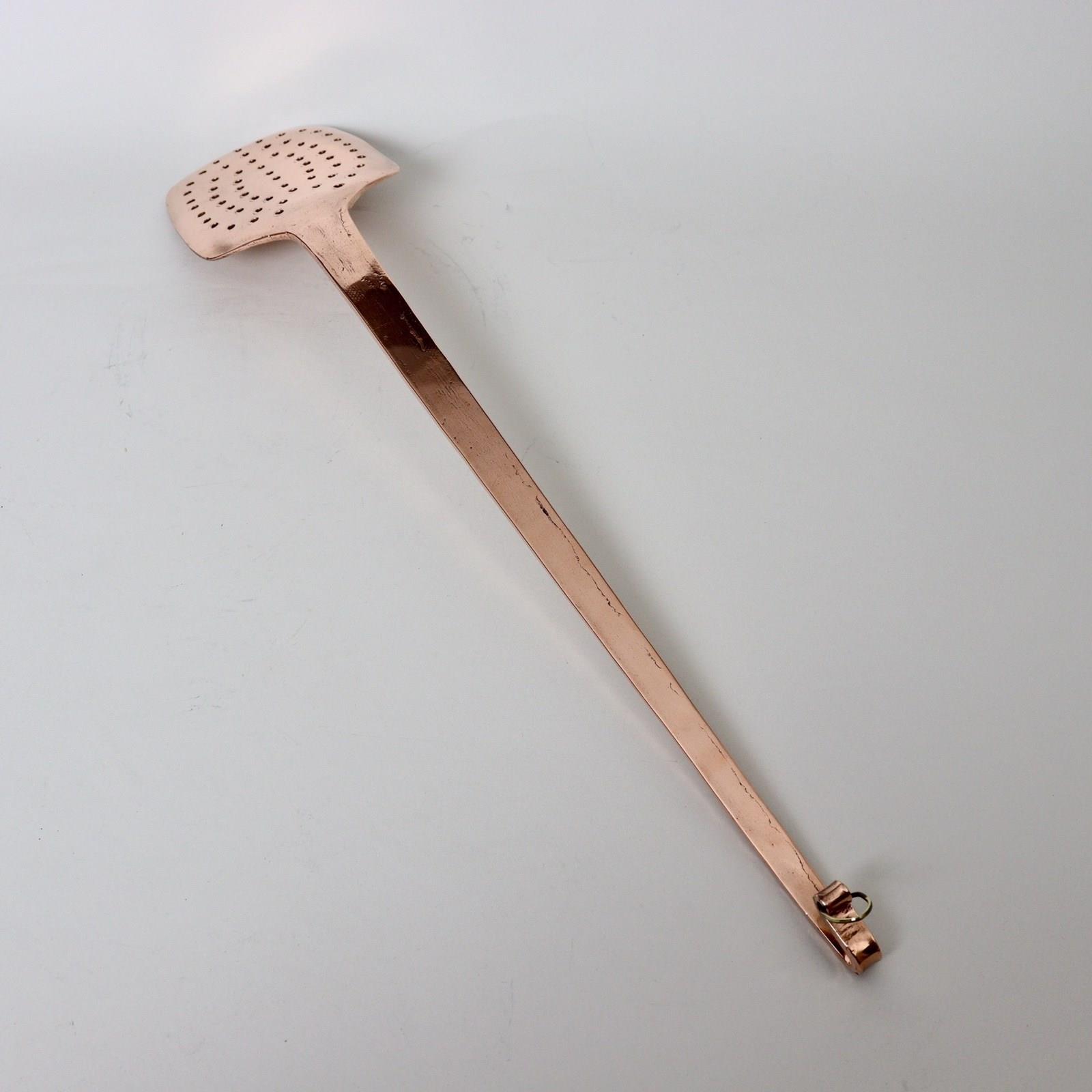 A large, 19th century, French copper skimmer. This would have been used for skimming the scum from the top of jams and preserves. It is made from a heavy gauge of copper and dates from c.1880. The end of the handle is turned, like a shepherd’s crook, so that it can hang when not in use and there is also a small, brass wire ring through the end of the handle. It is in excellent condition.