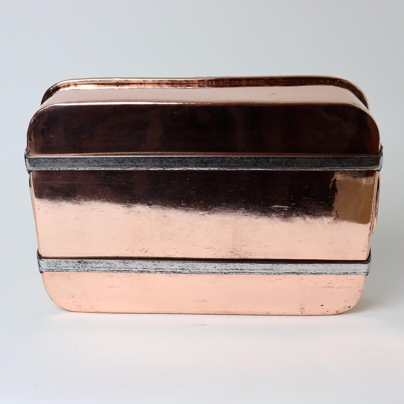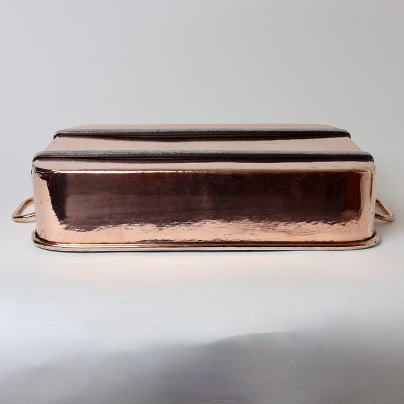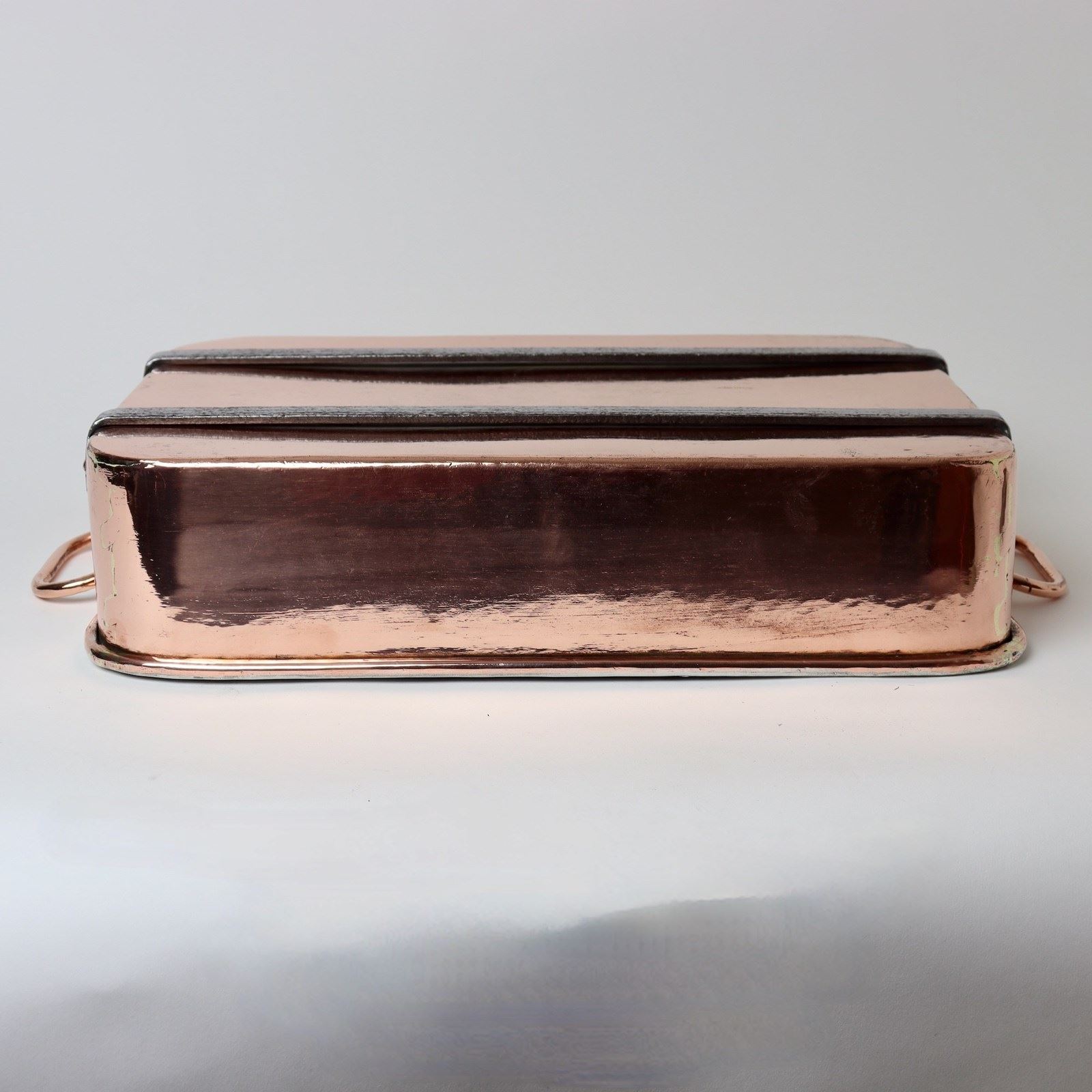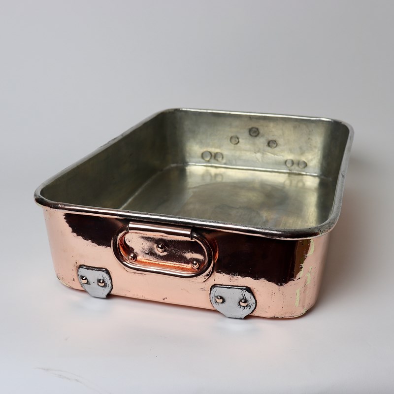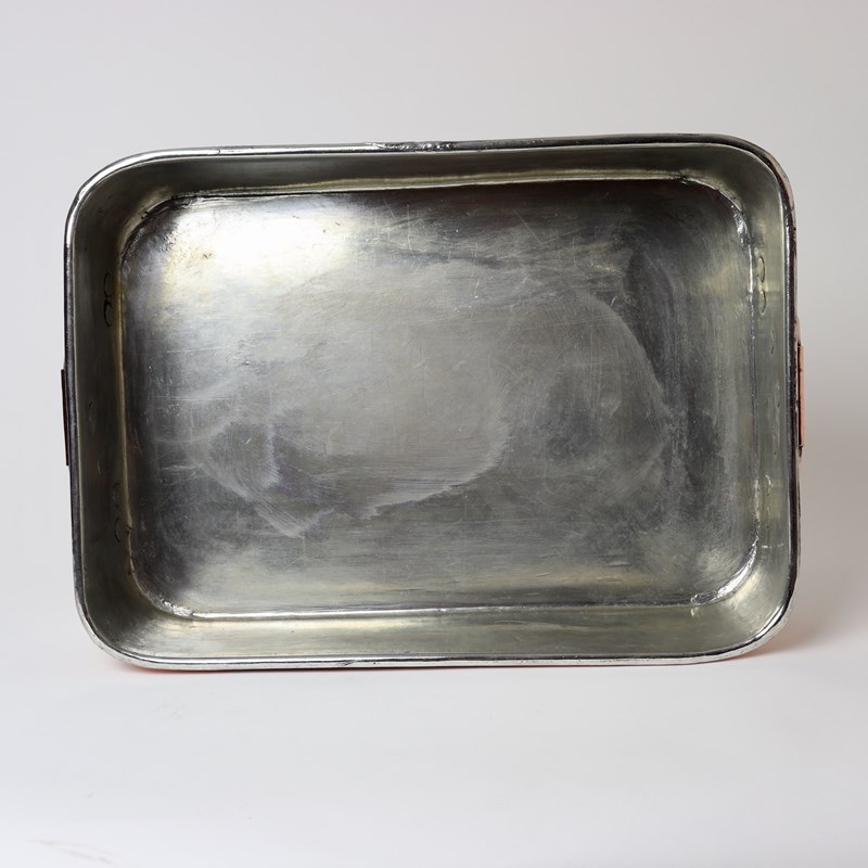 A large, and quite unusual, French copper baking dish. This is unusual in that it has steel bands under the base so that it can be used in the bottom of a stove and won’t sit directly onto the base of the oven, thus allowing the heat to circulate. It is well made, from a very heavy gauge of copper, and has castellated seams around the base and up the side. It has folding copper handles to the ends and a rolled rim. It dates from c.1860 and is in very good condition. The interior has been re-tinned so that it can be used.