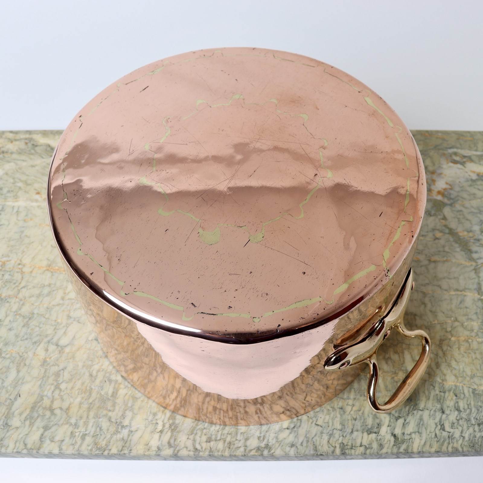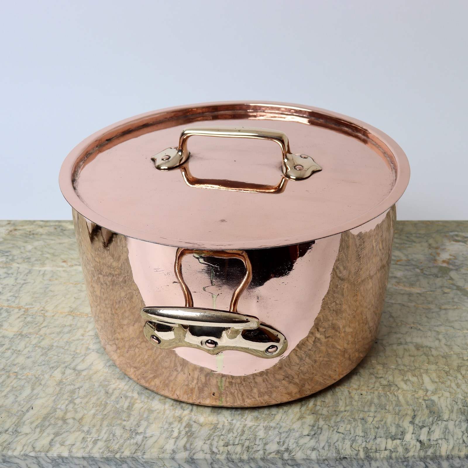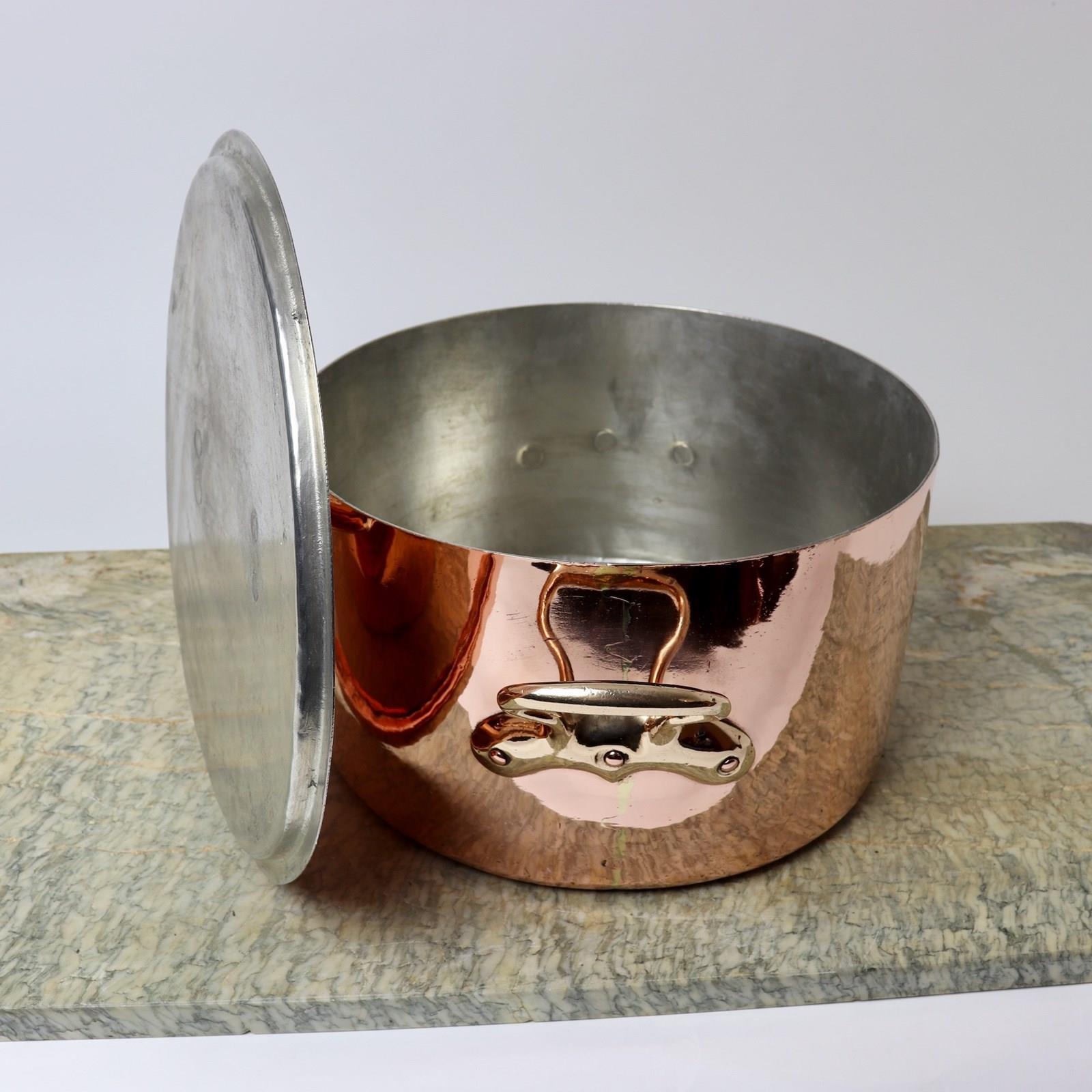 A very heavy, 19th century, French copper, circular casserole. This is made from an exceptionally heavy gauge of copper, it has castellated seams and it dates from c.1860. It has nicely shaped, brass handles to the lid and the sides of the pan. The base of the pan is slightly domed so it would work well on gas but not so well on a ceramic hob or a solid range cooker. There is also slight marking to the copper. Otherwise it is in good condition and the interior has been re-tinned so that it can be used.