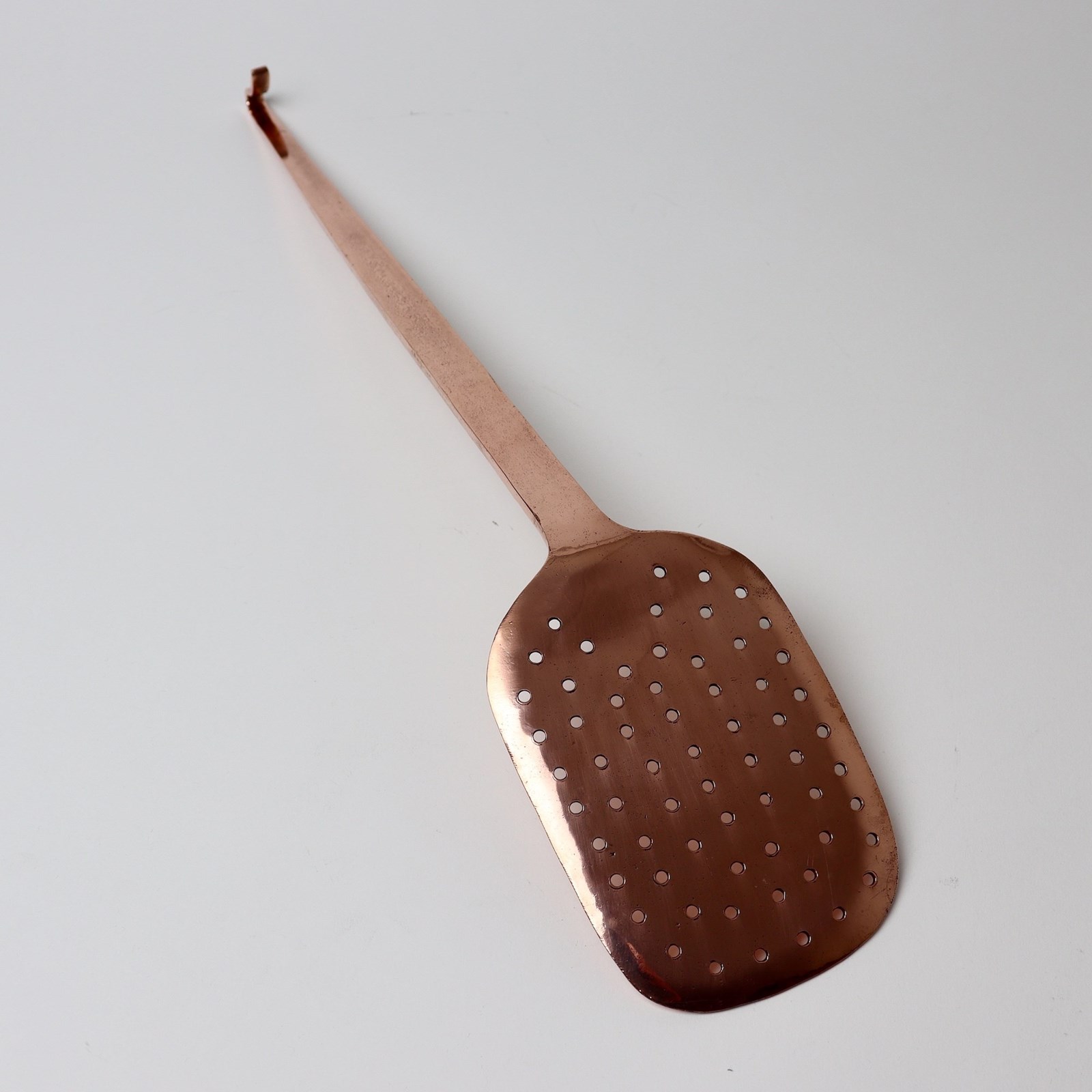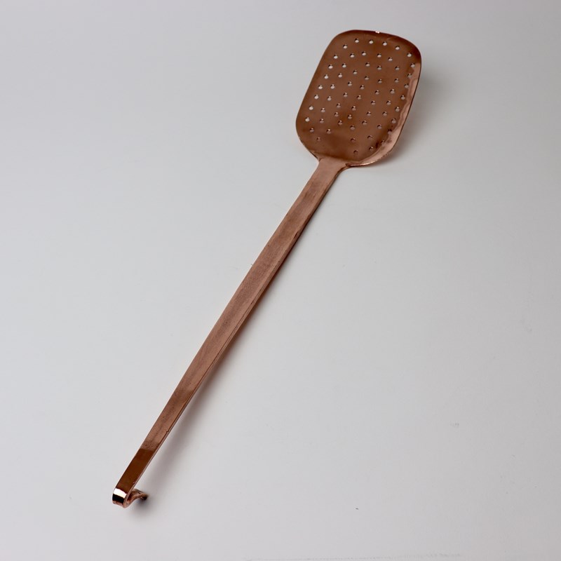 A large, 19th century, copper skimmer. This is French and it dates from c.1870. It is made from a very heavy gauge of copper and the end of the handle is turned, resembling a shepherd’s crook, so that it can hang when not in use. It is in excellent condition.
