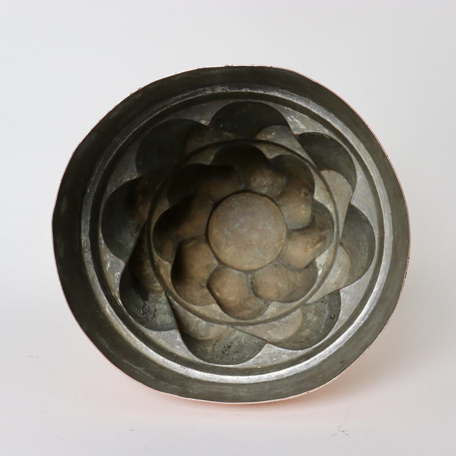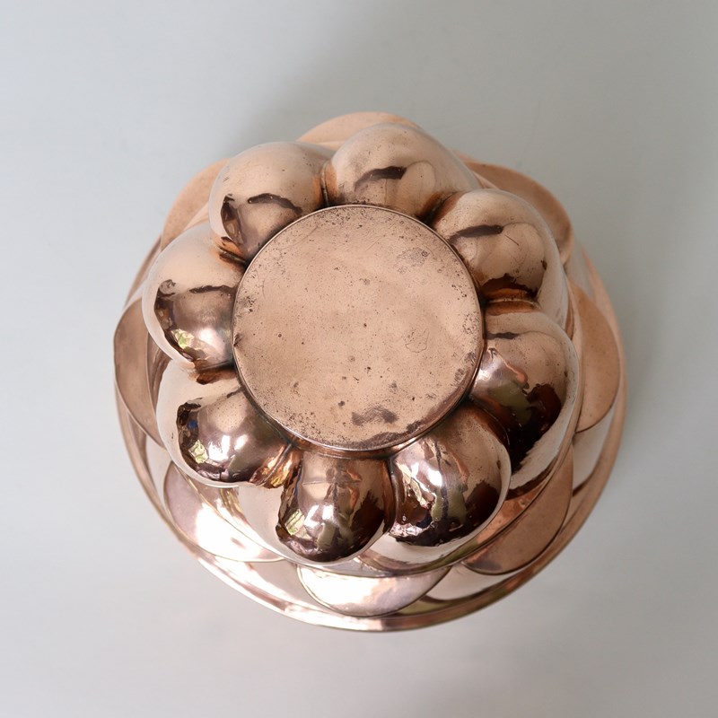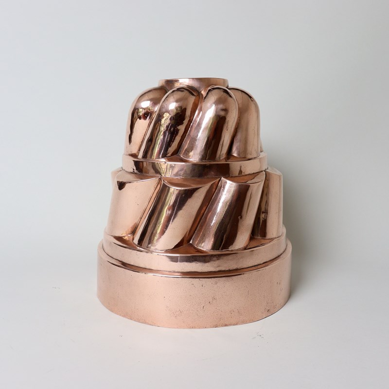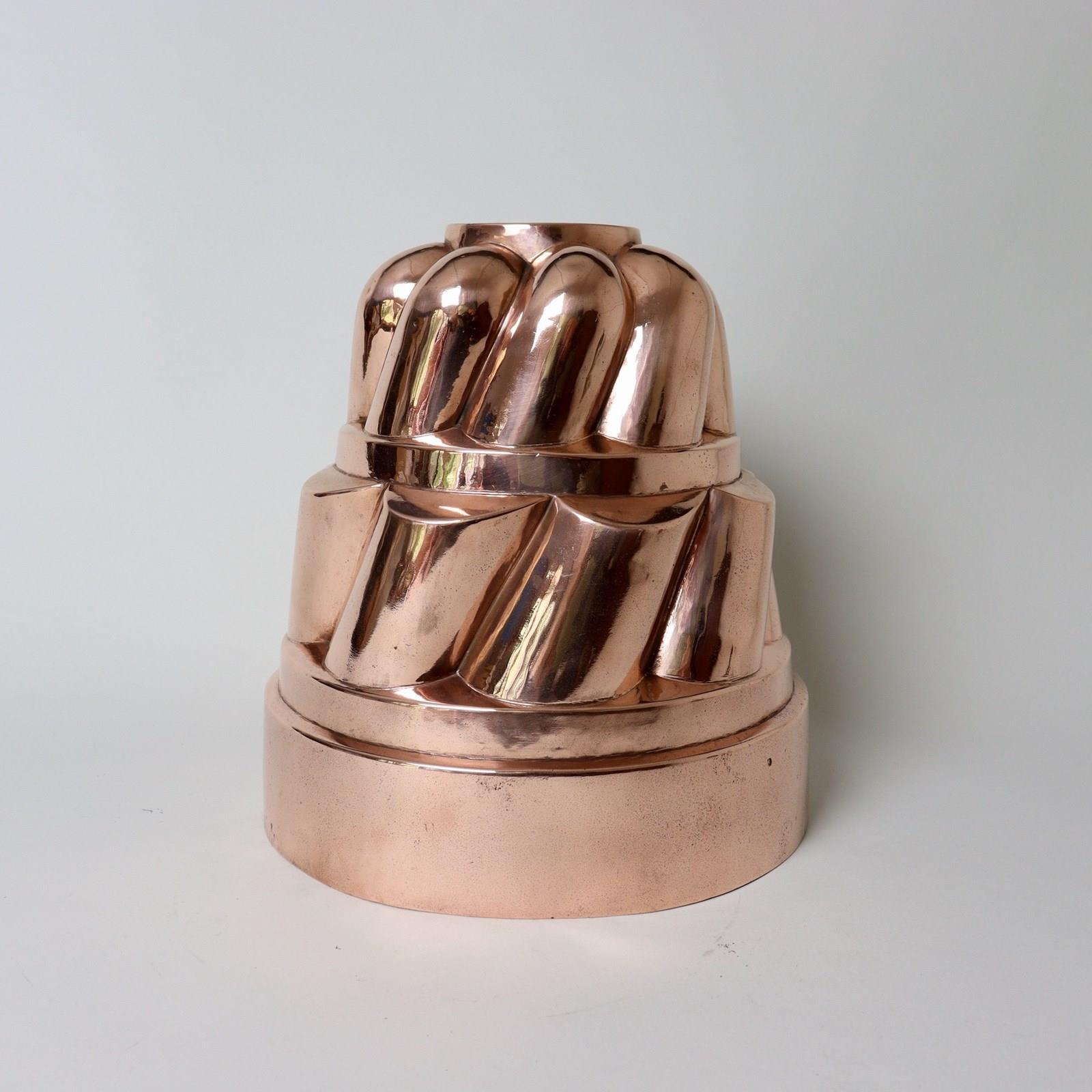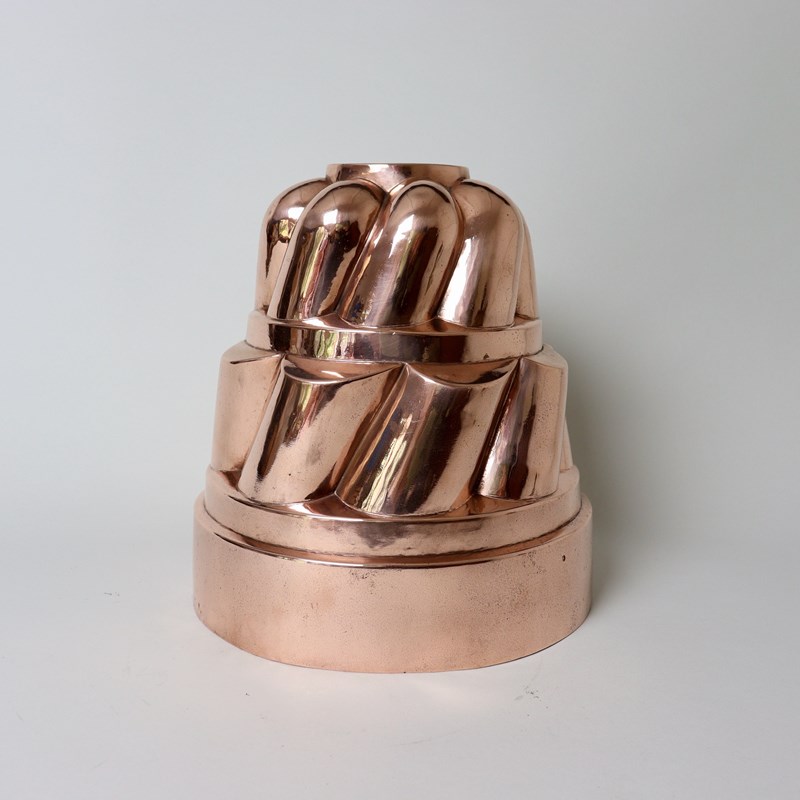 A very large, 19th century copper cake mould. There is just a trace of a mark on the rim of the mould which appears to be the remainder of the orb and cross symbol used by Benhams, but it very worn, with polishing, and is not really legible. However, I would say that this mould is probably by Benhams and dates from c.1870. It is well made, from a heavy gauge of copper. The design consists of two tiers of wrythen fluting. There are some very tiny dents to the top of the mould but generally it is in very good condition. The tinning, to the interior, is worn.