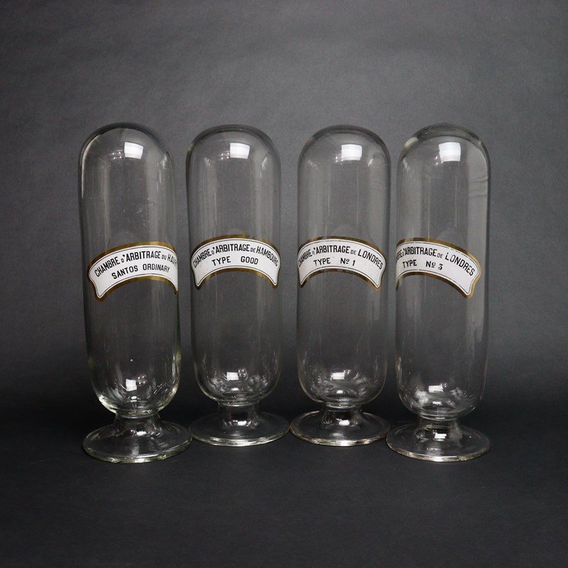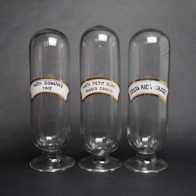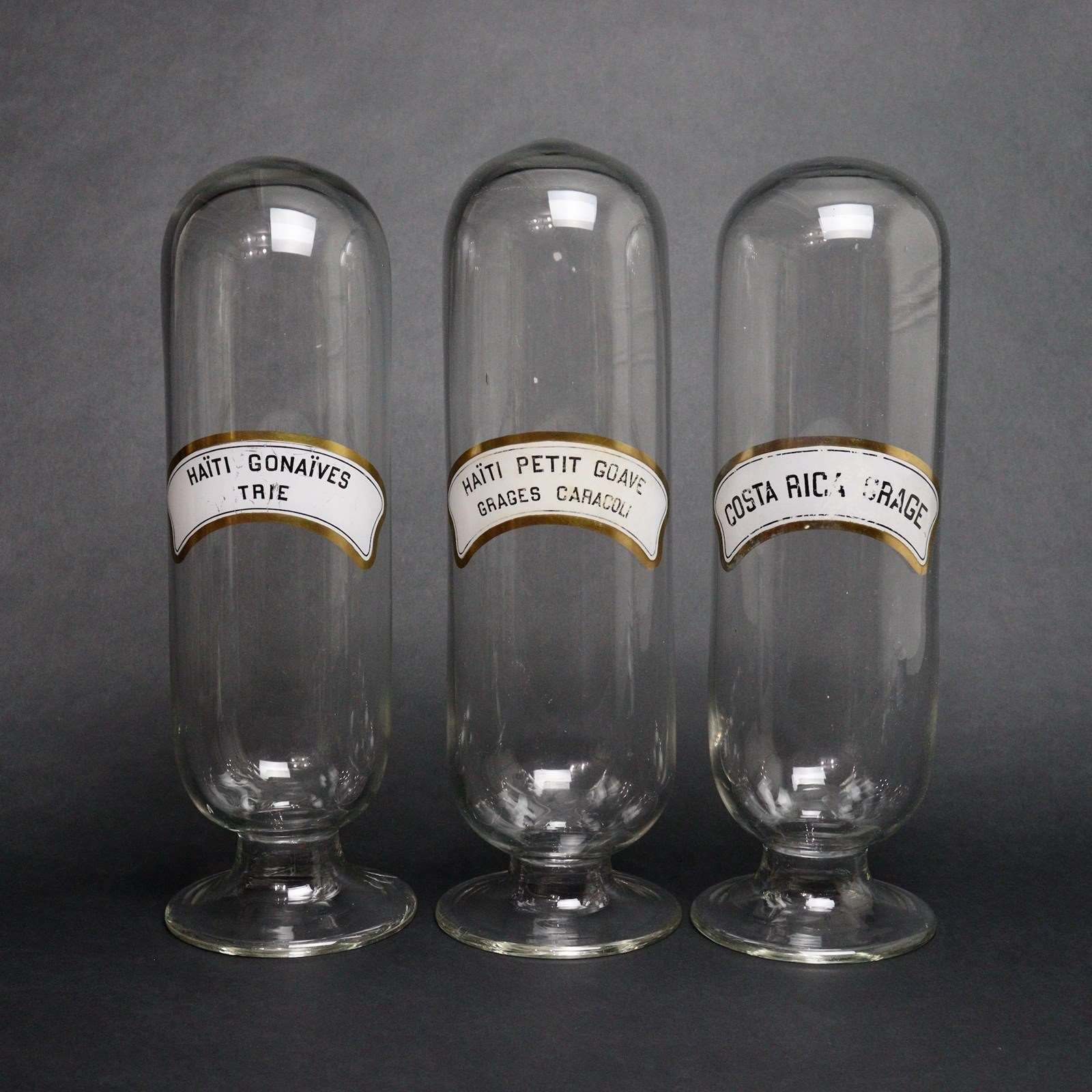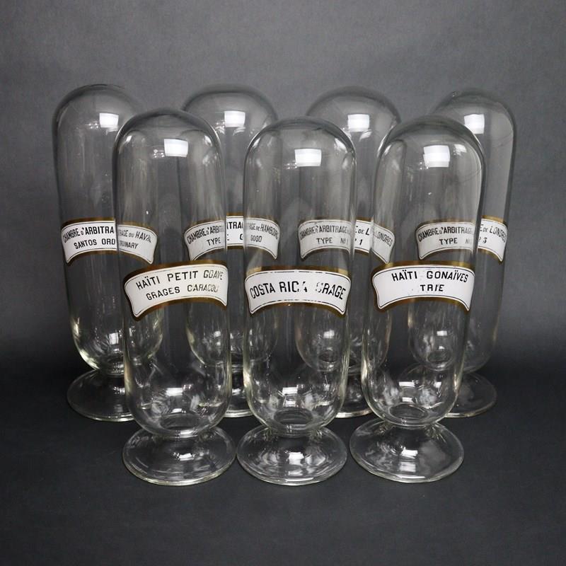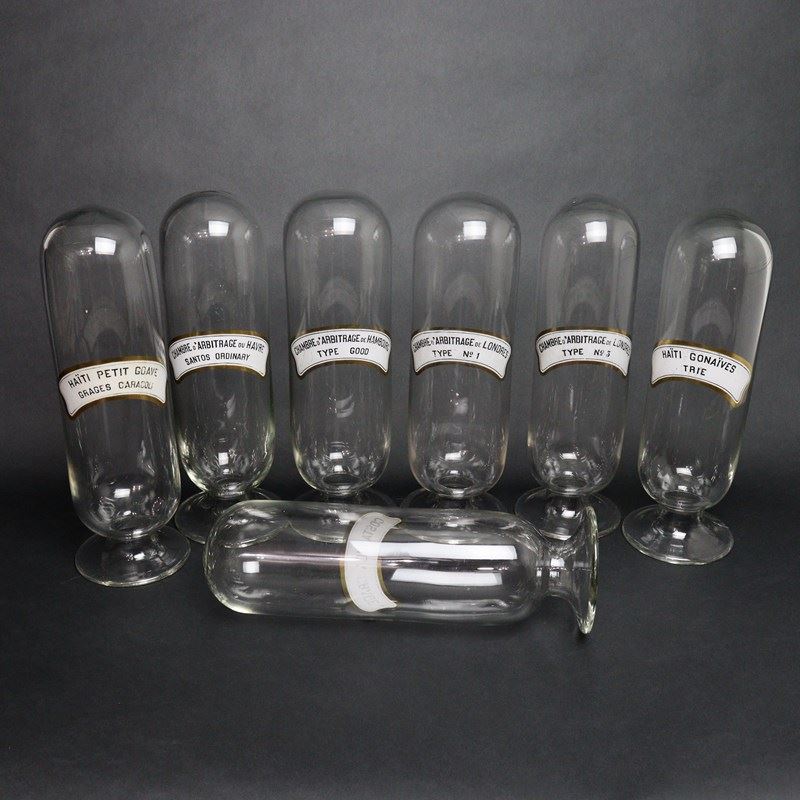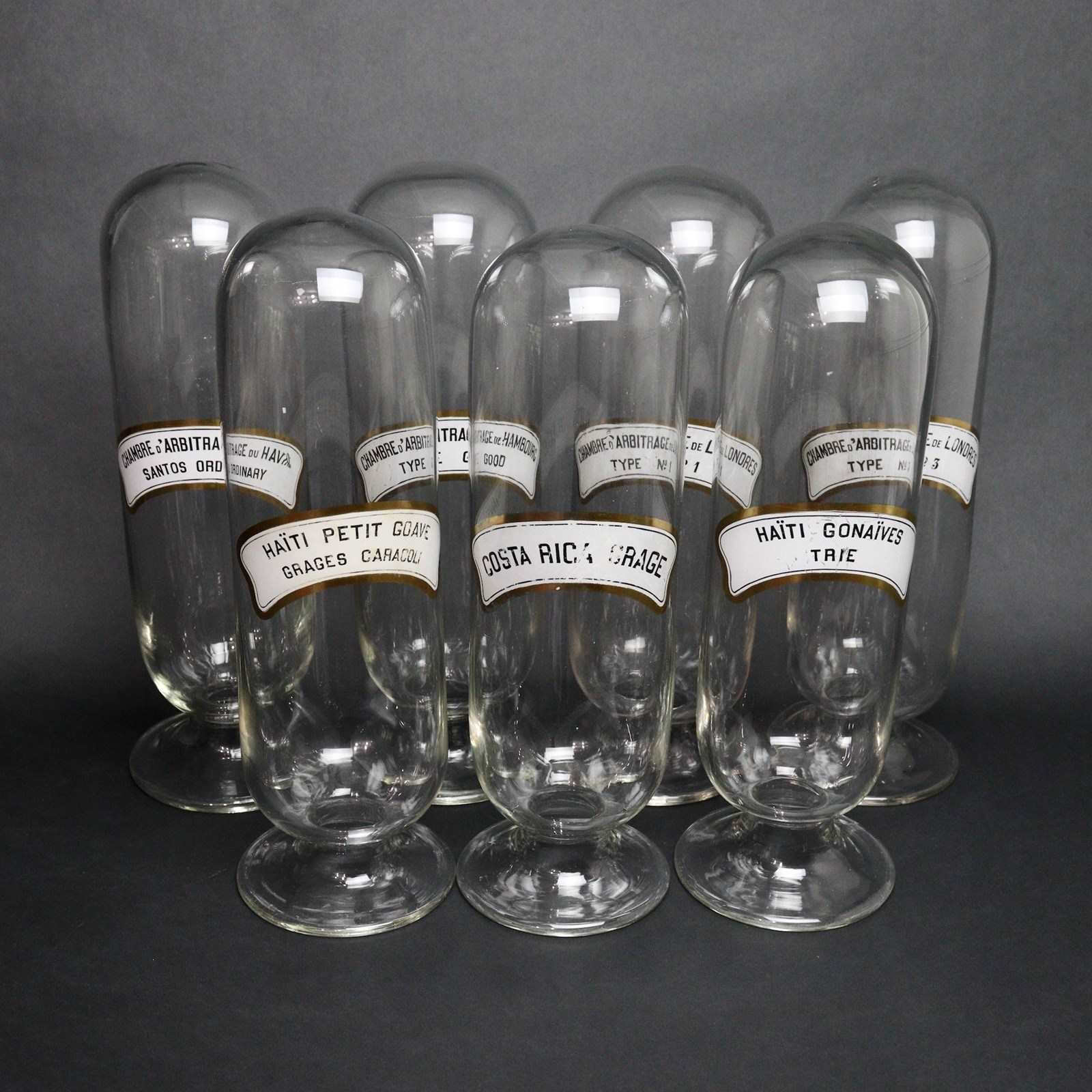 A most unusual, and very decorative set of seven, late 19th/early 20th century glass coffee jars. These would have been used in a coffee shop in France and they date from c.1900. They are a great shape, being filled from the base, and they would have been sealed with corks. The labels are quite intriguing, some having the name of the coffee, such as “SANTOS ORDINARY”, “CARACOLI” and “COSTA RICA”. Two have the name of towns in Haiti, “PETIT GOAVE” and “GONAIVES” and these would have been the towns from which the coffee came. Haiti has a long history of coffee production from its introduction by French colonists in the early 18th century. Four of the others have the names of arbitration courts, two for London, one in Hambourg and one in the Havre. These chambers or courts were all established in the late 19th century to resolve commercial disputes and coffees must have been named after them. These coffees don’t seem to exist any more as I can find nothing relating to them, only the courts. So not only are these jars very decorative but they are also a talking point with good, historical interest.