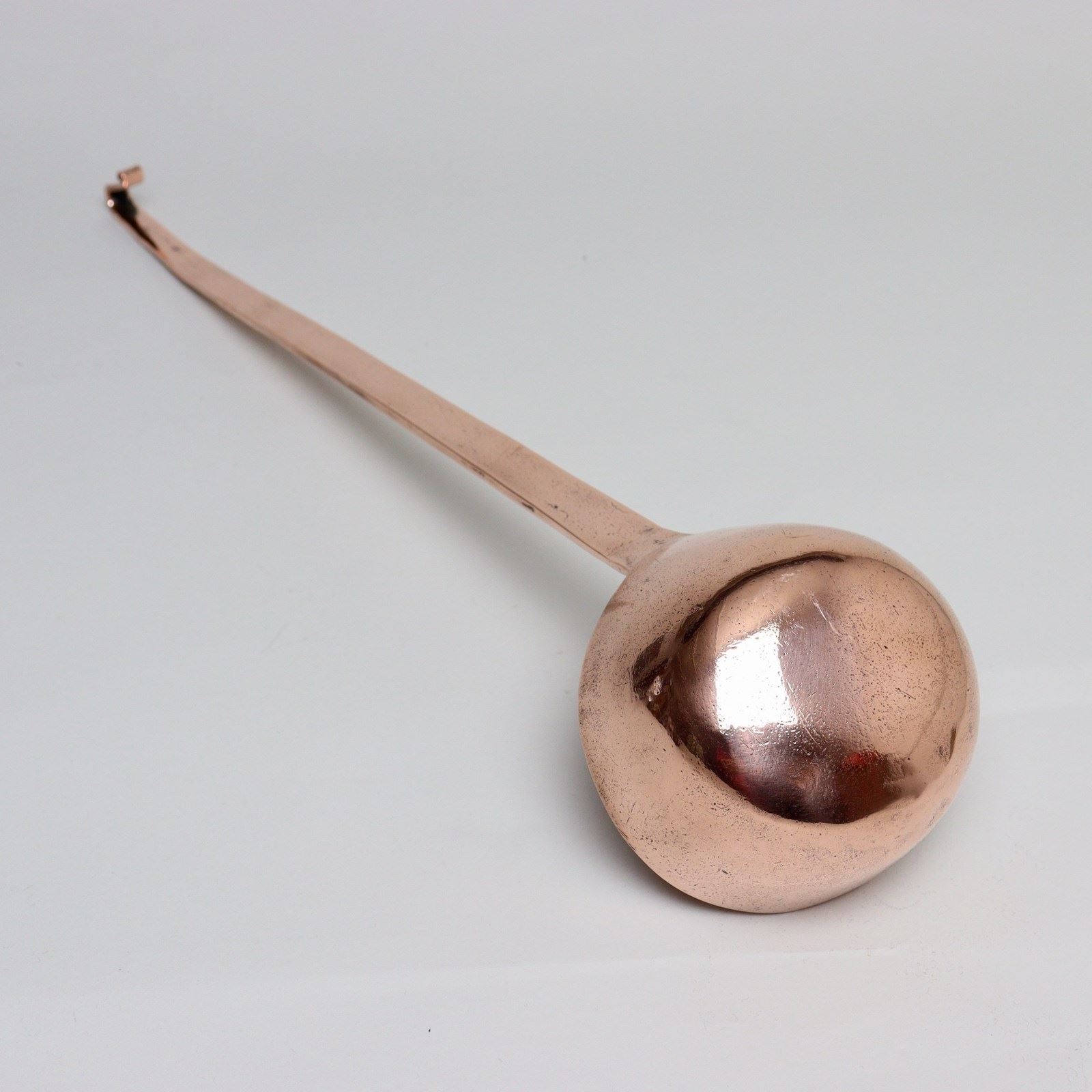 A large, 19th century, French copper ladle. This is stamped, on the handle, with a cockerel and the initials “R.E.L”. The cockerel is the mark of the French company Letang and the ladle dates from c.1860. The initials would be those of a previous owner. There is very slight pitting to the copper, from use, but otherwise the piece is in very good condition.