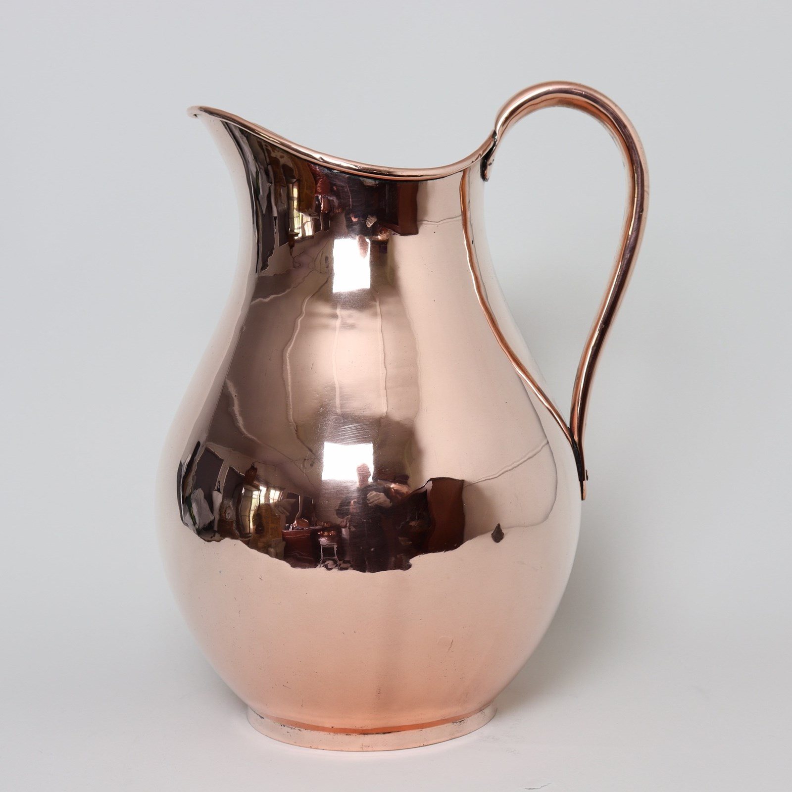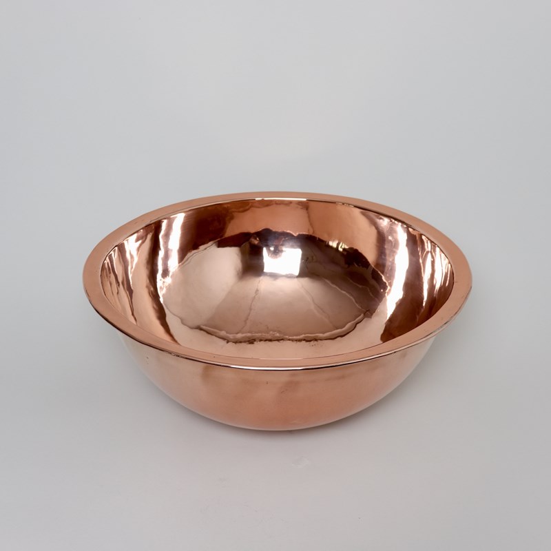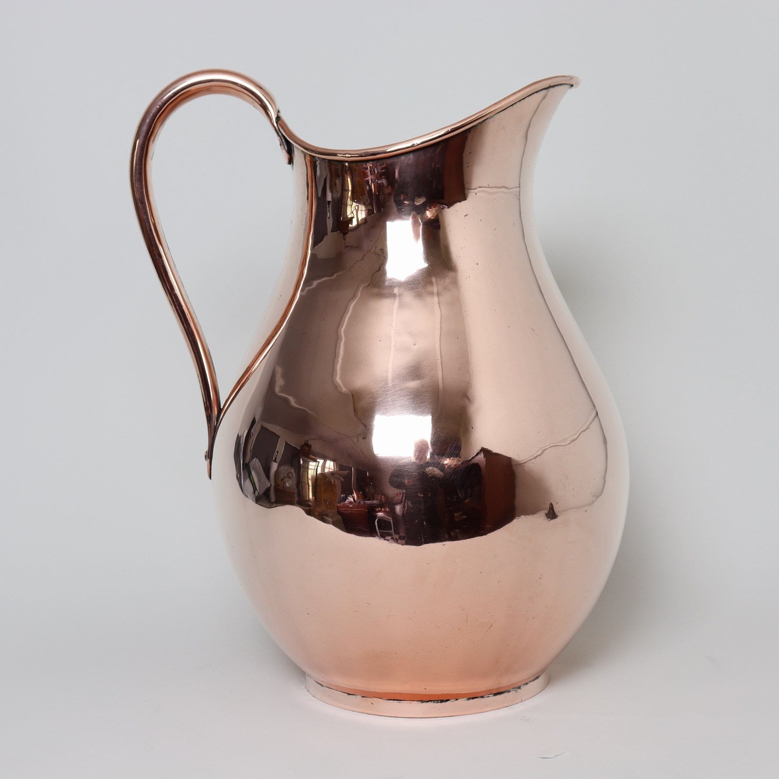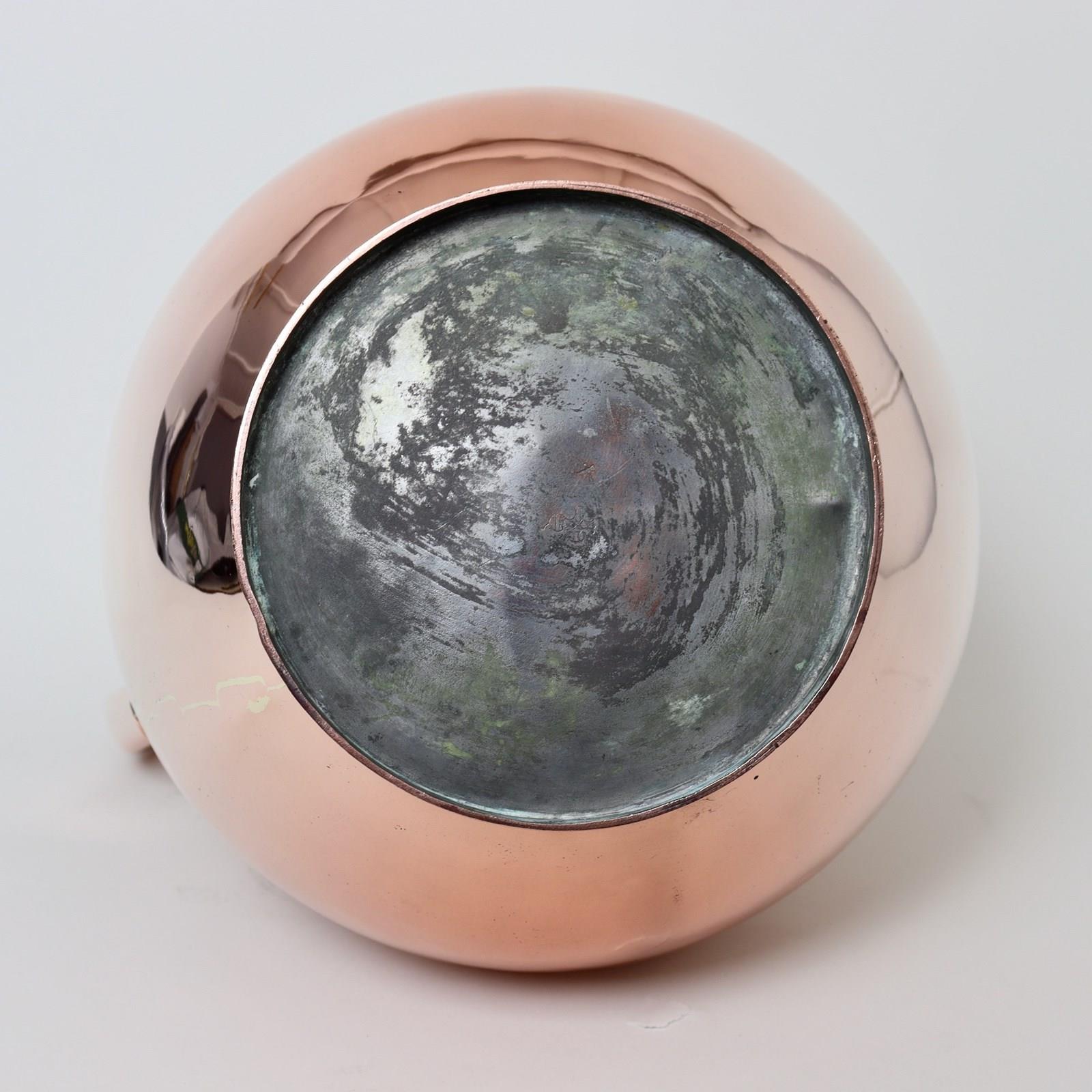 A very unusual, large, 19th century, English copper wash bowl and jug. The jug is marked, to the base, with the orb and cross symbol used by Benhams. It is well made, from a very heavy gauge of copper, and it has a castellated seam up the side. The shape is very elegant and it dates from c.1870. The bowl is simple in form, with a rounded base, and originally it probably sat into a wash stand. Both the jug and bowl are in excellent condition.