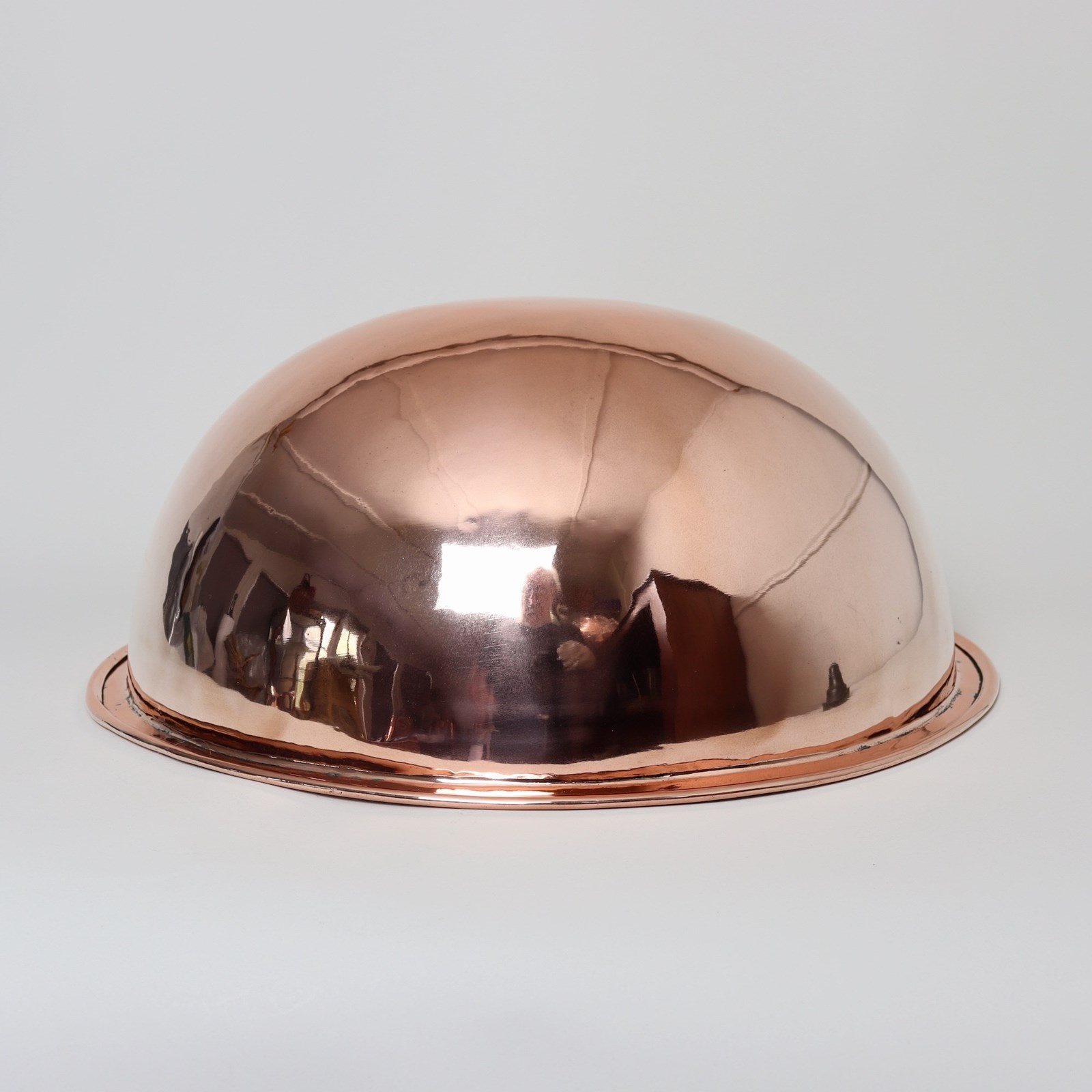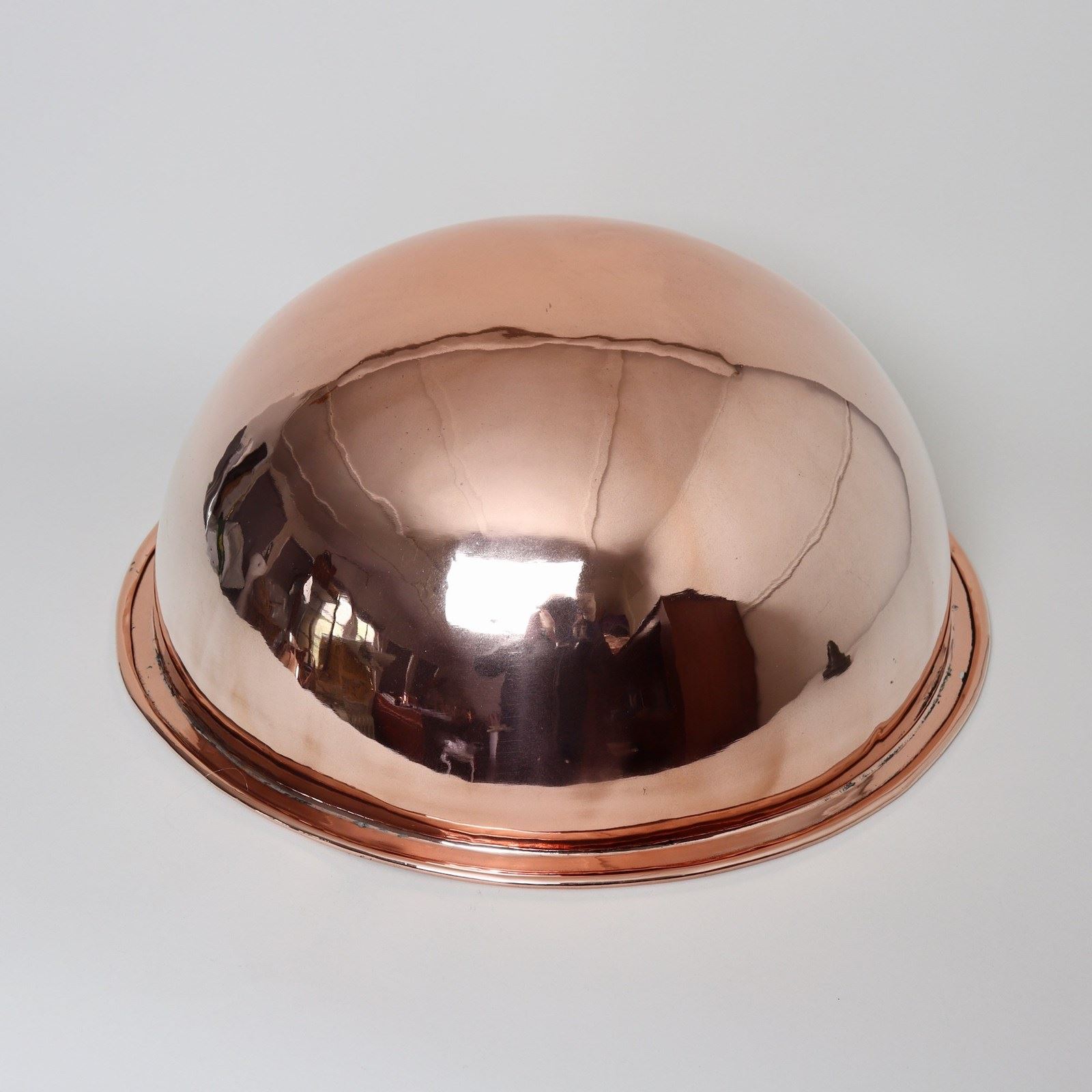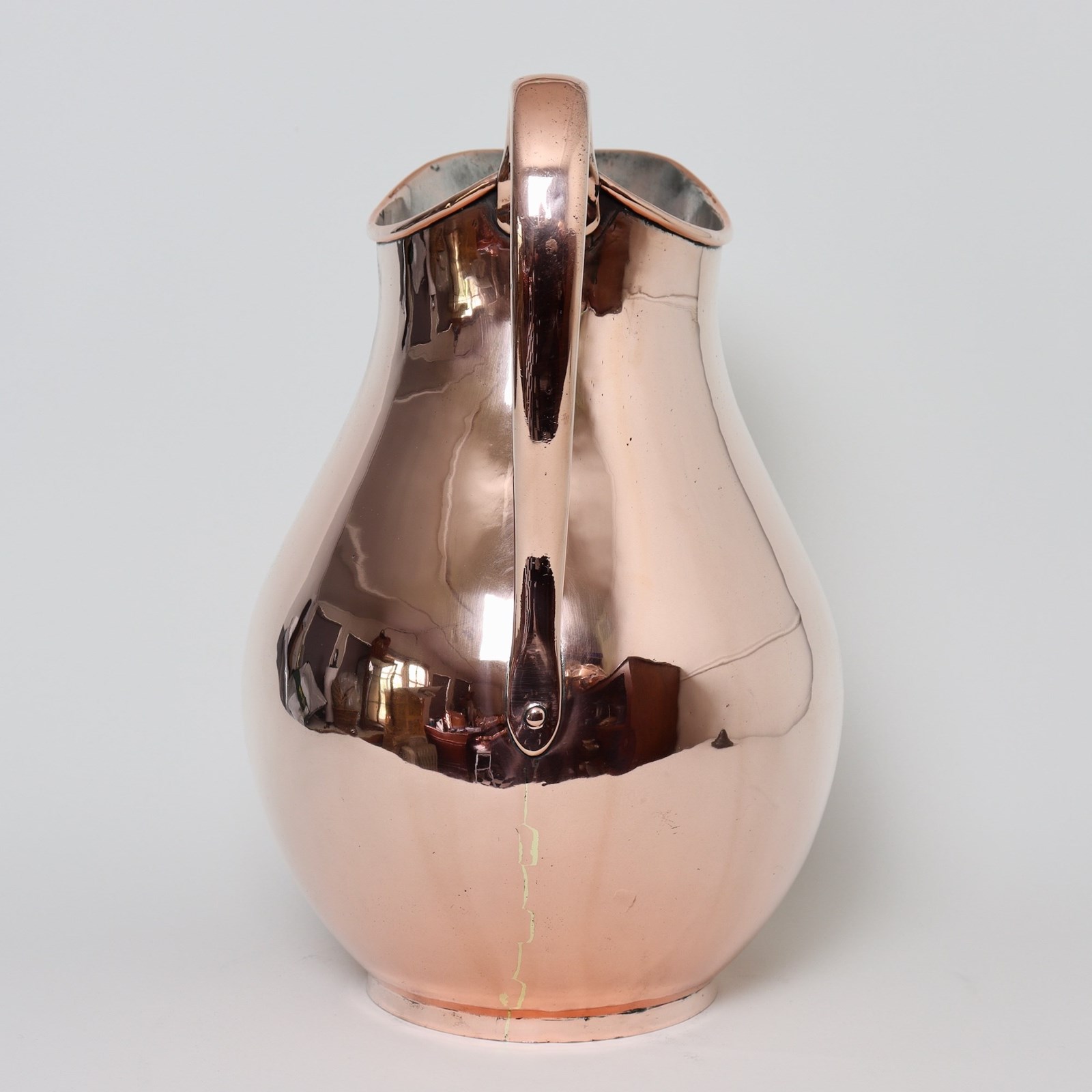 A very unusual, large, 19th century, English copper wash bowl and jug. The jug is marked, to the base, with the orb and cross symbol used by Benhams. It is well made, from a very heavy gauge of copper, and it has a castellated seam up the side. The shape is very elegant and it dates from c.1870. The bowl is simple in form, with a rounded base, and originally it probably sat into a wash stand. Both the jug and bowl are in excellent condition.