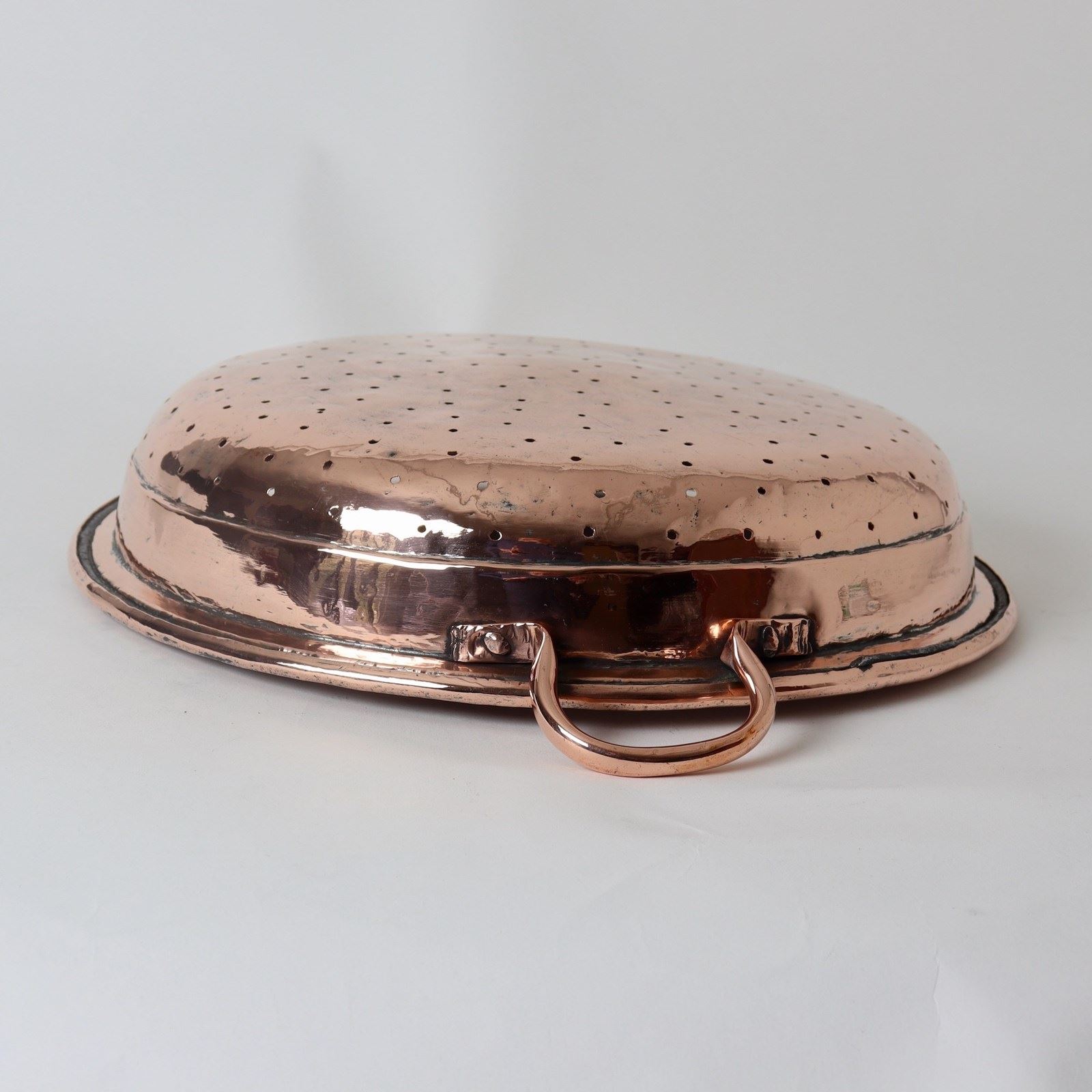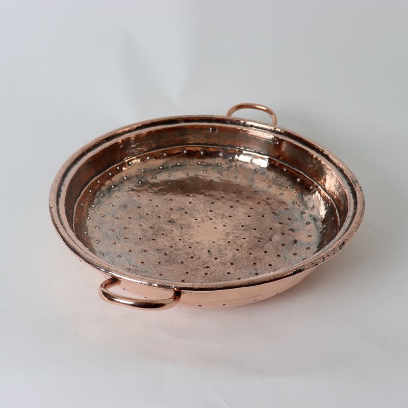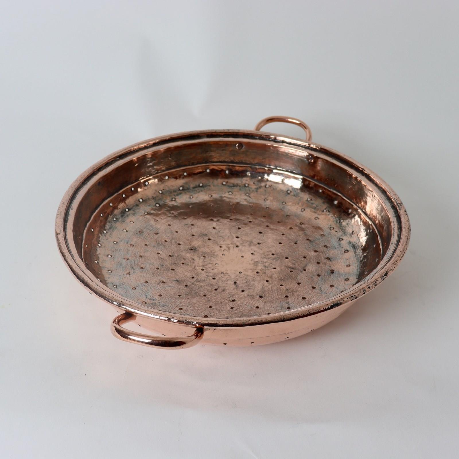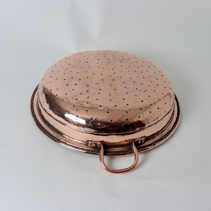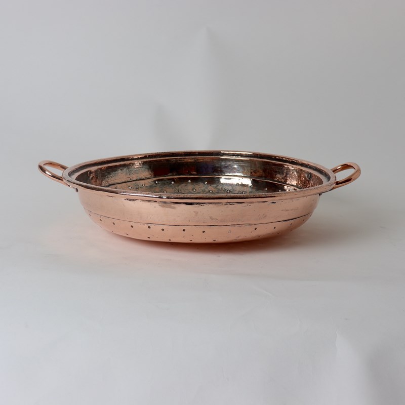 A large, 19th century, French copper colander or sieve. This is made from quite a heavy gauge of copper and it dates from c.1860. The handle fittings are quite naive in style, and the rim is heavily wired, so this could possibly be a blacksmith made piece rather than made by a copper manufacturer. It was made for use with food as the interior was originally tinned. The tinning is now mostly worn away so the interior has been polished. It is in very good condition.
