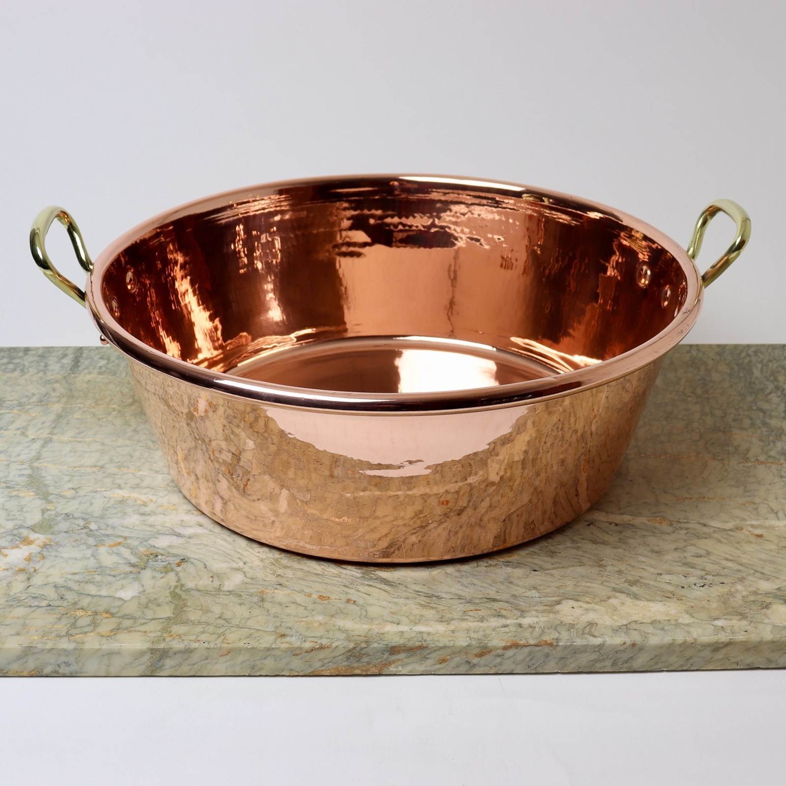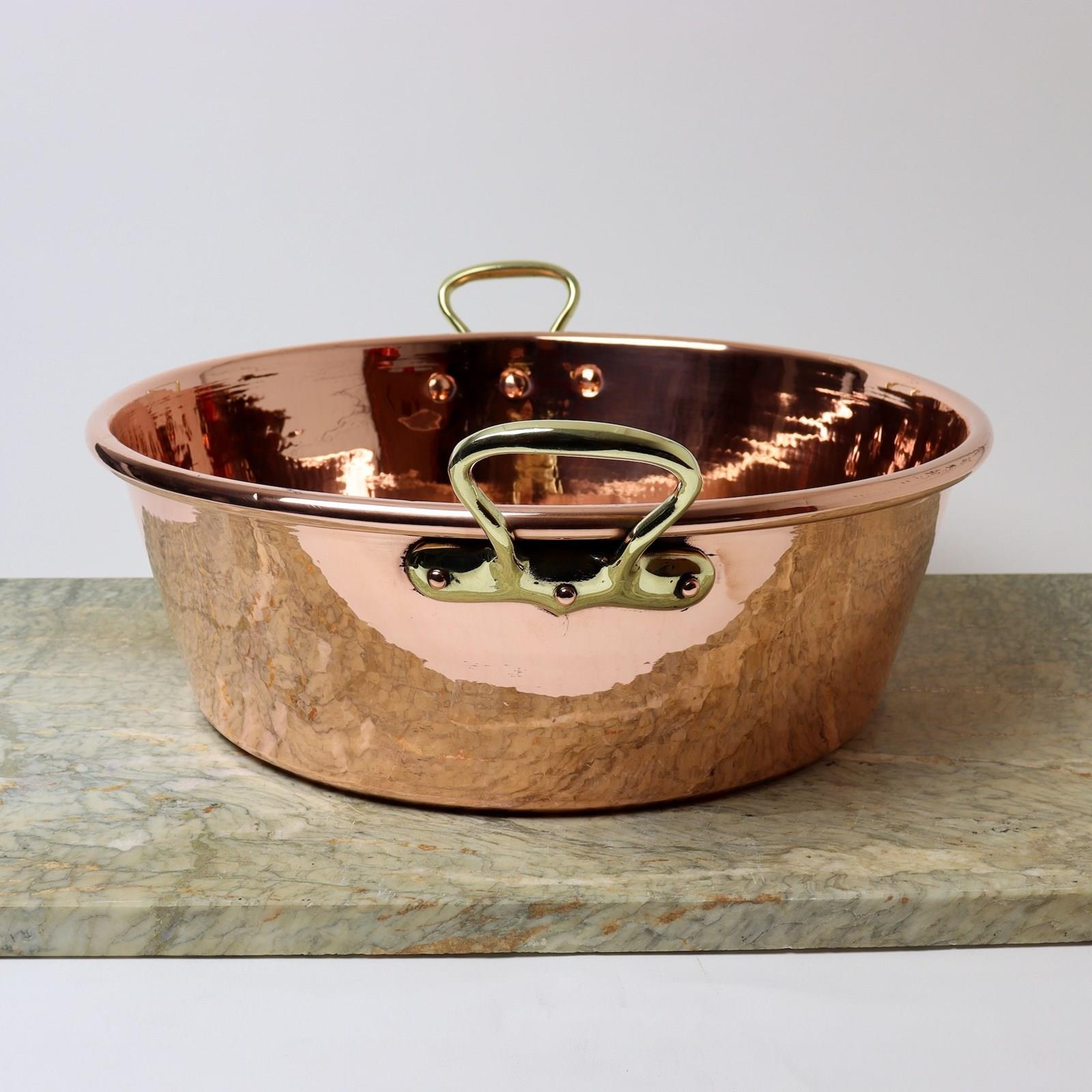 A large, early twentieth century, French copper preserve pan. This is made from a heavy gauge of copper and it dates from c.1920. The copper has a planished finish which was very popular during this period. The pan has a rolled rim and the typical, attractive, French form of brass handles to either side. It is in excellent condition.