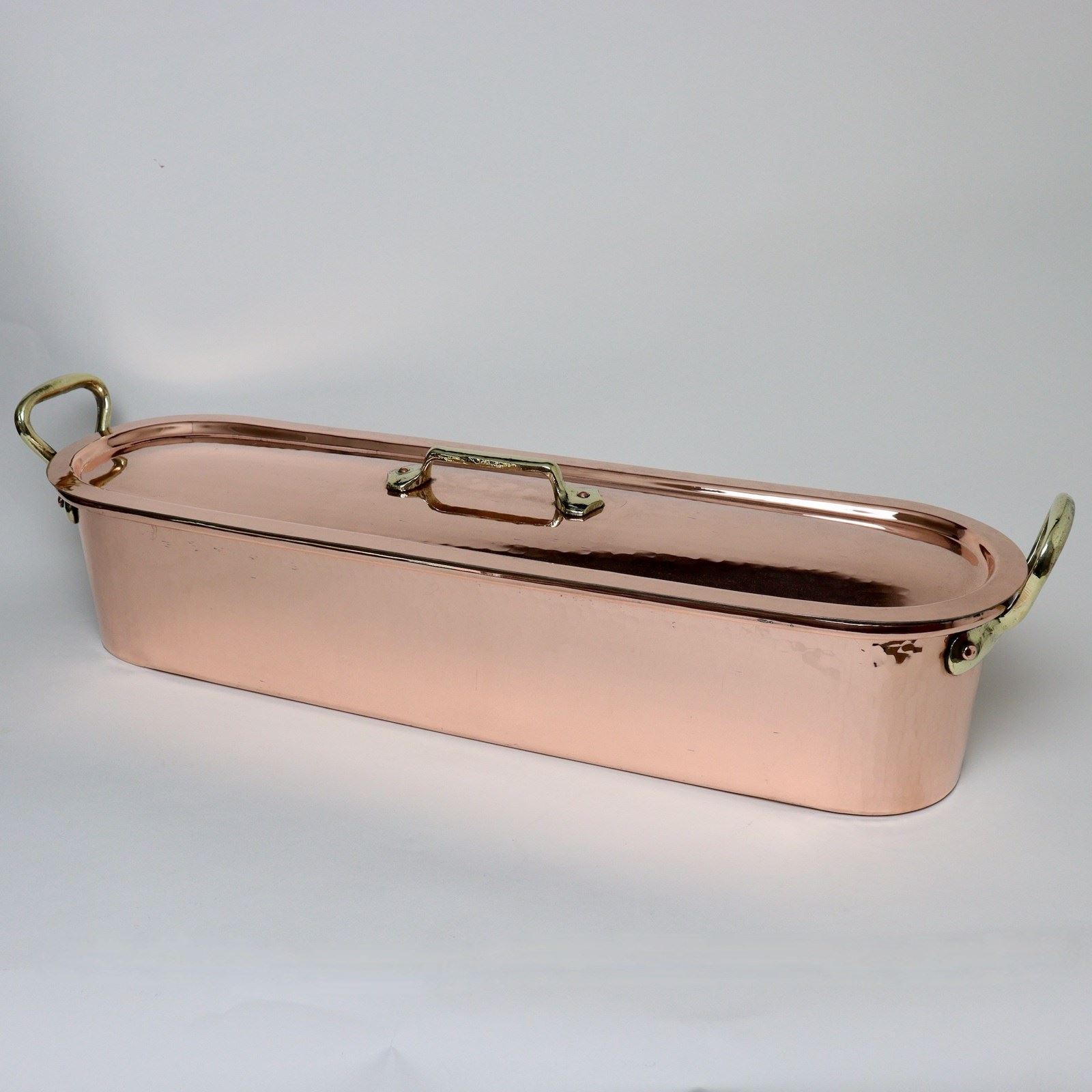 A large French copper salmon, or pike, kettle complete with drainer. This is well made, from a very heavy gauge of copper, and it dates from c.1900. The copper has a heavily planished finish and there are brass handles to the ends of the piece and also to the lid. It is in excellent condition. It hasn’t recently been re-tinned but the tinning is still in very good, bright, usable condition.