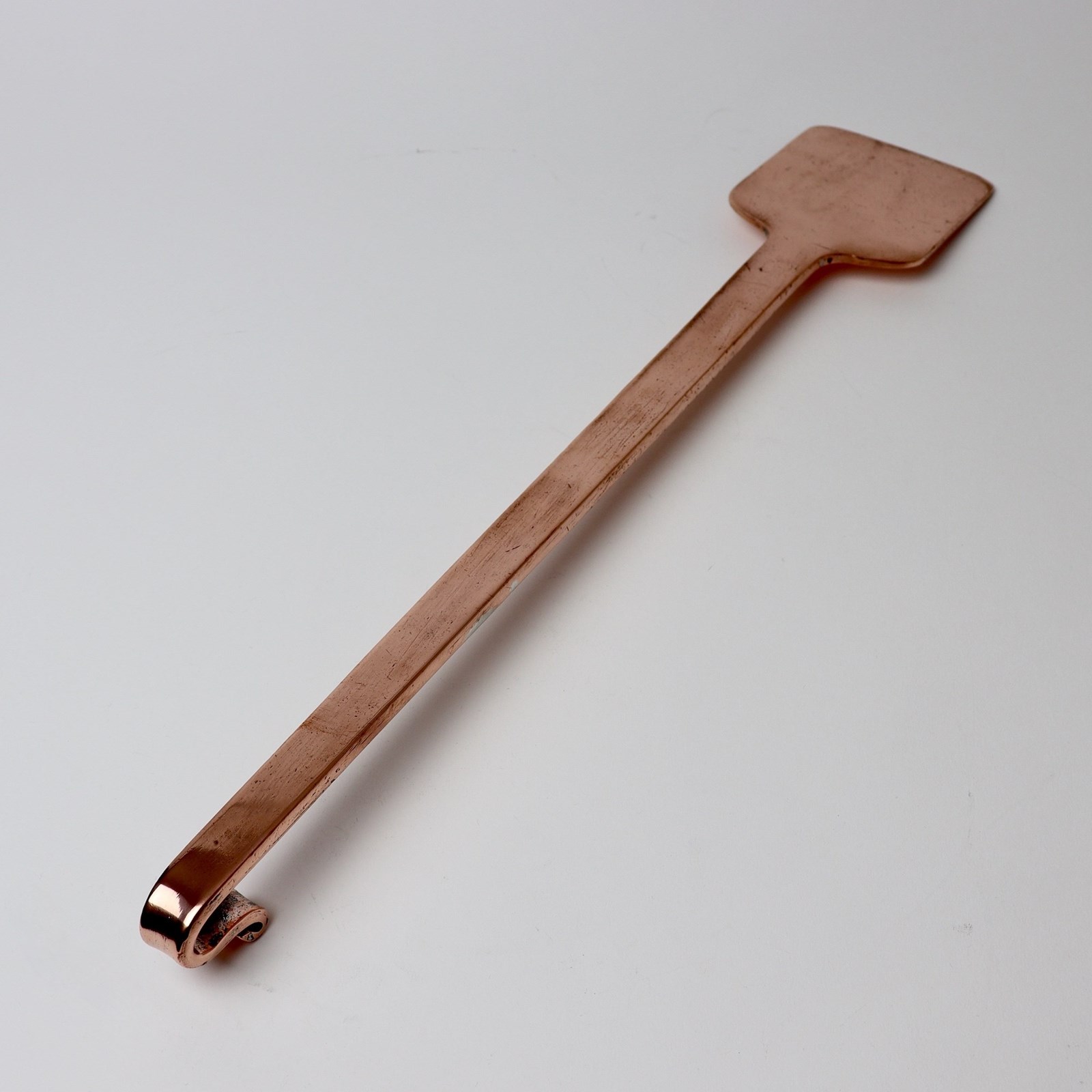 A large, 19th century, French copper spatula. This is made from an extremely heavy gauge of copper and it dates from c.1860. It has a turned end to the handle which resembles a shepherd’s crook and it is in excellent condition.