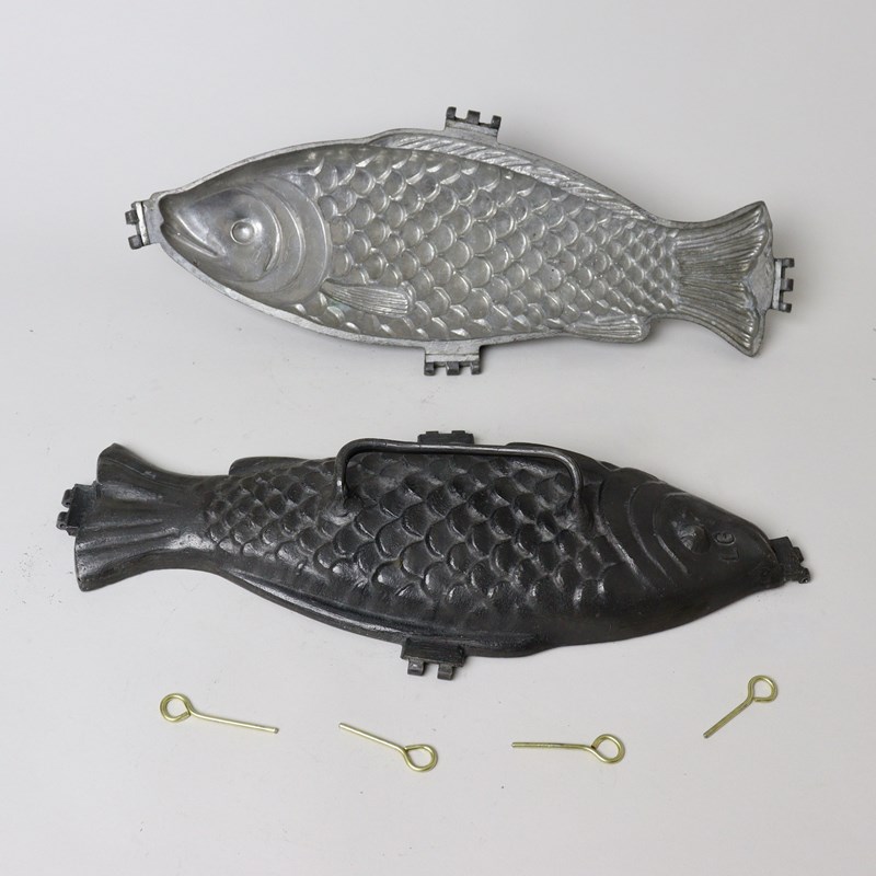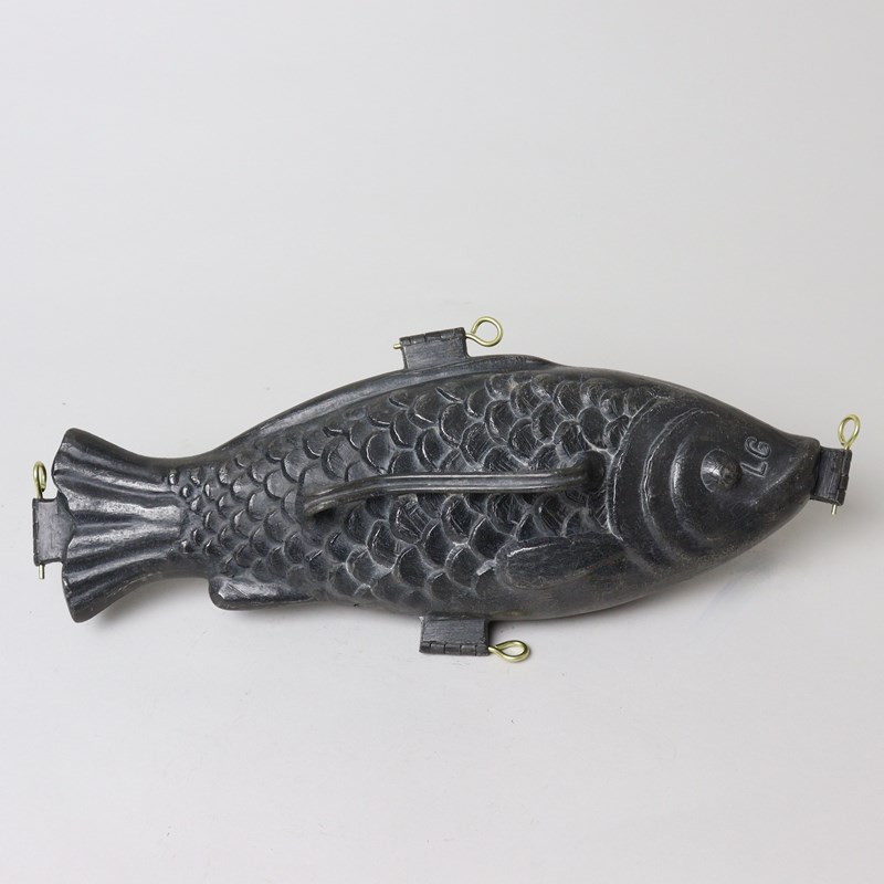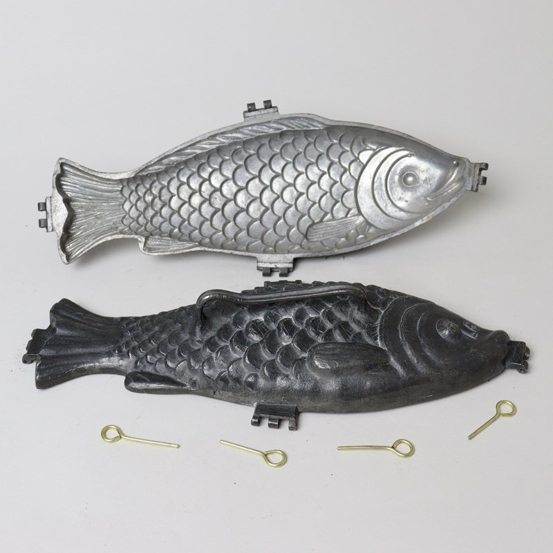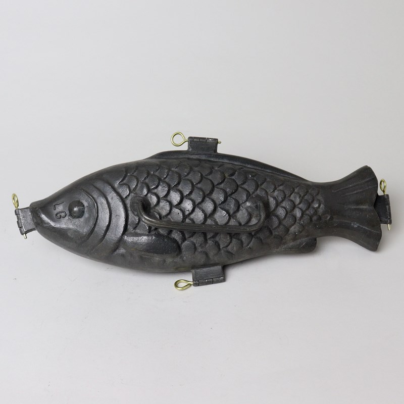 A large, pewter ice cream mould in the shape of a fish. This is marked “L G” in the casting to both sides. This is the mark of the French company Letang who, in the 19th century, were one of the leading French manufacturers of metalware for the kitchen. It dates from c.1880. It is made in two parts which are held together by a series of brass pins. The mould is very naturalistically modelled, well detailed, and would turn out very well. The pewter handles have both been bent in slightly but otherwise the mould is in good condition. The interior is in very good, bright, usable condition and the exterior has a lovely, dark patina. The brass pins, which hold the two parts together, are replacements.
