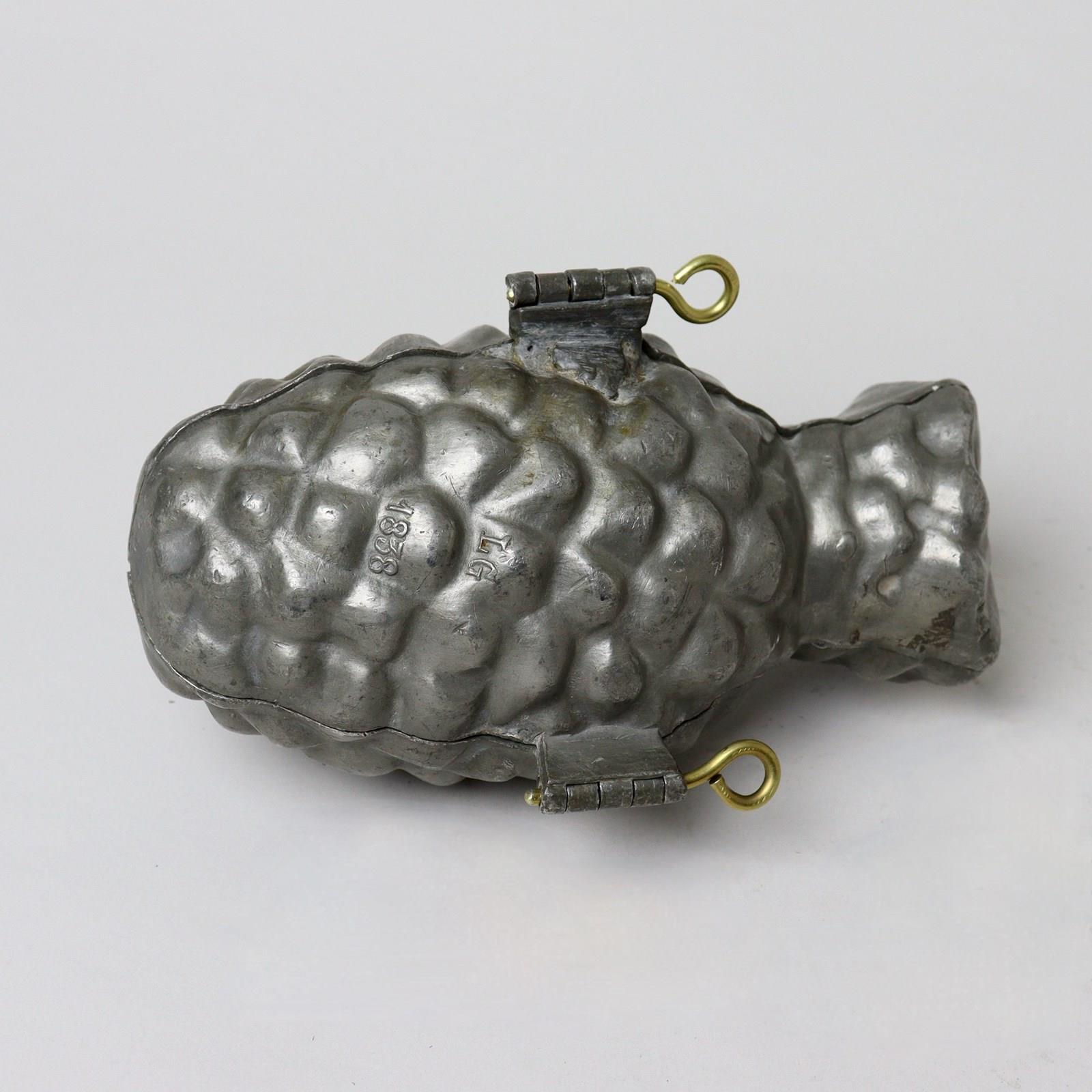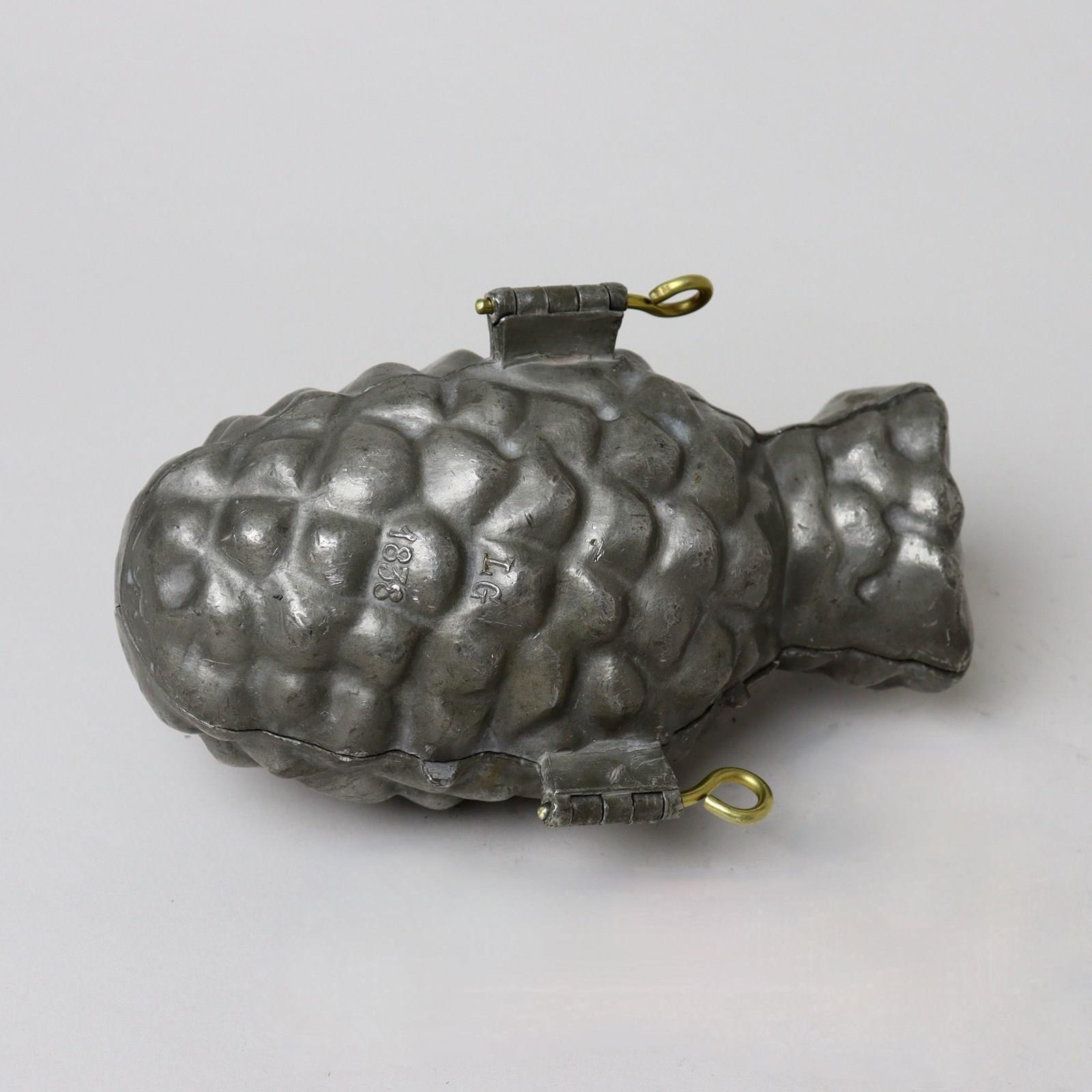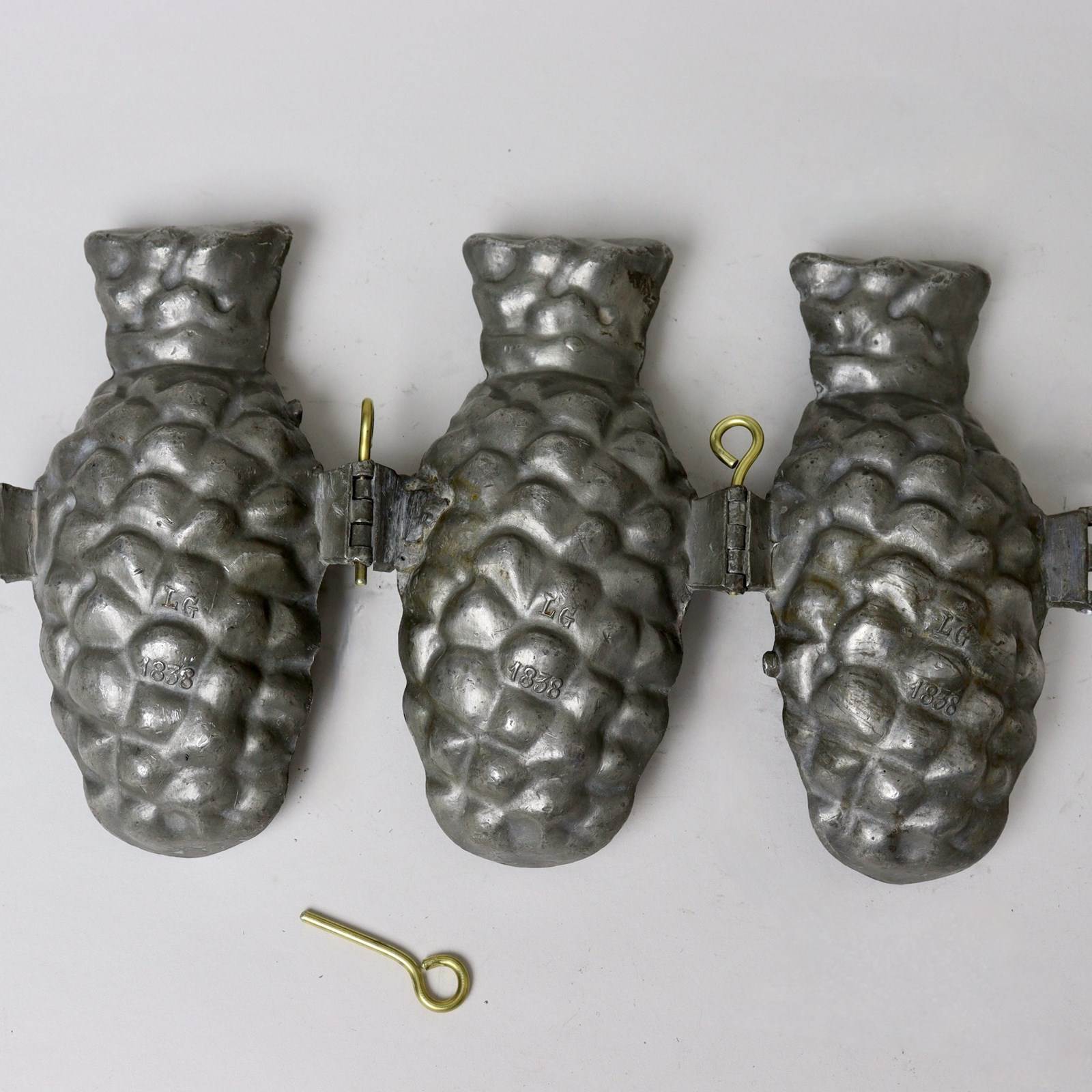 A three part, hinged pewter ice cream mould in the shape of a pineapple. All three parts are marked “L G” and they are also marked with the pattern number “1838”. These are the marks of the French company Letang who, in the 19th century, were one of the leading French manufacturers of metalware for the kitchen. It dates from c.1870. The three parts are held together by brass pins which are all replacements. The pineapple is very naturalistically modelled, with excellent detail, and it would turn out well. At some time one of the hinges has broken and this has a historic repair which can be seen in one of the images. Otherwise the mould is in good condition. The interior is still in usable condition and the exterior has a lovely, dark patina.