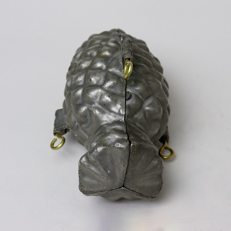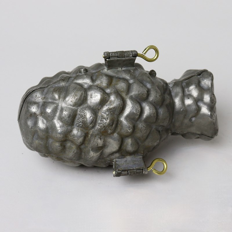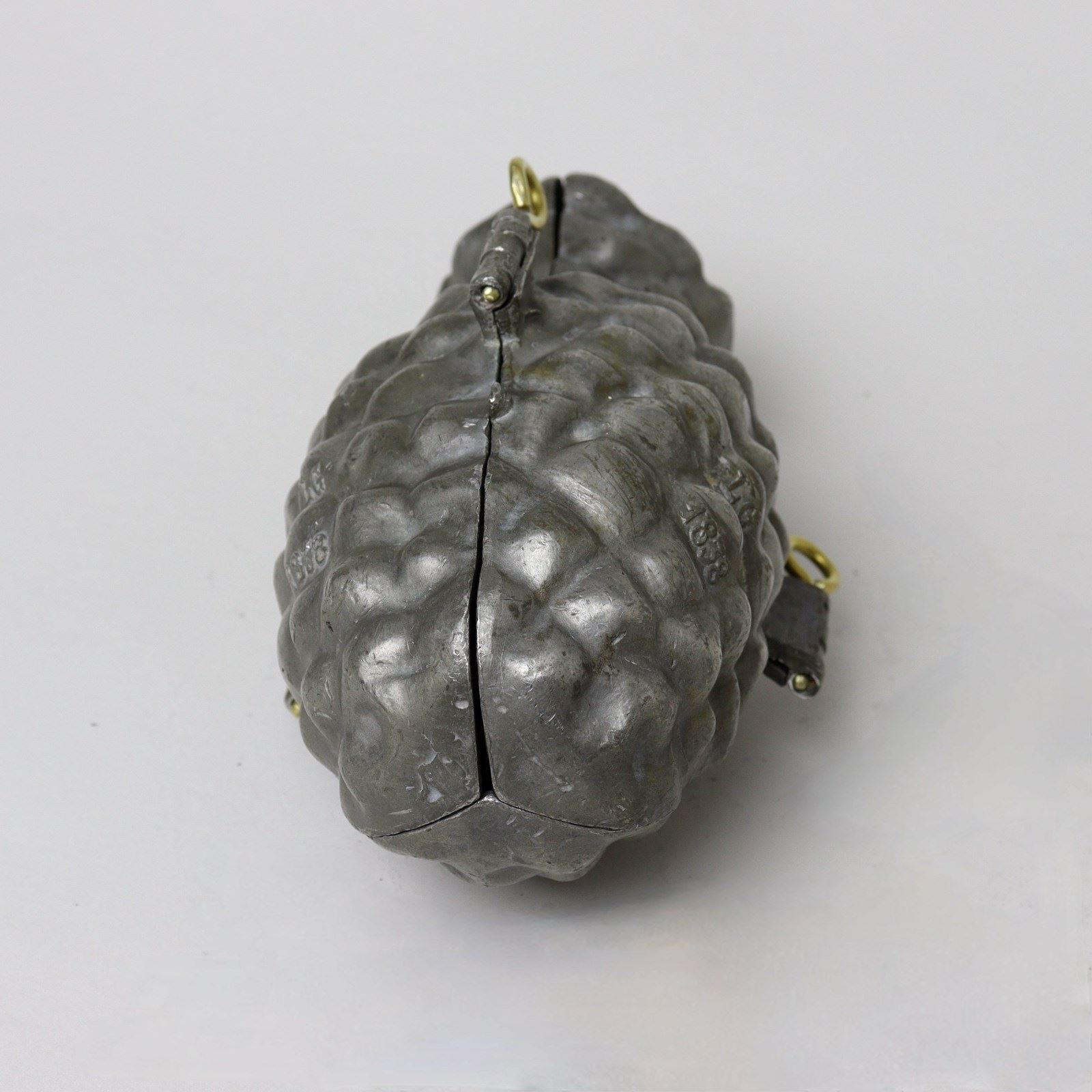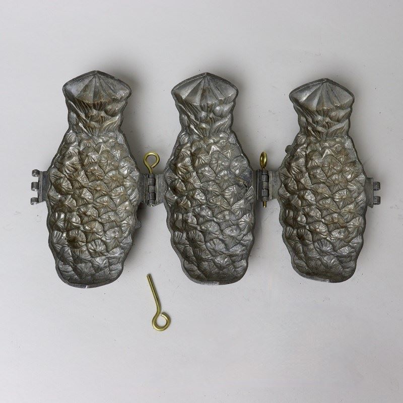 A three part, hinged pewter ice cream mould in the shape of a pineapple. All three parts are marked “L G” and they are also marked with the pattern number “1838”. These are the marks of the French company Letang who, in the 19th century, were one of the leading French manufacturers of metalware for the kitchen. It dates from c.1870. The three parts are held together by brass pins which are all replacements. The pineapple is very naturalistically modelled, with excellent detail, and it would turn out well. At some time one of the hinges has broken and this has a historic repair which can be seen in one of the images. Otherwise the mould is in good condition. The interior is still in usable condition and the exterior has a lovely, dark patina.