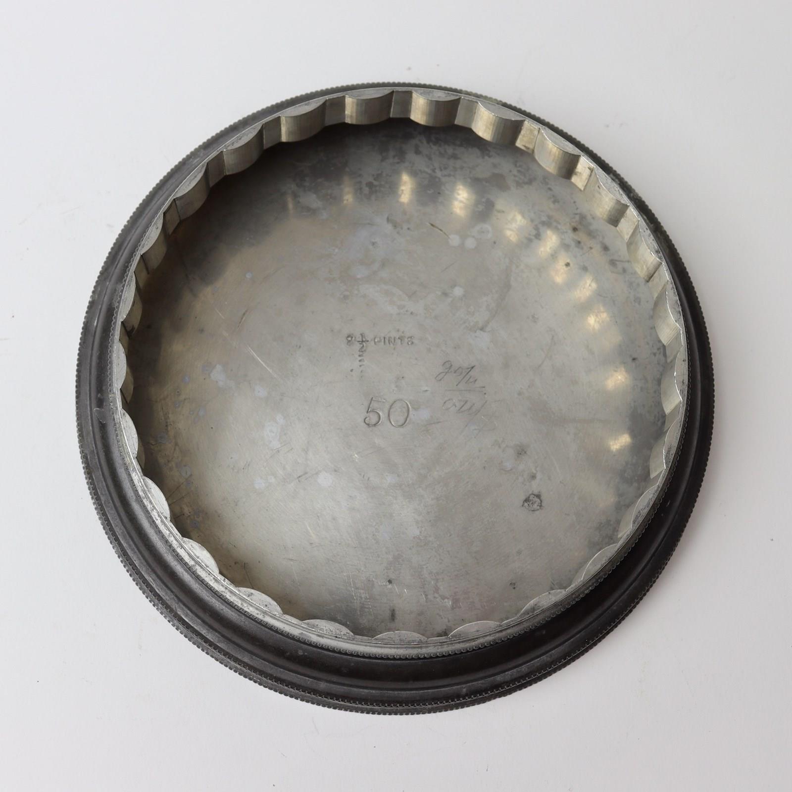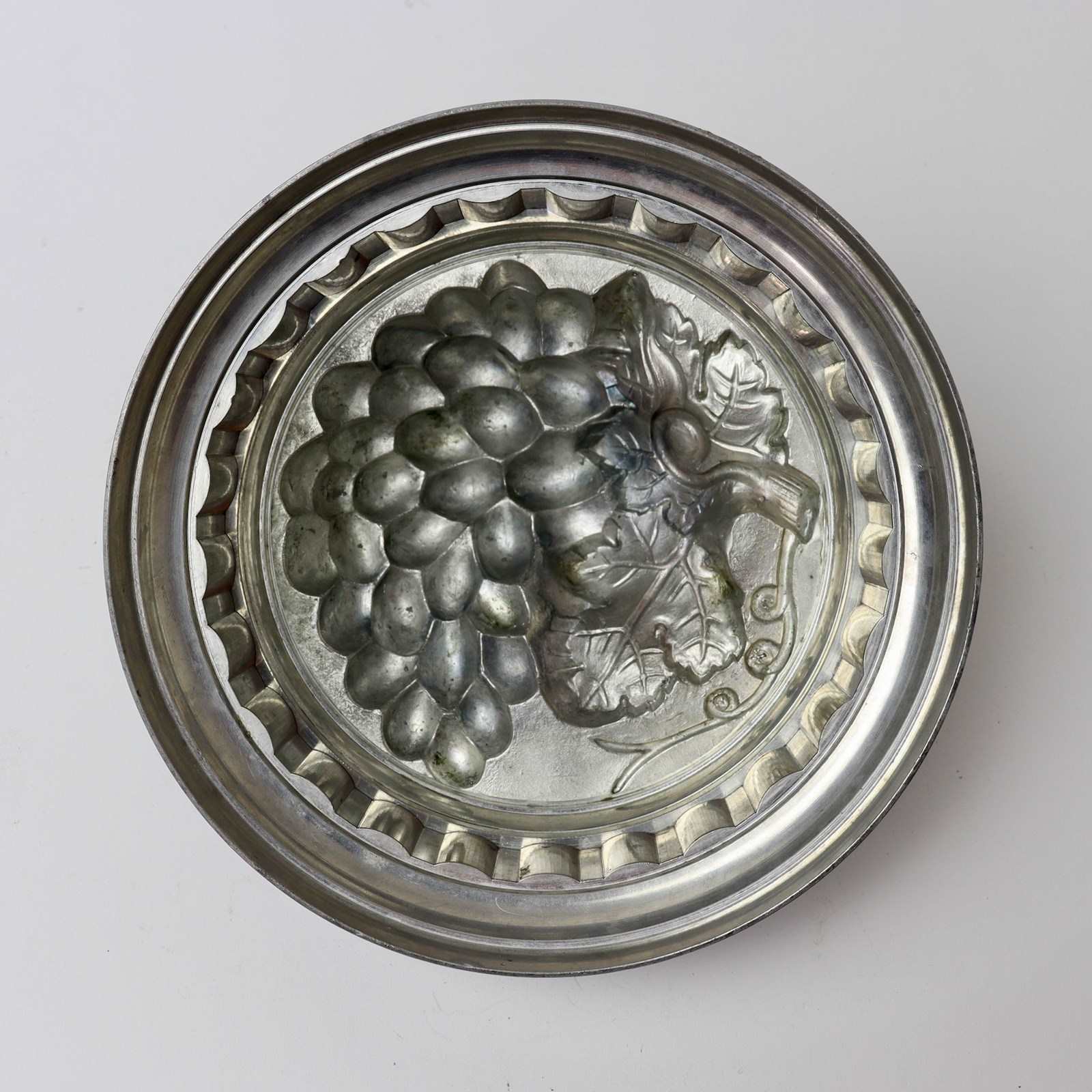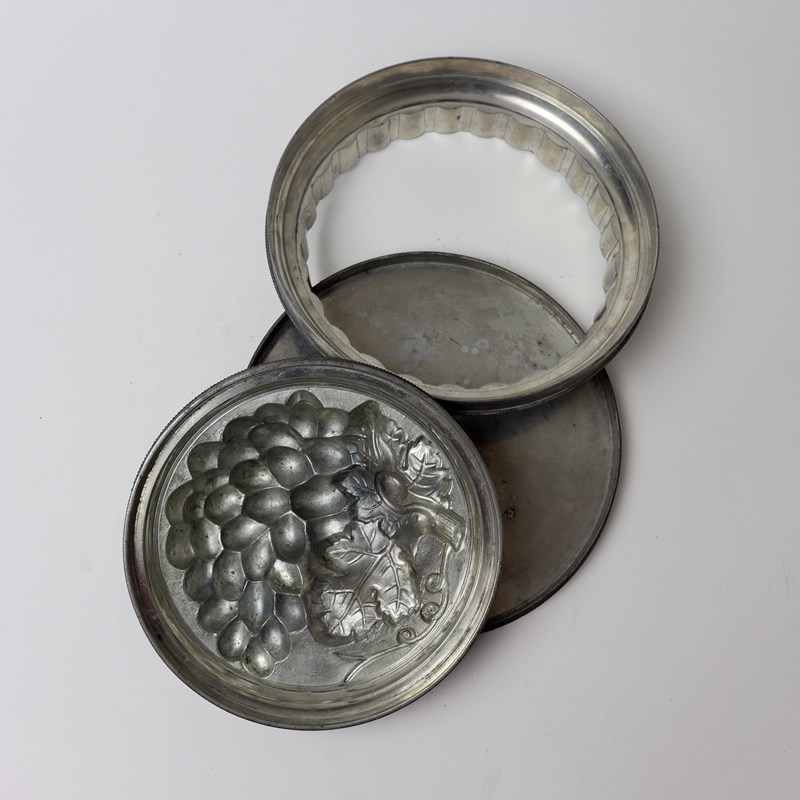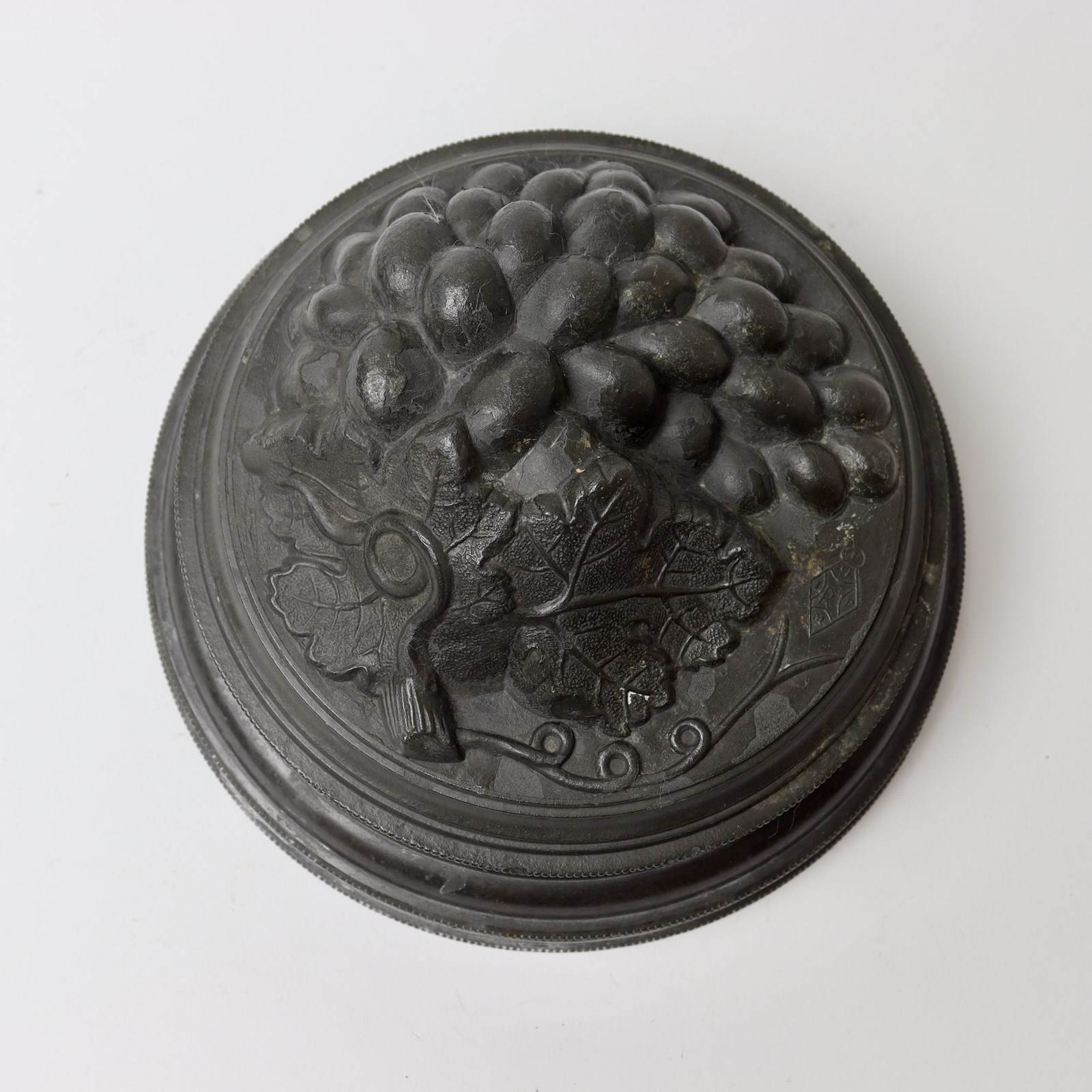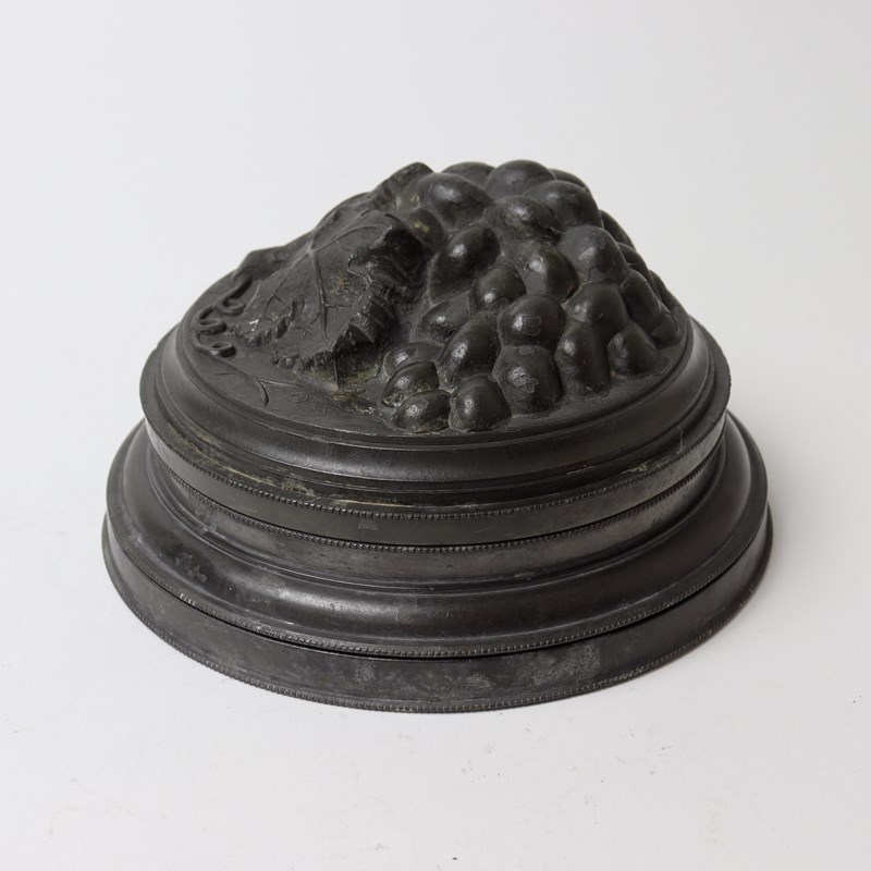 A large, three part, pewter ice cream pudding mould with a bunch of grapes to the top. This is English and it dates from c.1880. The base is marked with the capacity “2 1/2 PINTS” and a number ”50” which is probably the pattern number. The lid, or top section of the piece, is marked with a registered design Kite Mark which would date the registration of the design to the 9th of June 1877. The lid is beautifully moulded with a bunch of grapes and this would turn out well. The mould is in excellent condition. The interior is in very good, bright, usable condition and the exterior has a dark patina.