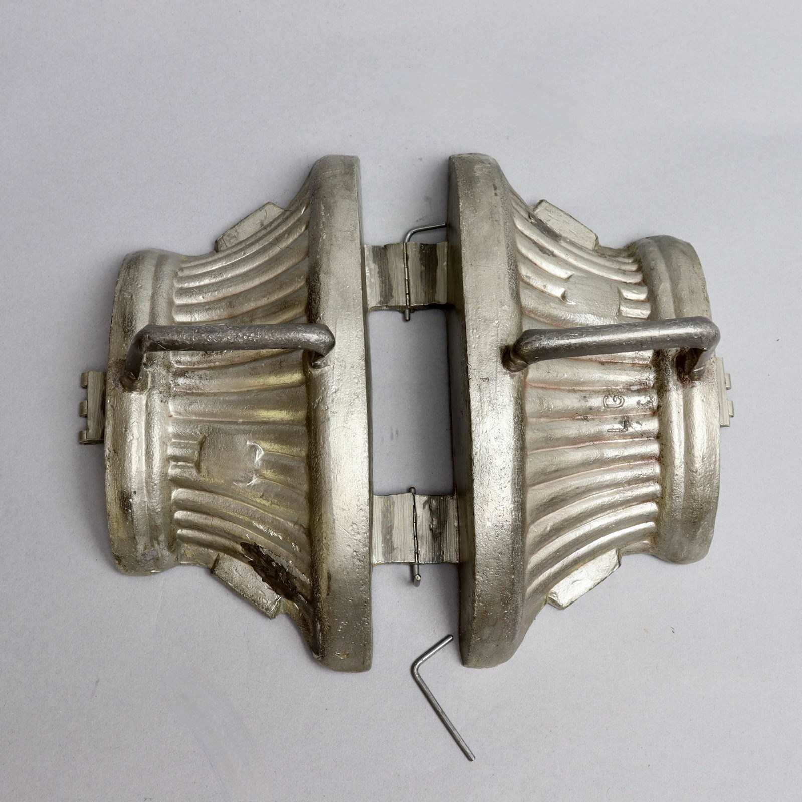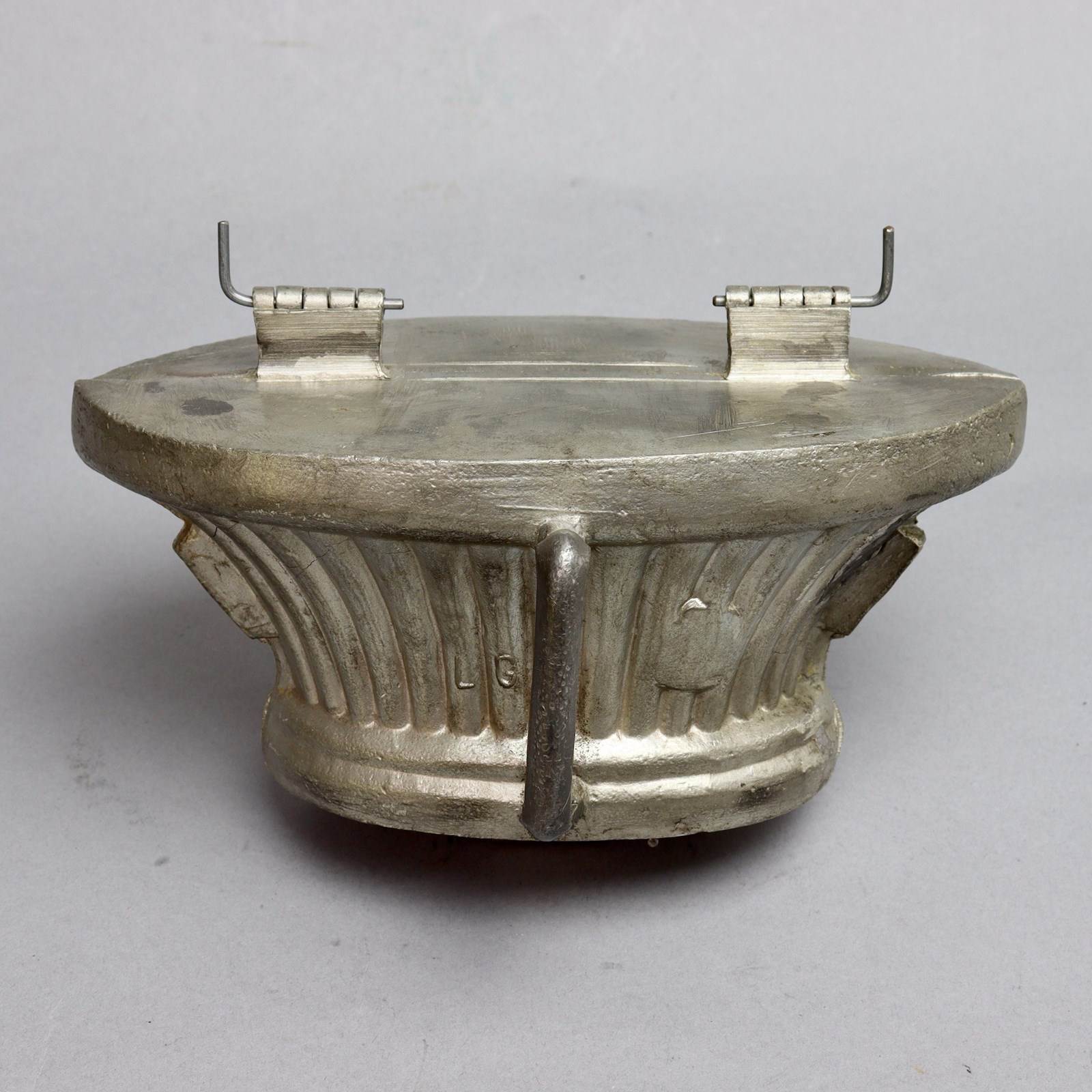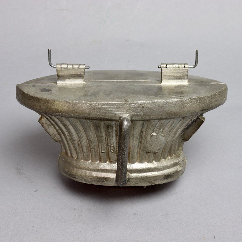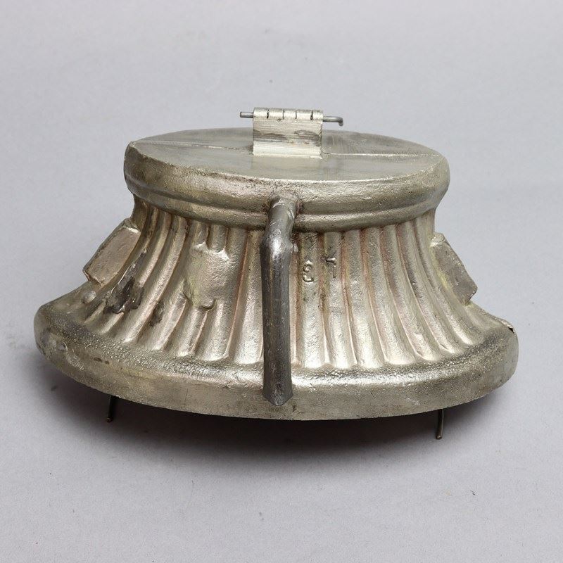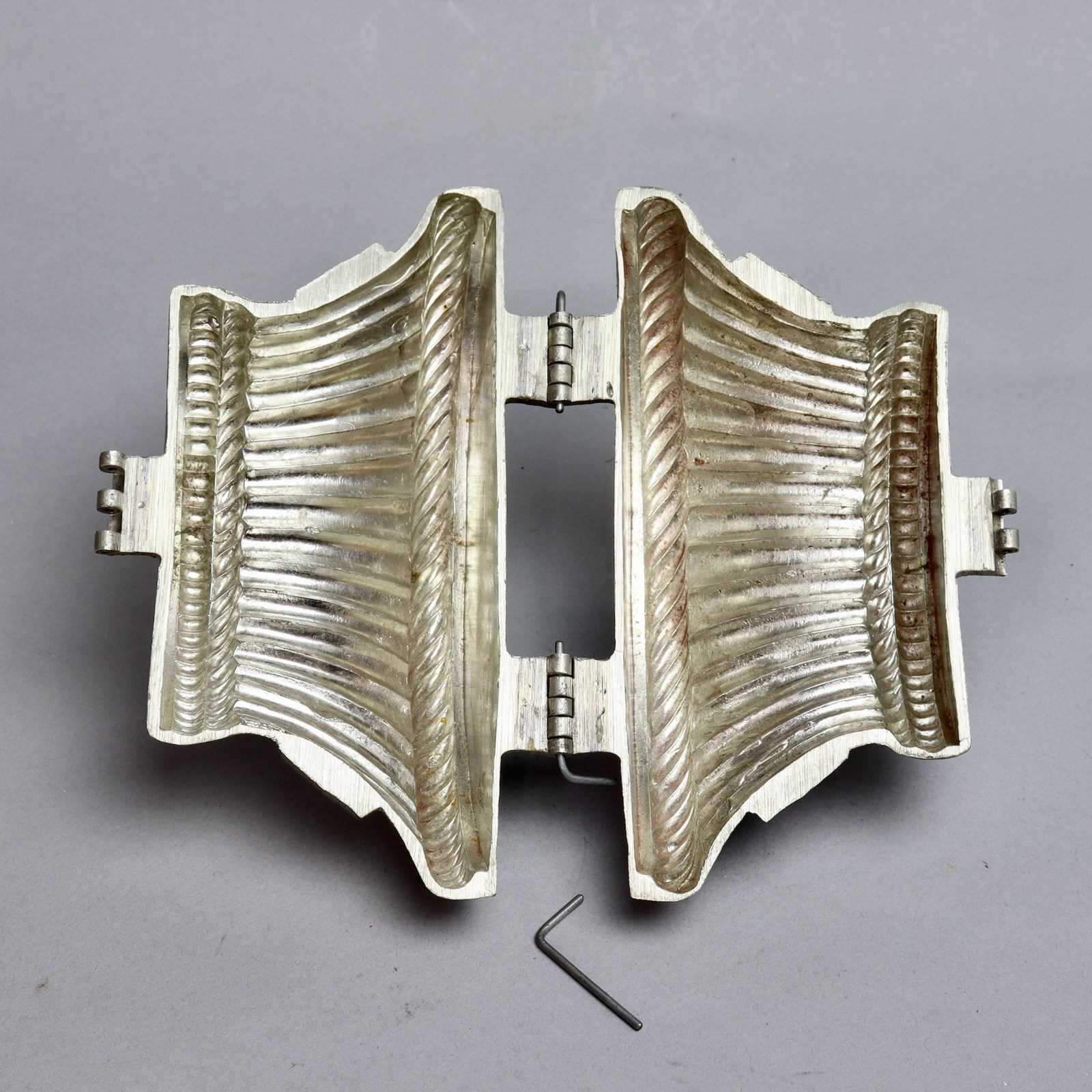 A large pewter ice cream mould in the shape of a basket. This is marked, in the casting to both sides, “L.G”. This is the mark of the French company Letang and it dates from c.1890. The design is well detailed and this would probably have been made in ice and then topped with small fruits or flowers made from ice cream. To either side of the mould there are dark patches at one end. These are repairs which would have been done during the manufacture as there must have been a fault in the casting. The faults did not go through to the interior. Otherwise the mould is in very good condition and the interior is in extremely good, bright, usable condition.