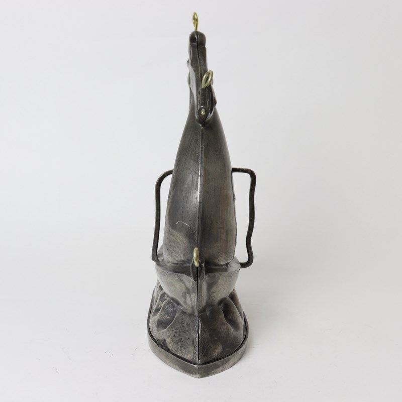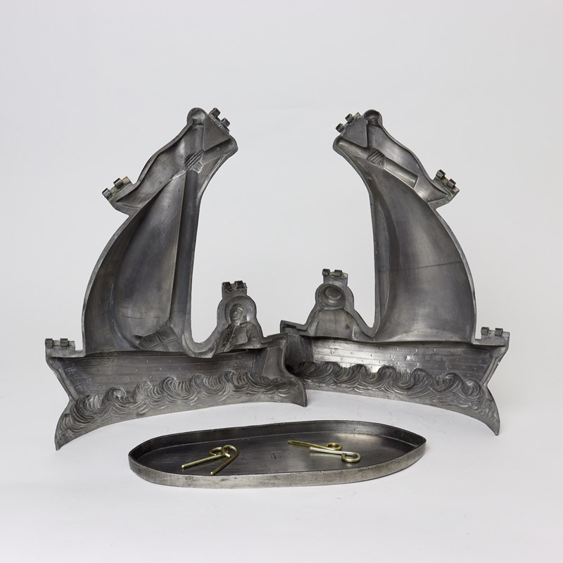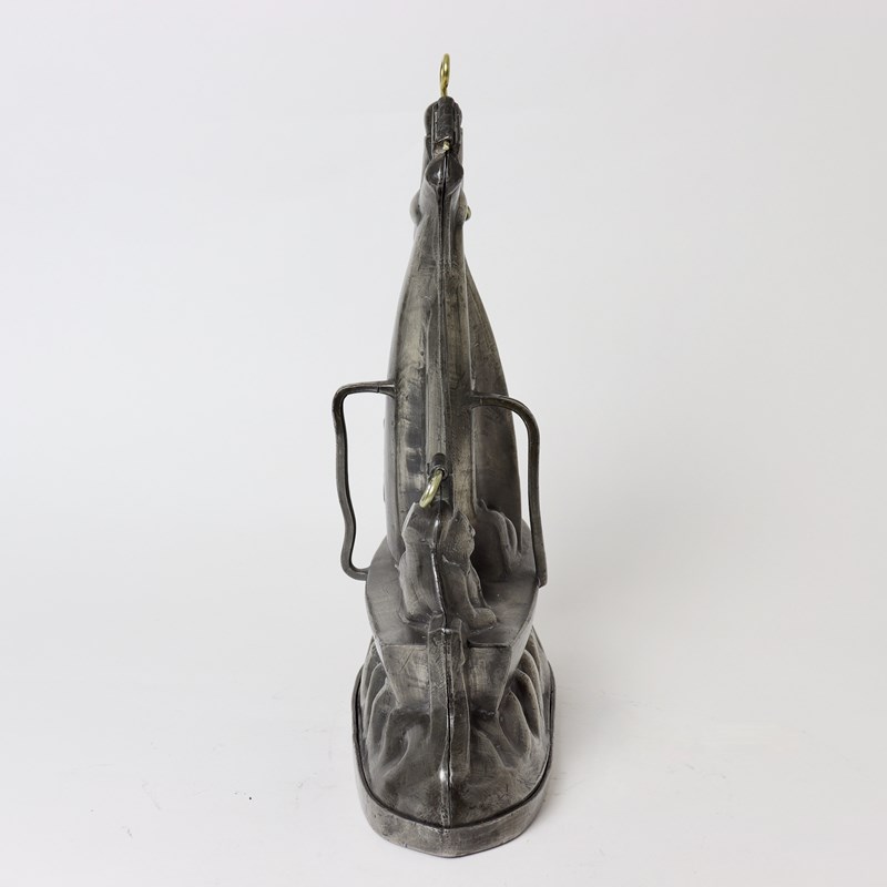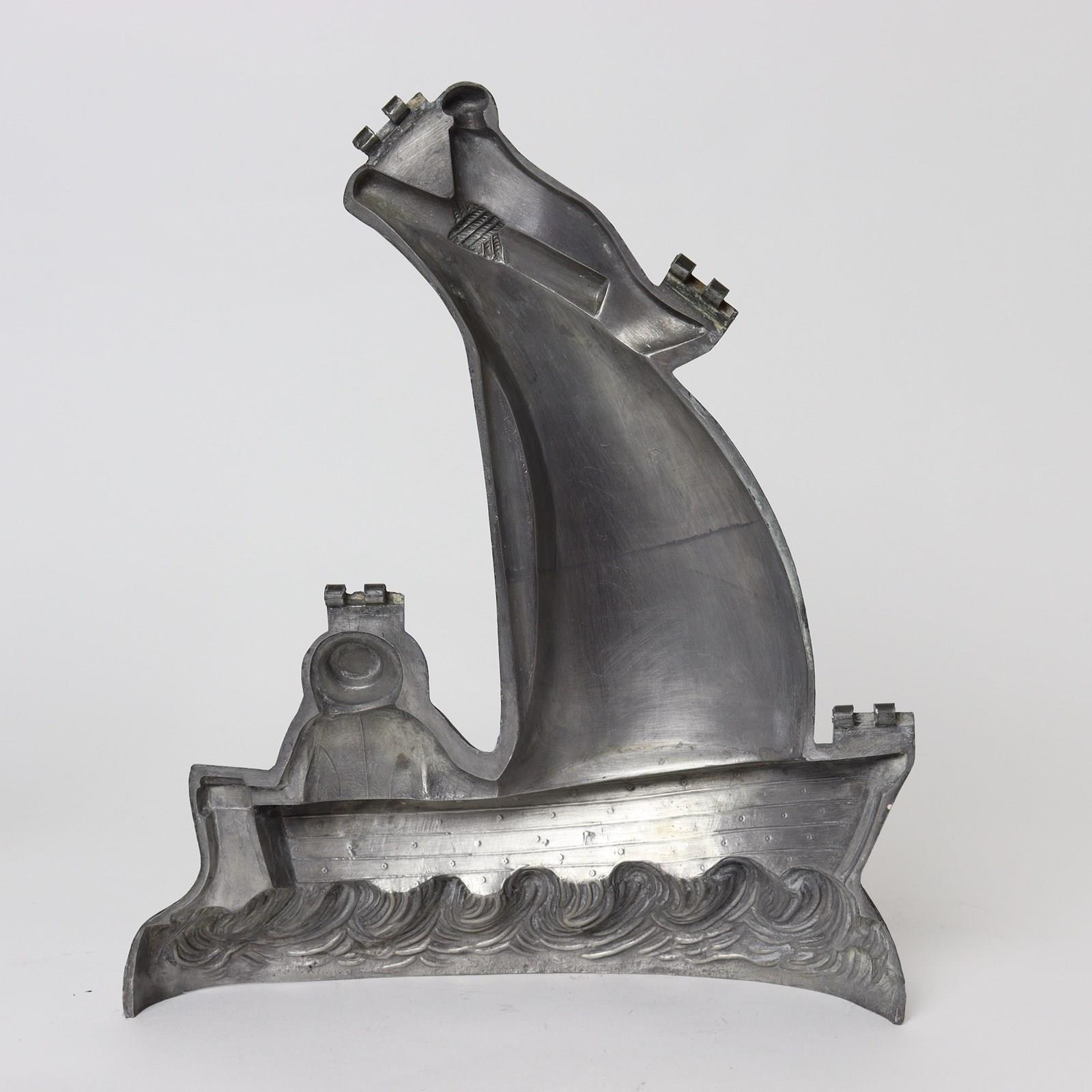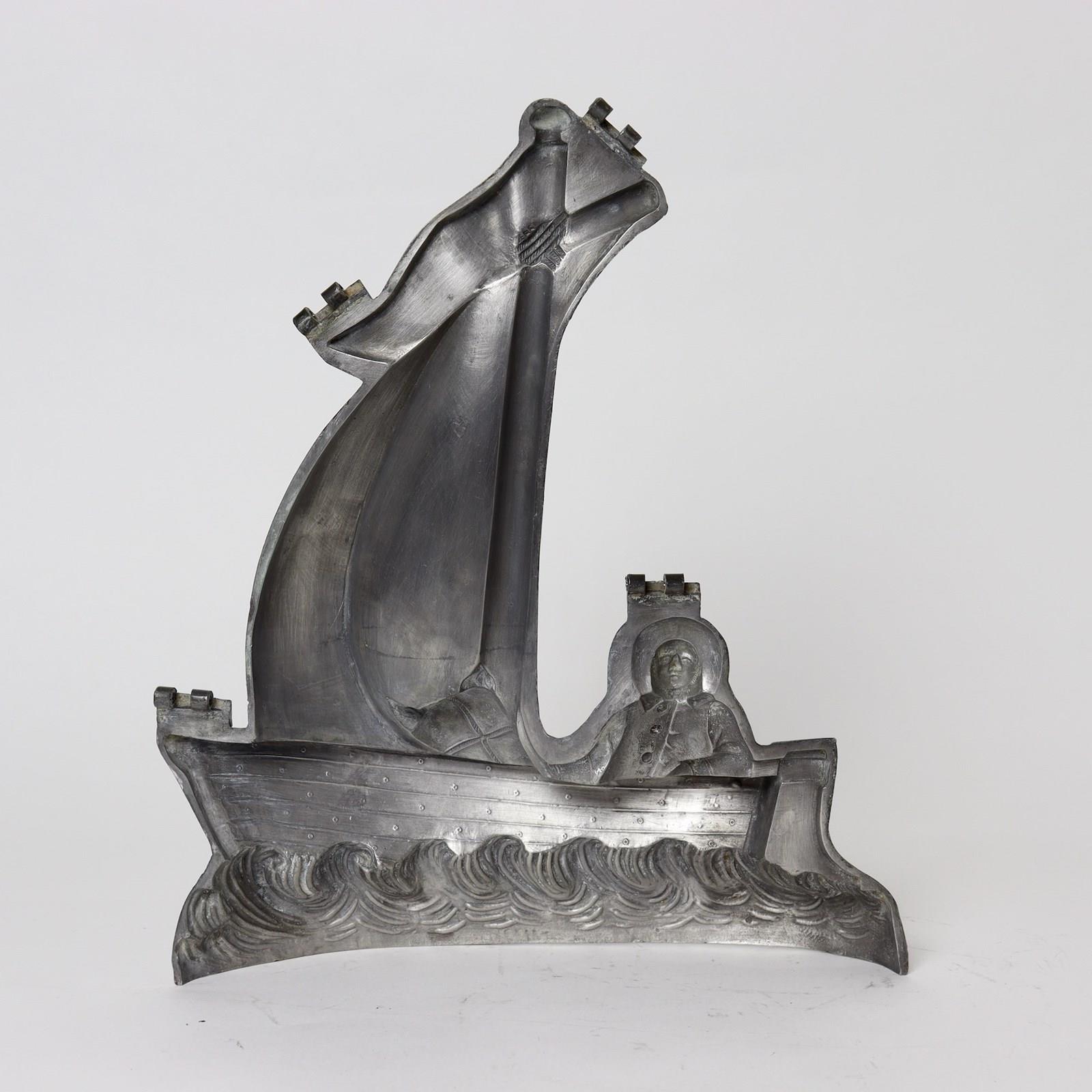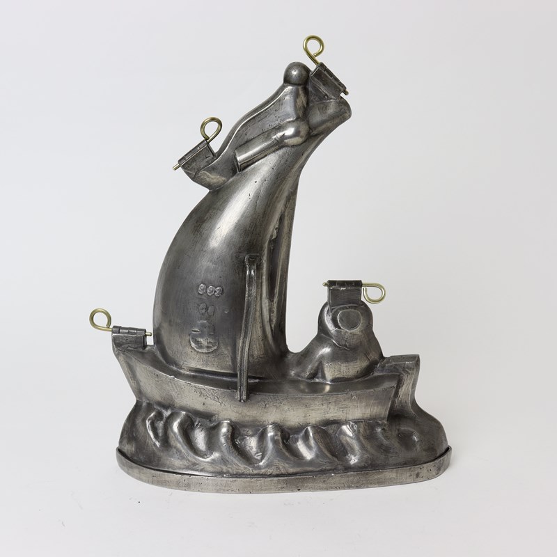 A rare, large, three pewter ice cream mould in the shape a yacht in full sail. This is marked, in the casting, “C.C” which is the mark of the French company Cadot, and there is also a pattern number “992”. However, there was a further mark which has been erased. The interior of the base is marked “BREVETTE S.G.D.G” but the is also partially erased. It dates from c.1880. The modelling to the interior is very well detailed and would turn a three dimensional yacht with a sailor at the helm. The mould is in excellent condition and is complete with its original pewter base. The interior is in very good, bright, usable condition and the exterior of the mould has a dark but shiny patina. It is held together by brass pins and these are replacements.