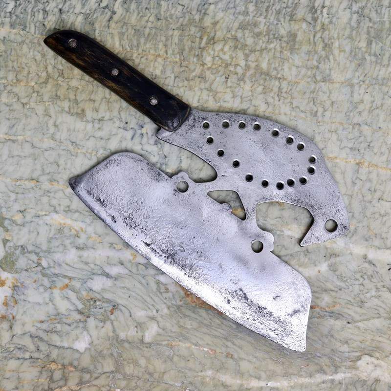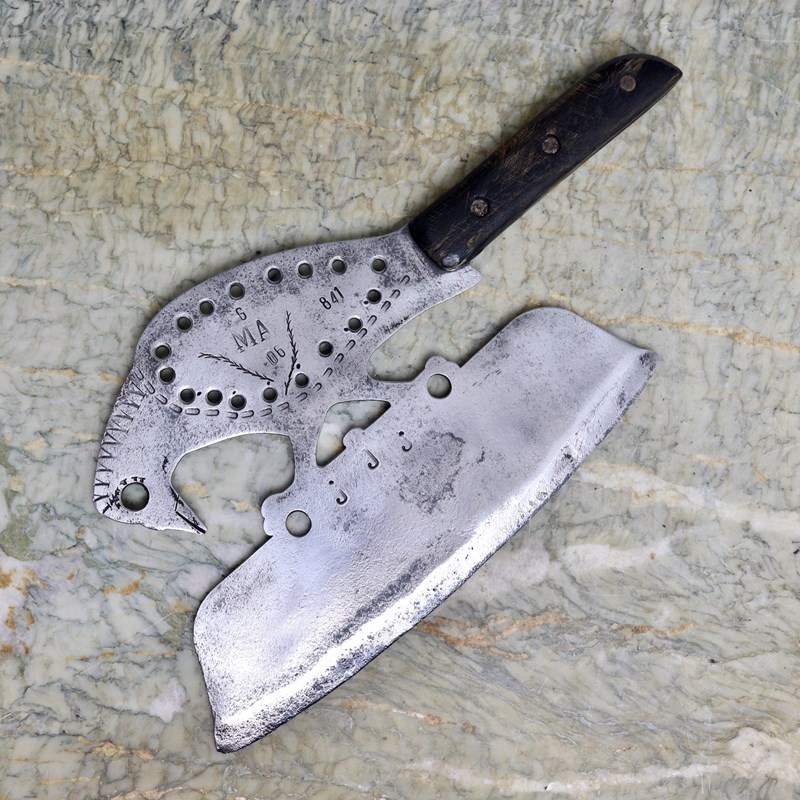 A large, and very heavy, early 20th century, steel cleaver in the shape of a bird. This is German and it dates from c.1920. It has a number of different letters and numbers stamped in the steel. There is “6” over “MA” over “06” and then a separate “841” and “JJJ”. Some of the design on the blade has also been applied using number and letter stamps. The piece has a very simple, carved wooden handle which is attached by steel rivets. There is pitting to the steel, from use, but otherwise it is in very good condition.