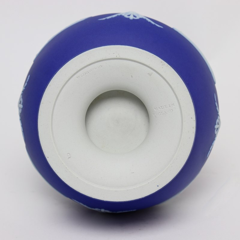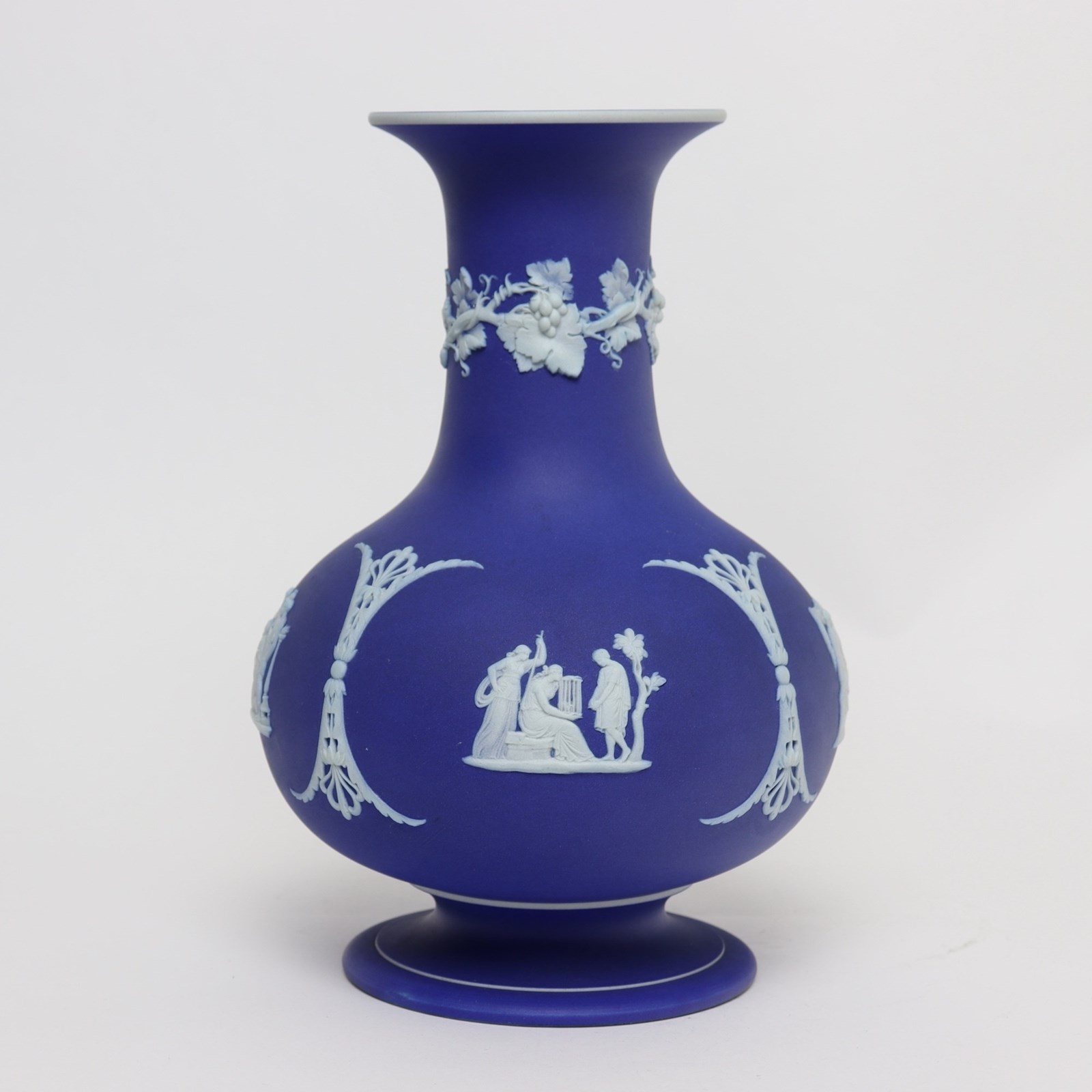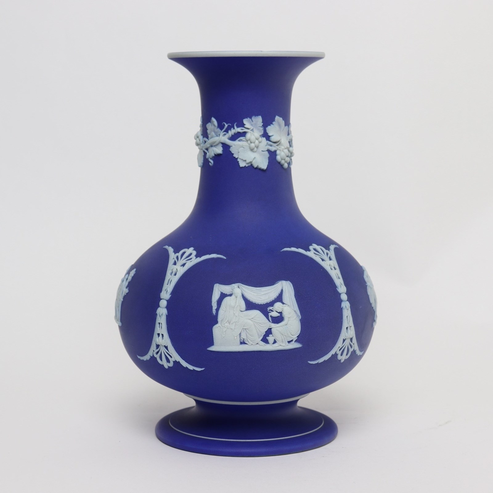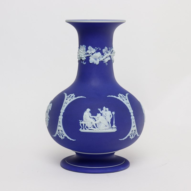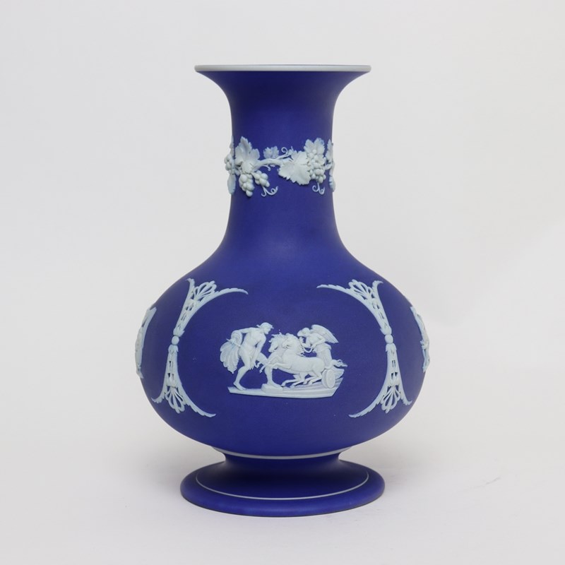 A large, Wedgwood, dark blue jasper dip, baluster shaped vase. This is marked ”WEDGWOOD MADE IN ENGLAND” and it dates from c.1920. It is also impressed with a number “9”, which relates to its height in inches, and a letter A. It is decorated, in white relief, with four different scenes from classical mythology, set between anthemion. To the neck of the vase is a band of grapes and vine leaves. The reliefs are all very good quality and the jasper dip is a lovely, rich shade of blue. The vase in excellent condition.