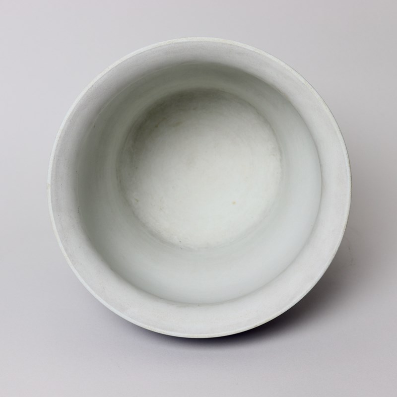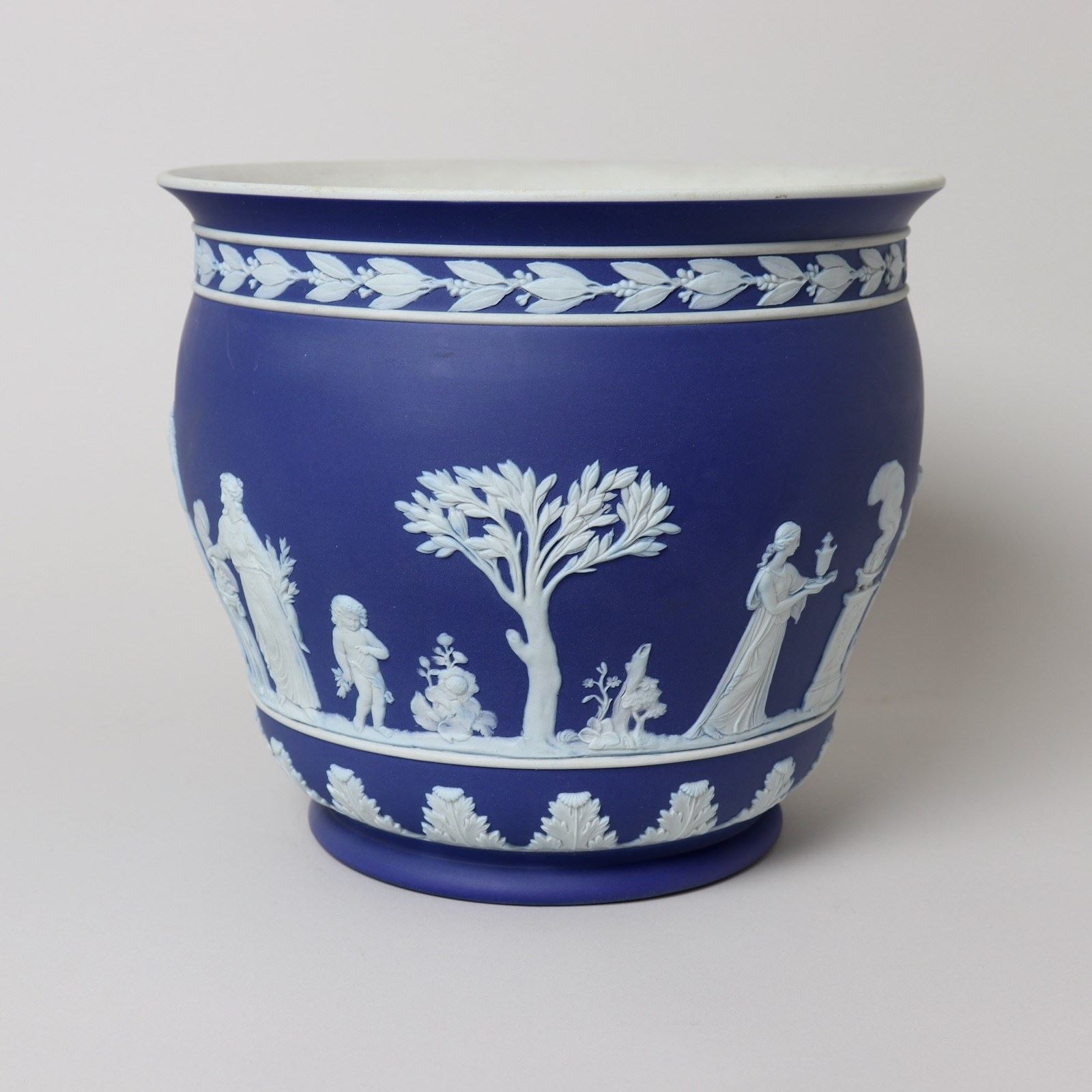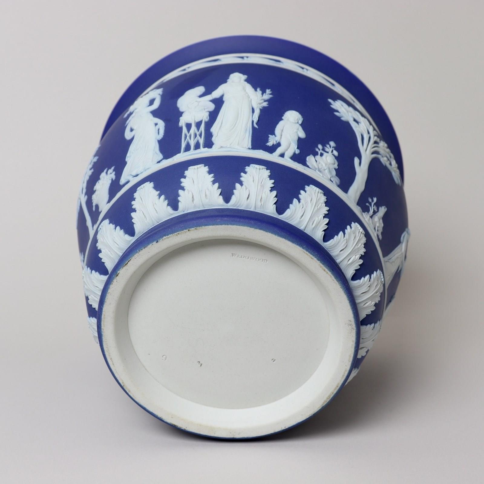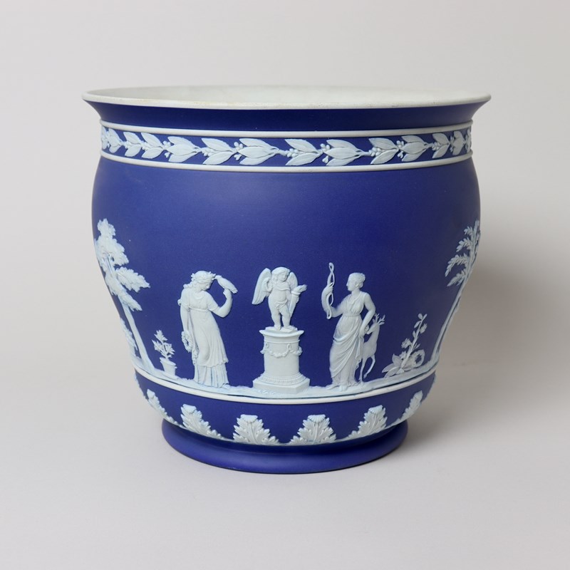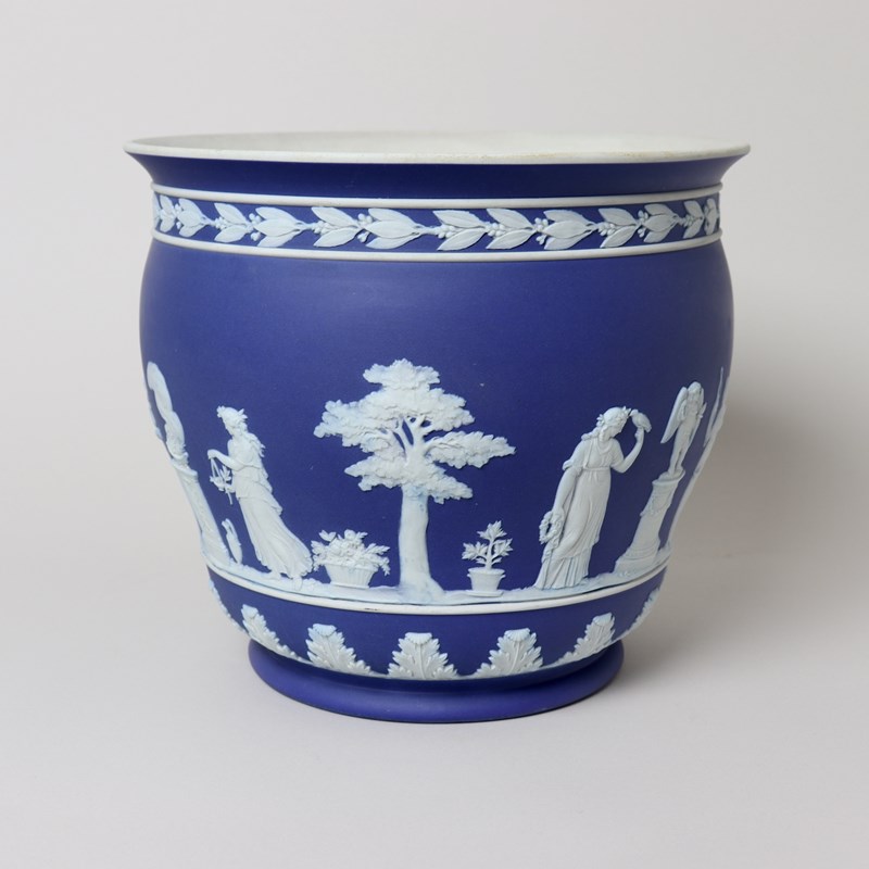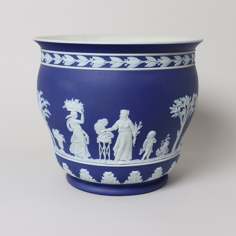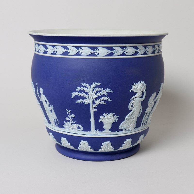 A large, Wedgwood, dark blue jasper dip, ogee shape jardiniere. This is marked ”WEDGWOOD” and it dates from c.1860. It is also impressed with a number “9”, which relates to its diameter in inches, and a letter W. It is decorated, in white relief, with a continuous band of classical maidens offering sacrifices. To the rim is a band of laurel leaves and berries and to the base is a band of acanthus leaves. The reliefs are all very good quality and the jasper dip is a lovely, rich shade of blue. There is a small firing fault on the relief depicting the pillar and this can be seen in one of the images. Otherwise the jardiniere is in very good condition.