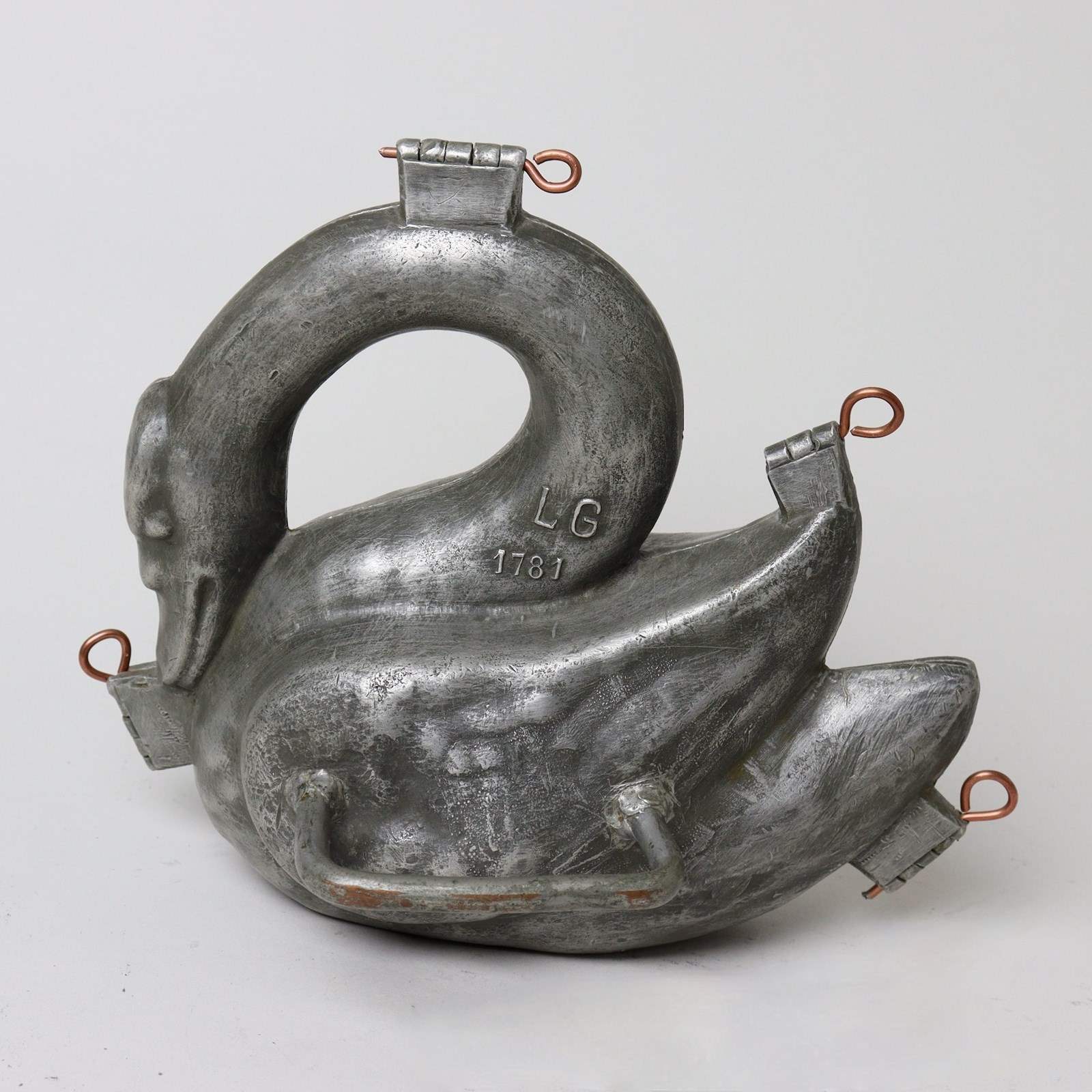 A large, pewter ice cream mould in the shape of a swan. This is marked “L G” in the casting to both sides. This is the mark of the French company Letang who, in the 19th century, were one of the leading French manufacturers of metalware for the kitchen. One side is also marked with the pattern number “1781”. It dates from c.1880. It is made in two parts which are held together by a series of copper pins, and, unusually, the handles to the sides are made from copper which has been tinned. The mould is beautifully, and very naturalistically, modelled as a swan. The interior of the mould is extremely well detailed and would turn out very well. It is in excellent condition. The interior of the mould is in very good, bright, usable condition and the exterior has a lovely, dark patina.