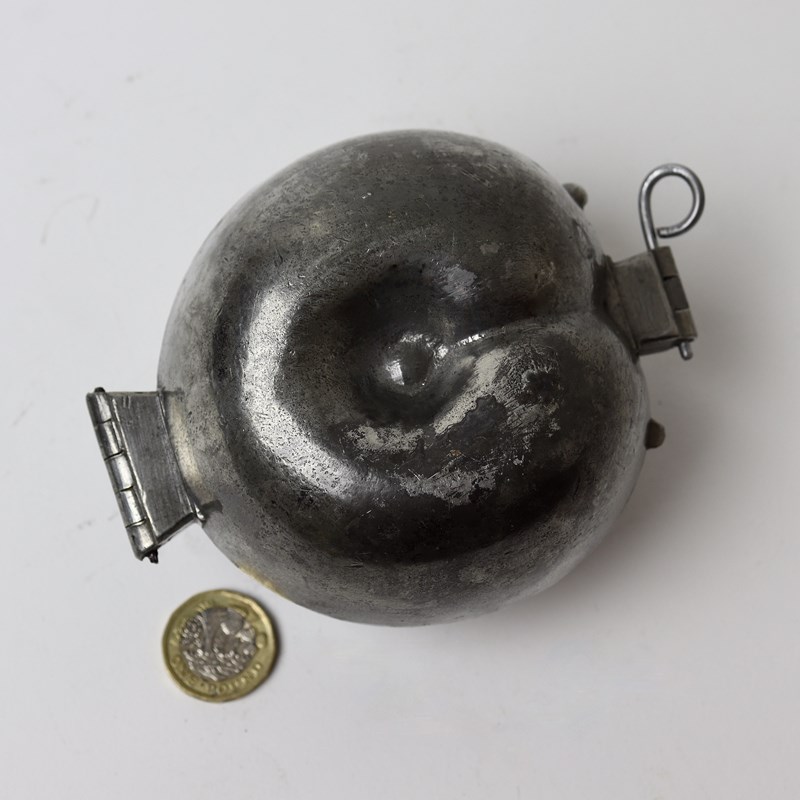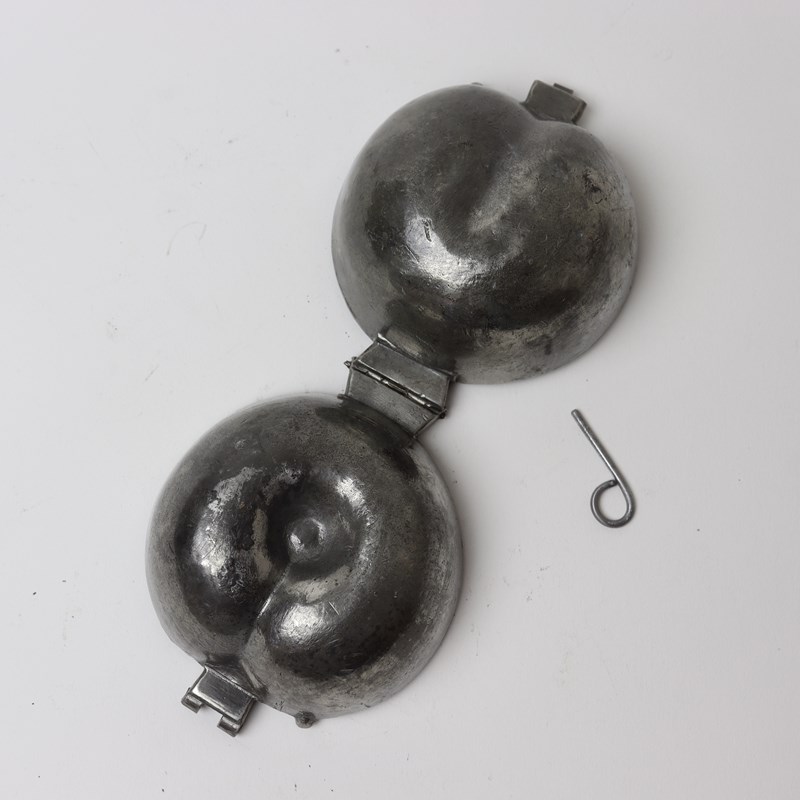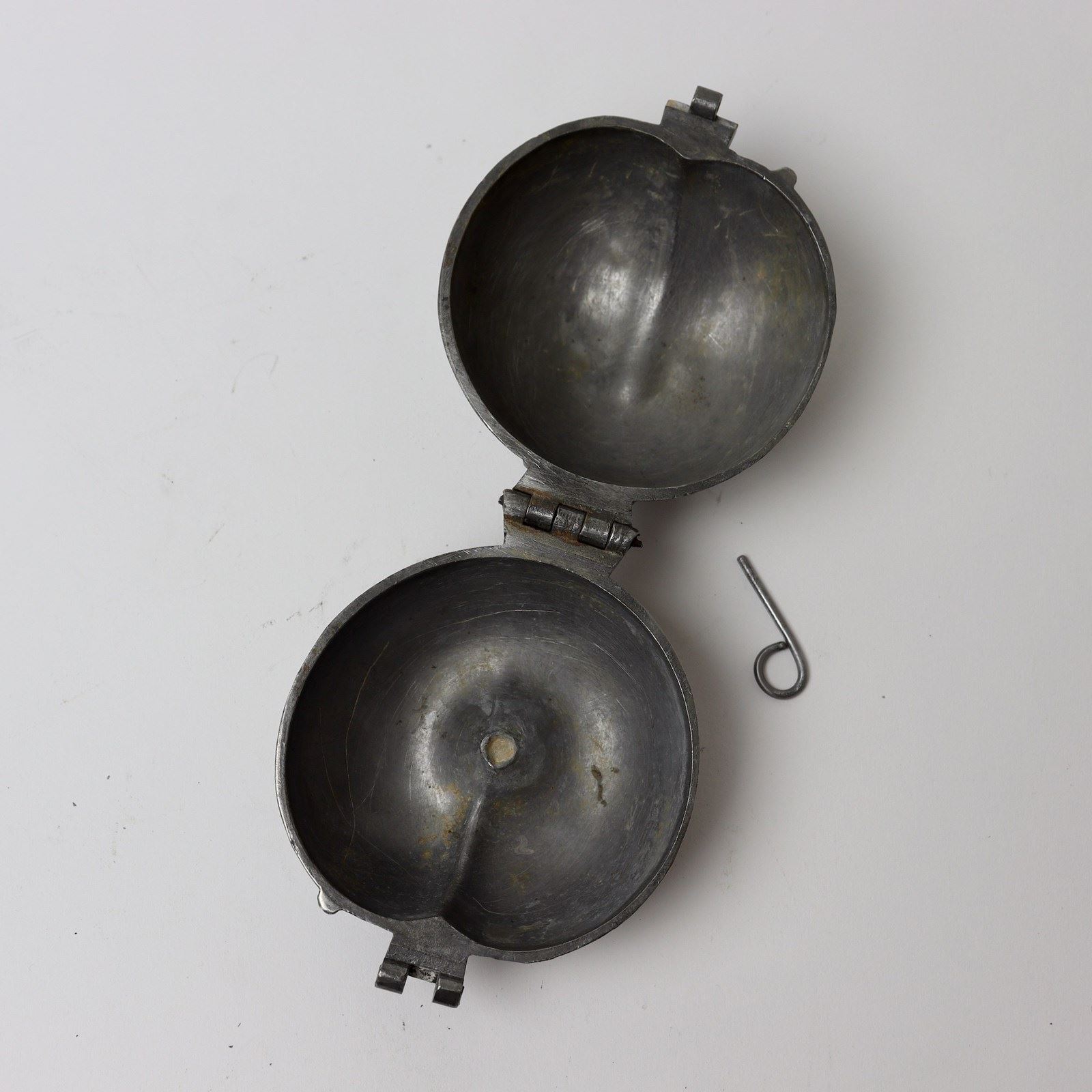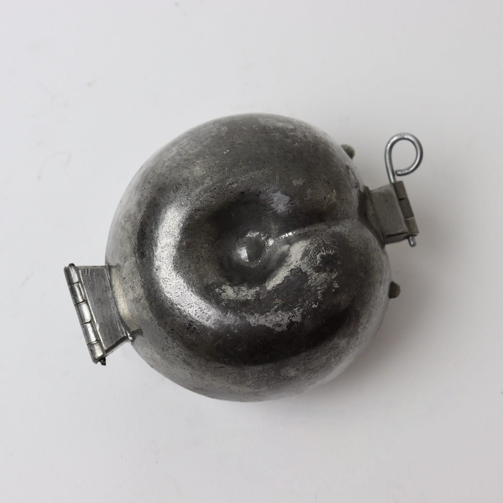 A life-size, pewter ice cream mould in the shape of a peach. This size of ice cream mould, which would turn out a fruit in a life-size form, is uncommon and hard to find compared to the small versions. This example is unmarked and it dates from c.1880. It is in excellent condition. The interior is in good, usable condition and the exterior has quite a dark, shiny patina.