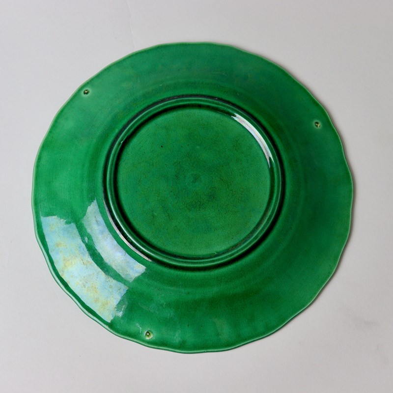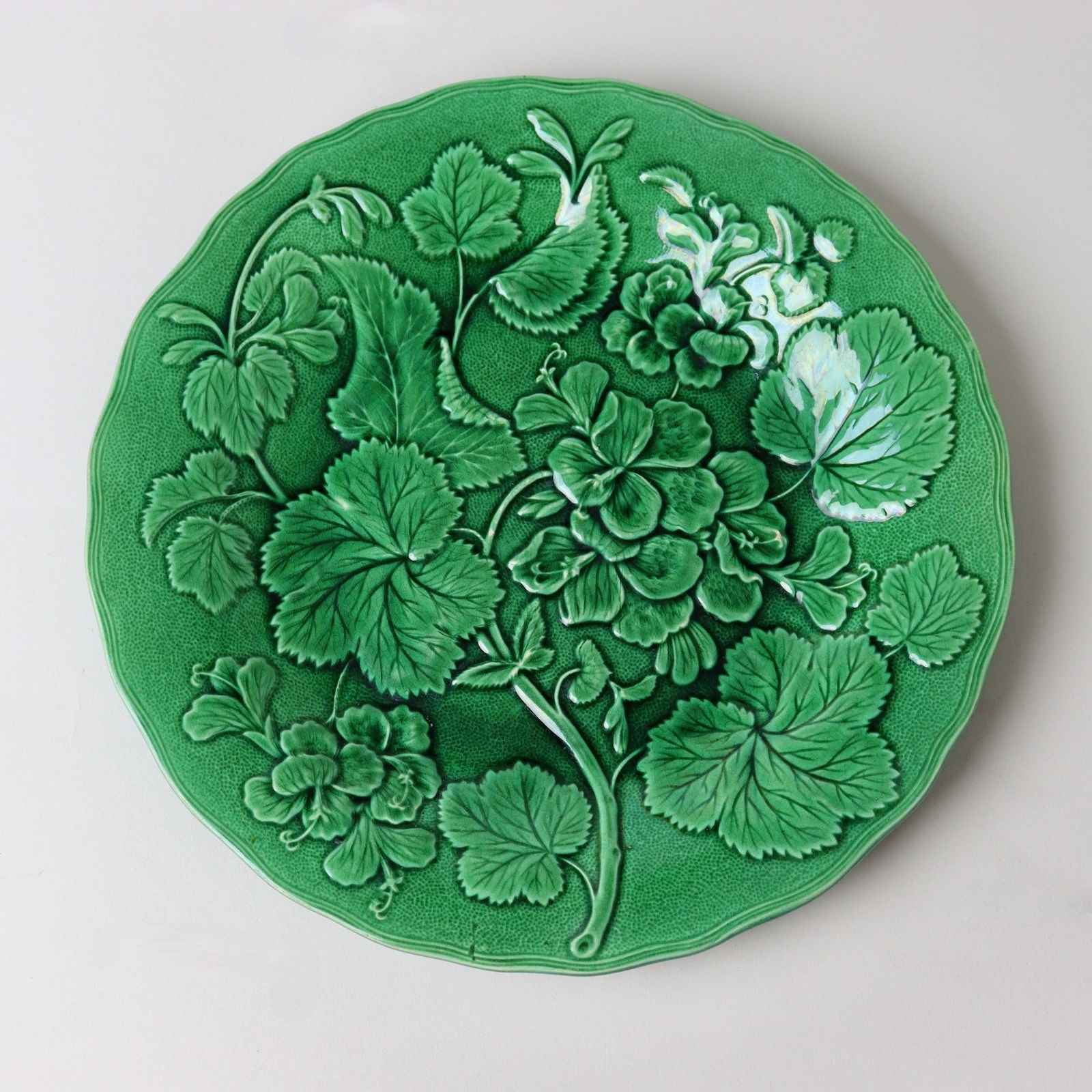 A very attractive, nineteenth century, green majolica glazed plate. This is moulded with geranium flowers and foliage against a stipple background. The moulding is very well detailed and the plate is covered in a mid green, majolica glaze. It is English and dates from c.1860. It is in excellent condition.