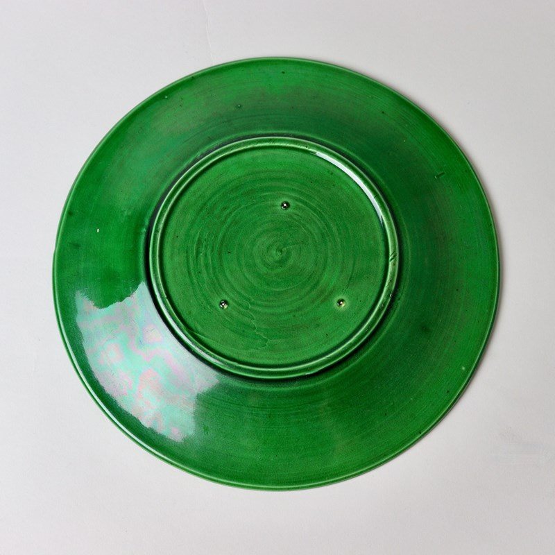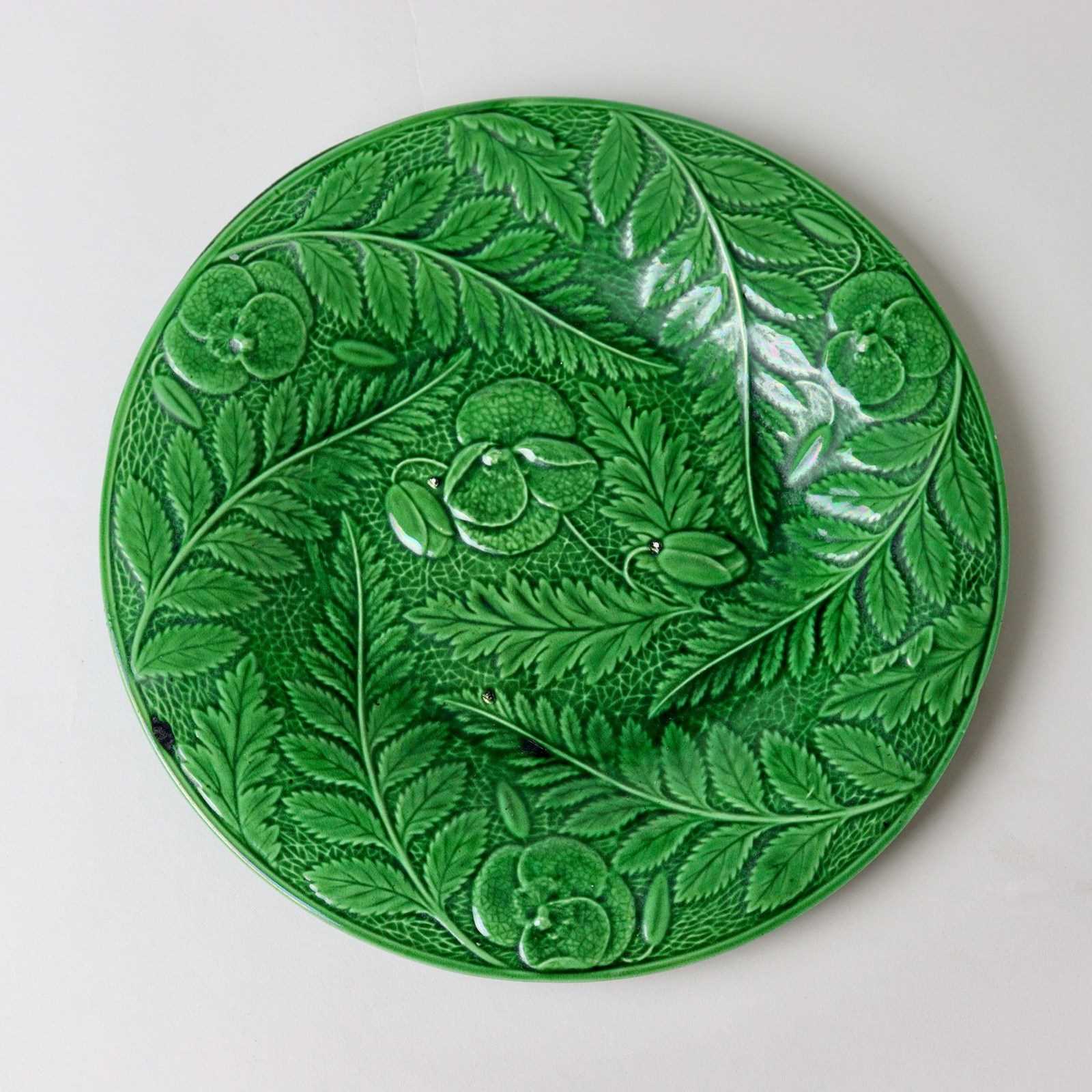 A nineteenth century, green majolica glazed plate. This is moulded with poppies and ferns. The moulding is very well detailed and the plate is covered in a mid green, majolica glaze. It is English and dates from c.1860. It is in excellent condition.