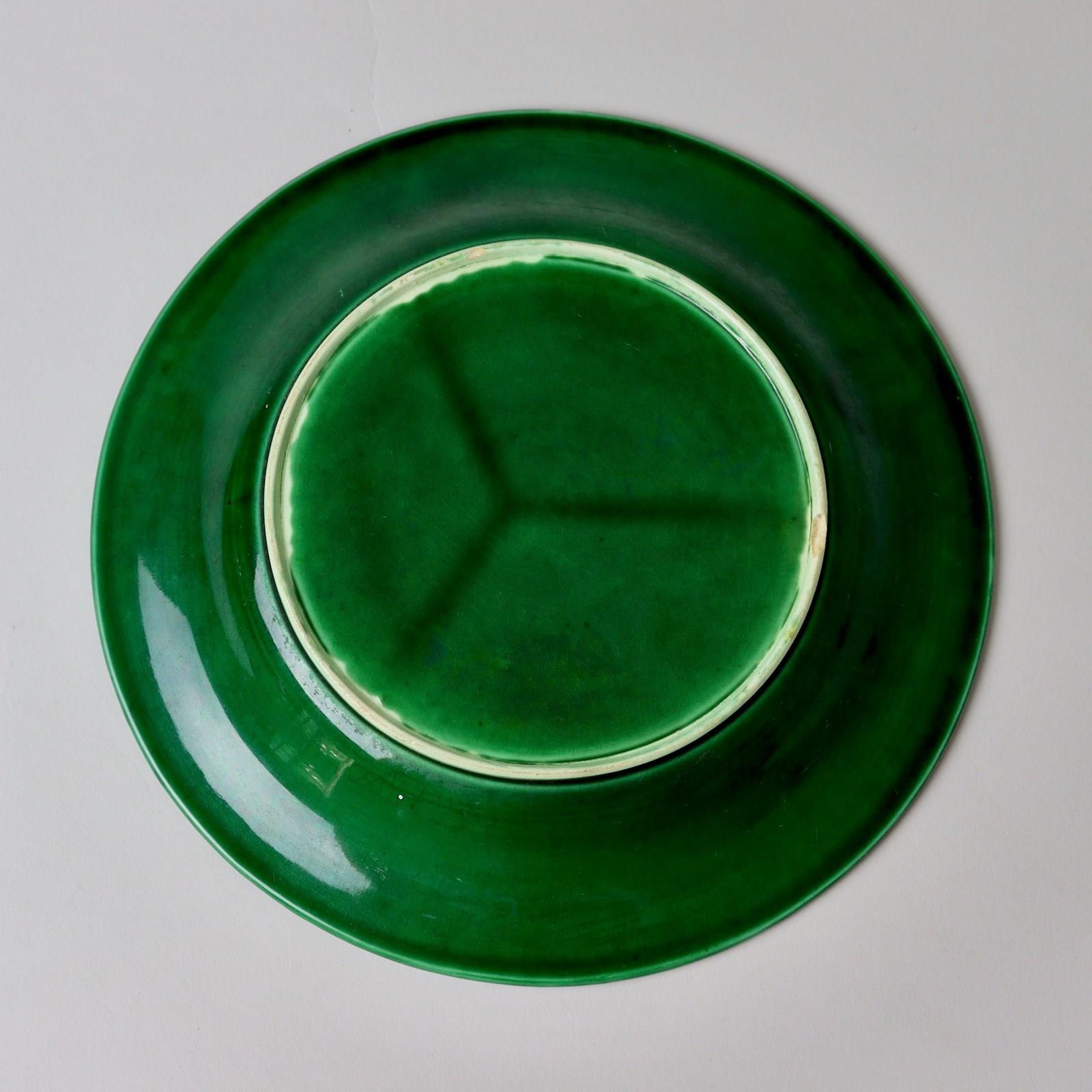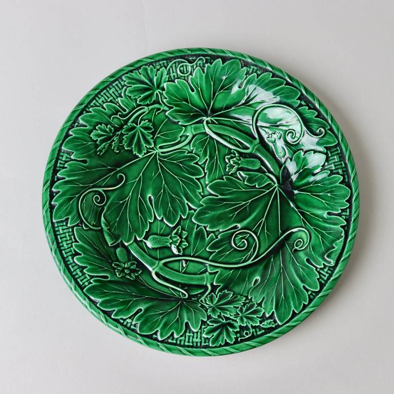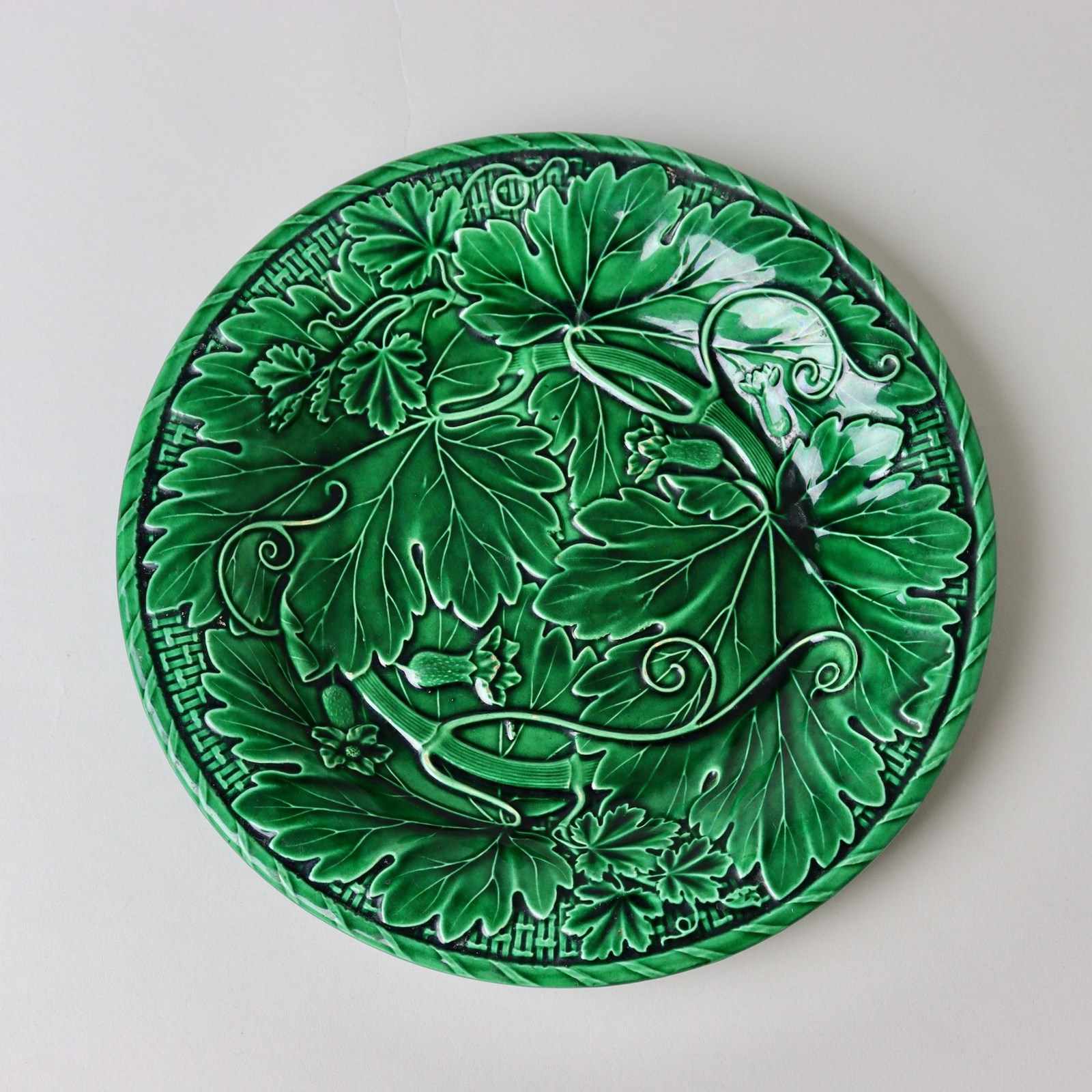 A nineteenth century, green majolica glazed plate. This is moulded with vines and small buds against a basket weave background. The moulding is very well detailed and the plate is covered in a dark green, majolica glaze. It is English and dates from c.1860. There is a chip on the foot rim but otherwise it is in good condition. The lines across the back are from where the glaze has puddled.