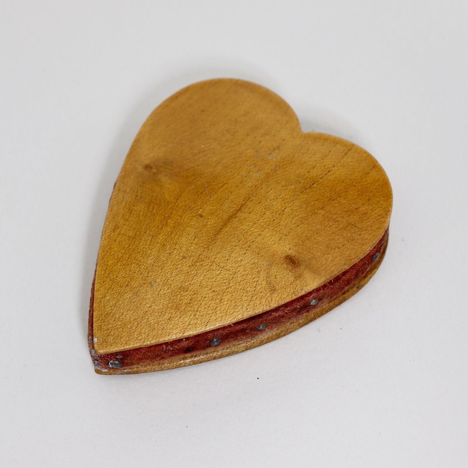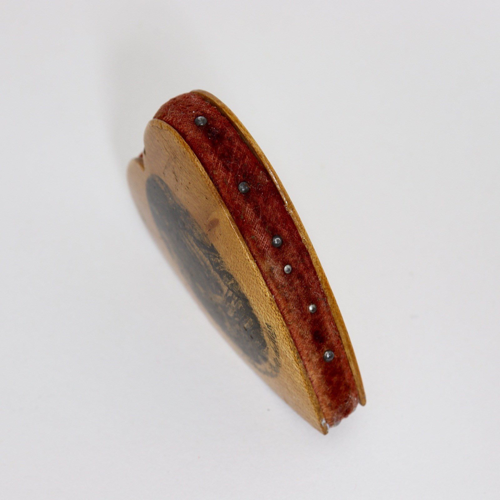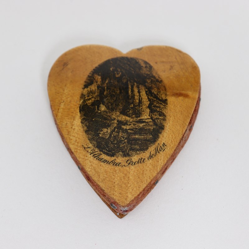 19th Century, Mauchline Ware, heart shaped pin cushion. Transfer printed with a French scene, L’Alhambra Grotte de Han. Date c.1880. Tiny chip to wood on rim, otherwise good condition.