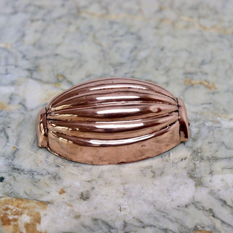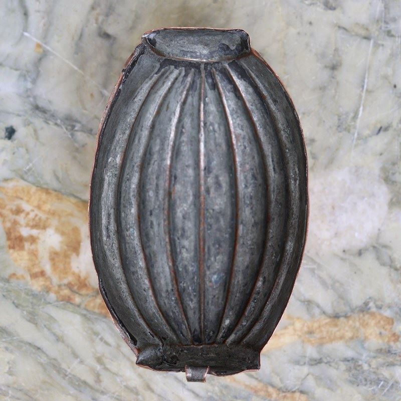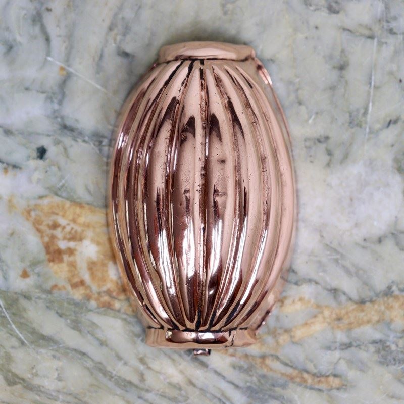 A miniature copper mould in the shape of a melon. This is French and it dates from c.1890. It is made from quite a light gauge of copper but it is well shaped. Originally there would have been a hanging loop at one end but this is now missing, although the fitting still remains. The mould is in good condition but the tinning, to the interior is worn.