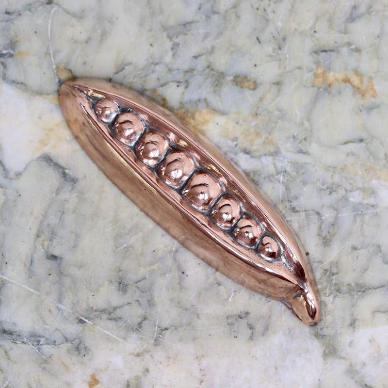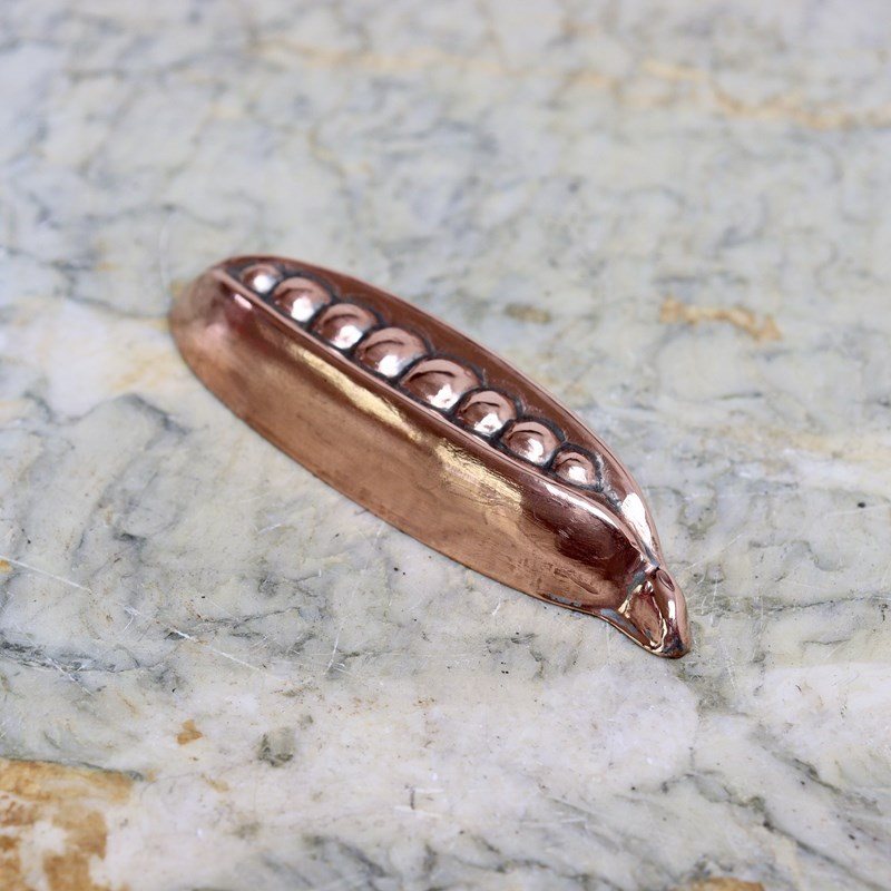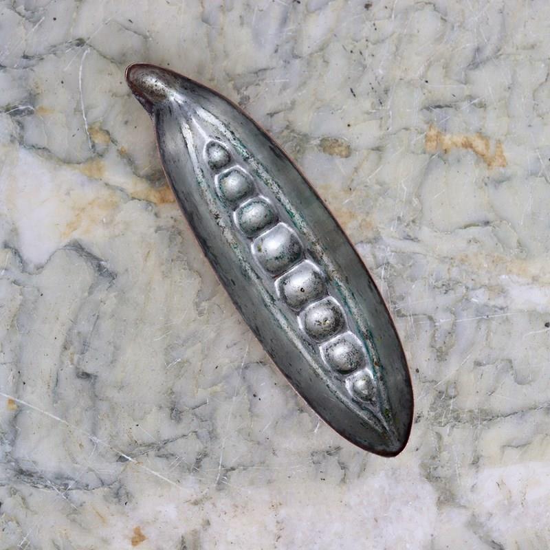 A miniature copper mould in the shape of a pea pod. This is English and it dates from c.1920. It is made from a light gauge of copper but there is very good detail in the design. Originally it would have been tinned all over but the tinning has been removed from the exterior revealing the copper beneath. The mould is in very good condition and the tinning, to the interior, is still in very good, bright, usable condition.