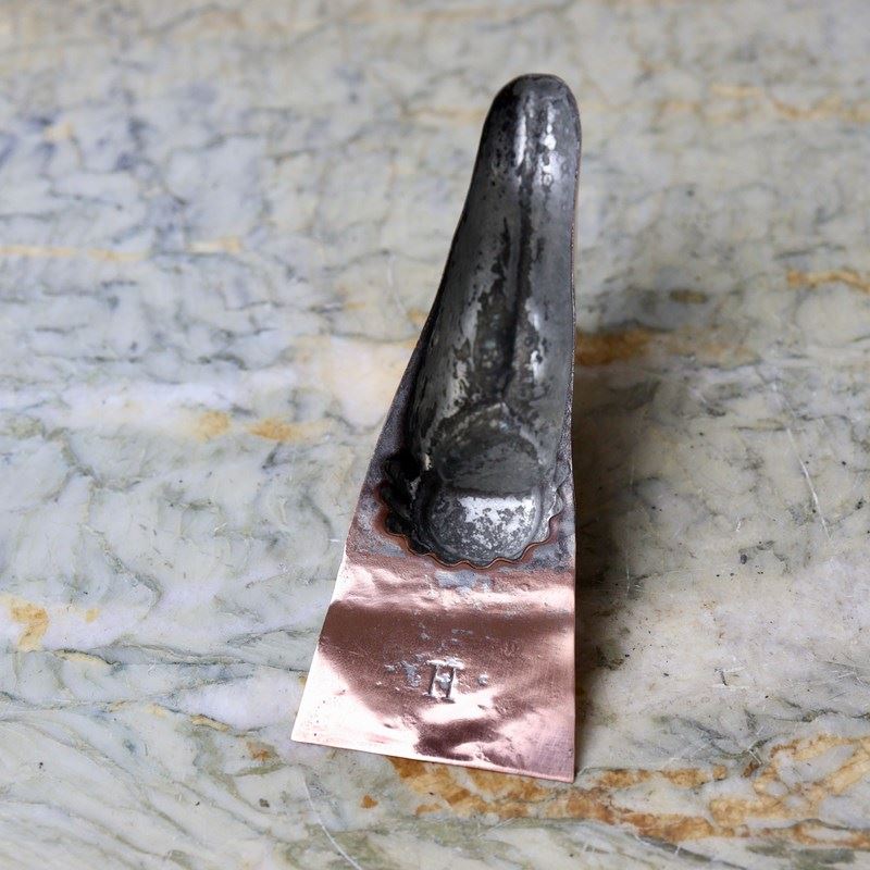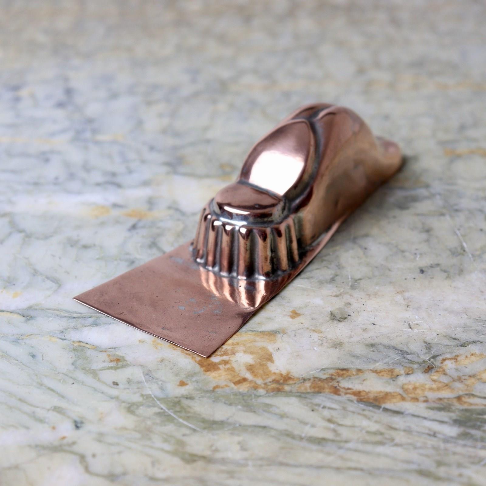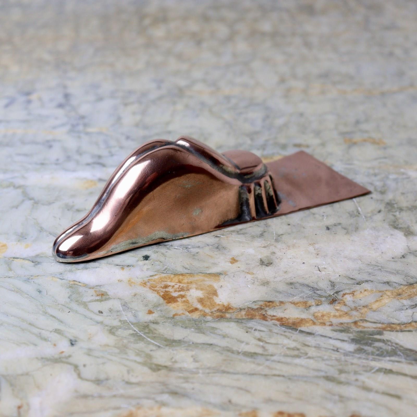 A miniature copper mould in the shape of a tongue. This is made from a light gauge of copper and it is stamped with a letter “H”. It is English and it dates from c.1920. Originally it would have been tinned all over, but the tinning has been removed from the exterior, revealing the copper beneath. The mould is in excellent condition and the tinning, to the interior, is still usable