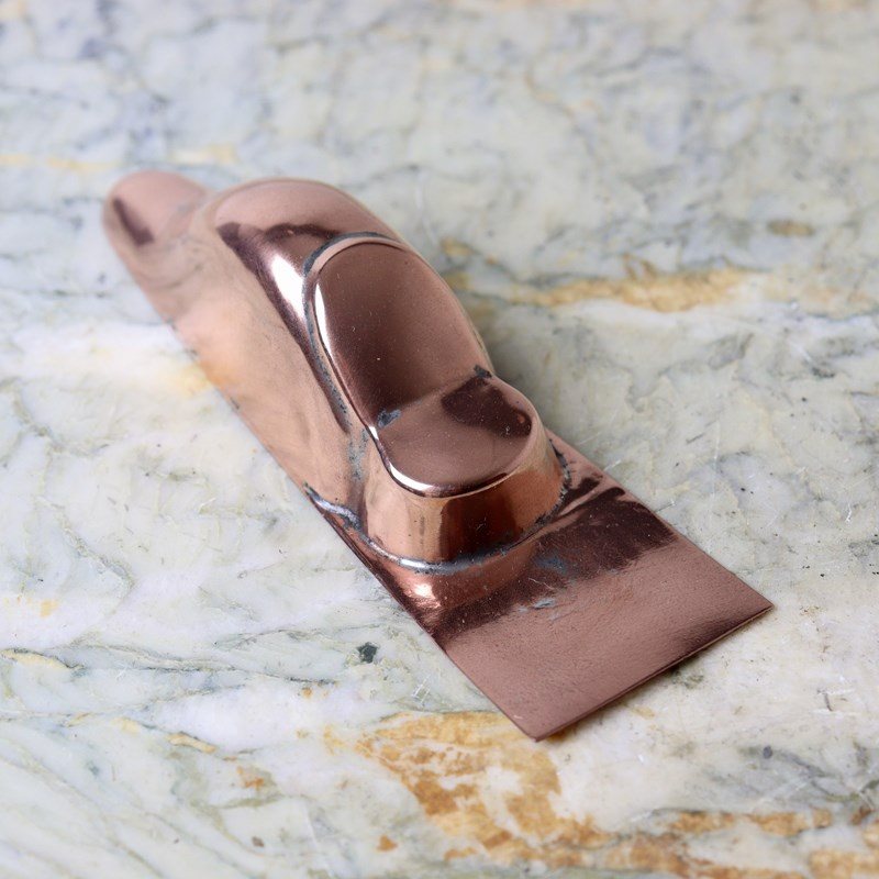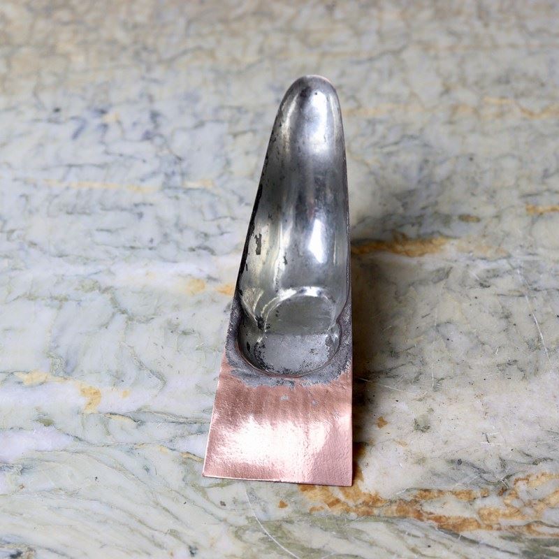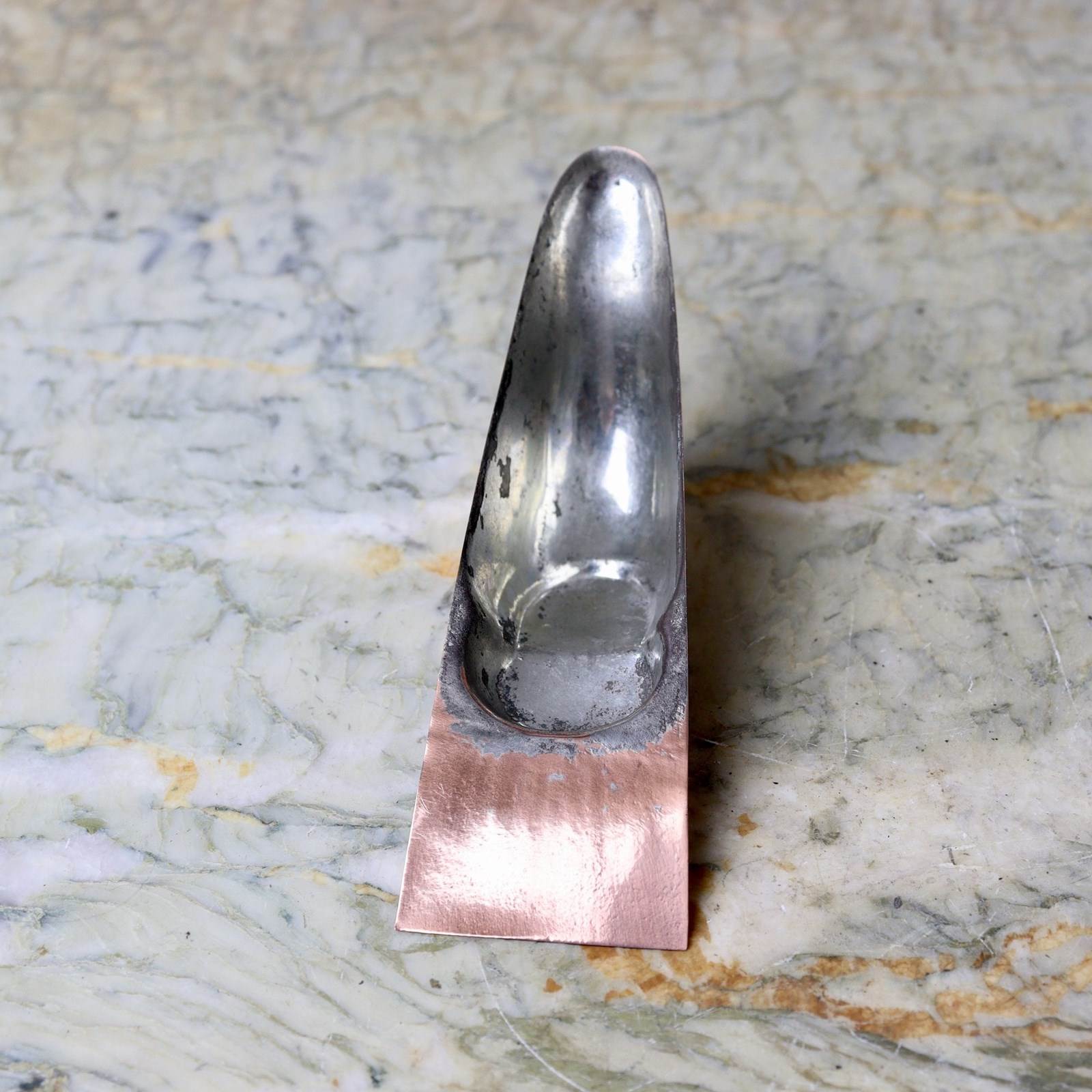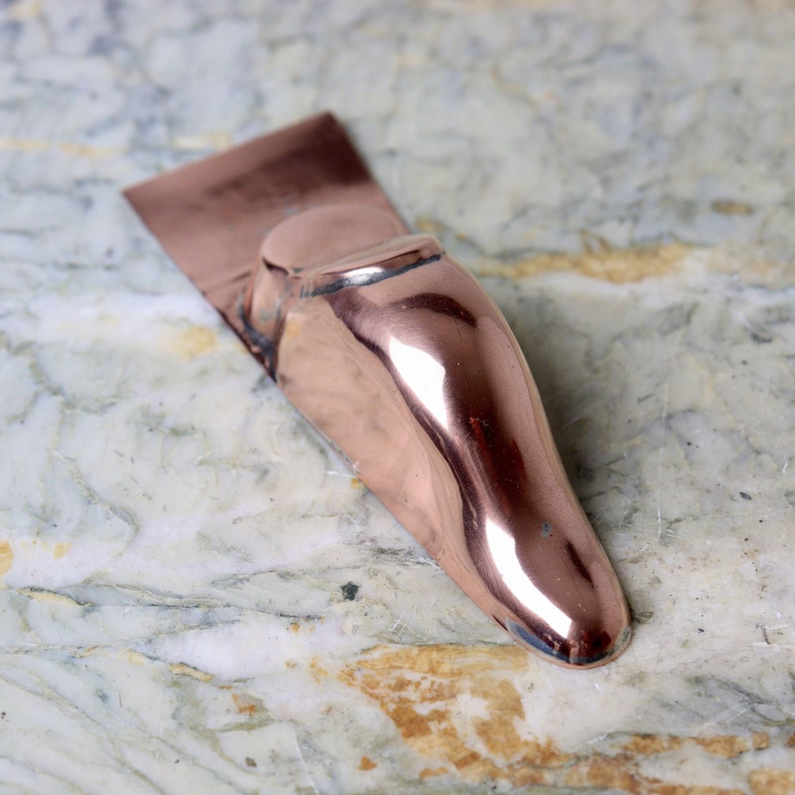 A miniature copper mould in the shape of a tongue. This is made from a light gauge of copper, it is English and it dates from c.1920. Originally it would have been tinned all over, but the tinning has been removed from the exterior, revealing the copper beneath. The mould is in excellent condition and the tinning, to the interior, is still in very good, bright, usable condition.