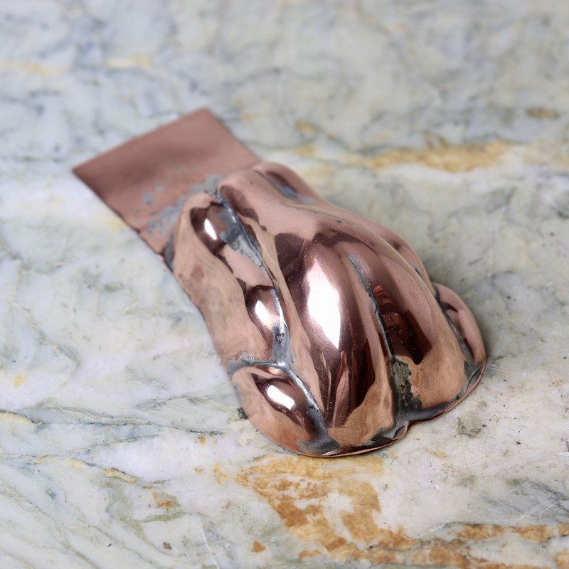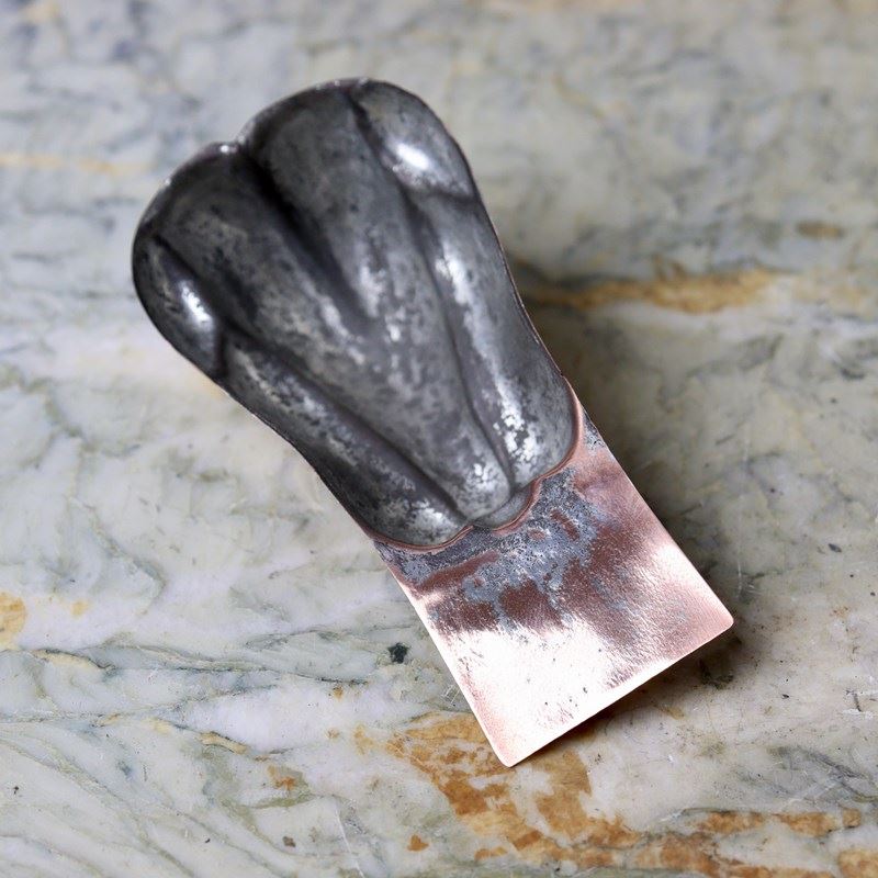 A miniature copper mould in the shape of a trussed chicken. This is made from a light gauge of copper, it is English and it dates from c.1920. Originally it would have been tinned all over, but the tinning has been removed from the exterior, revealing the copper beneath. The mould is in excellent condition and the tinning, to the interior, is still usable